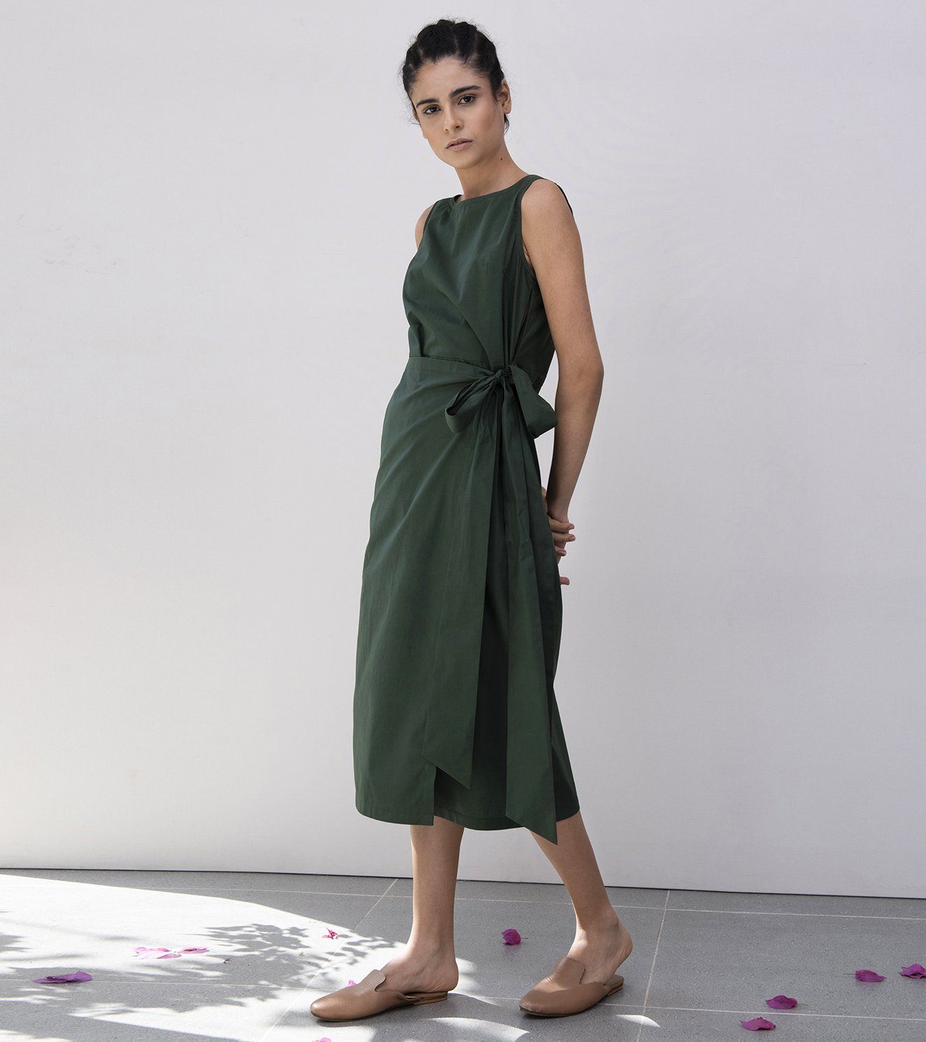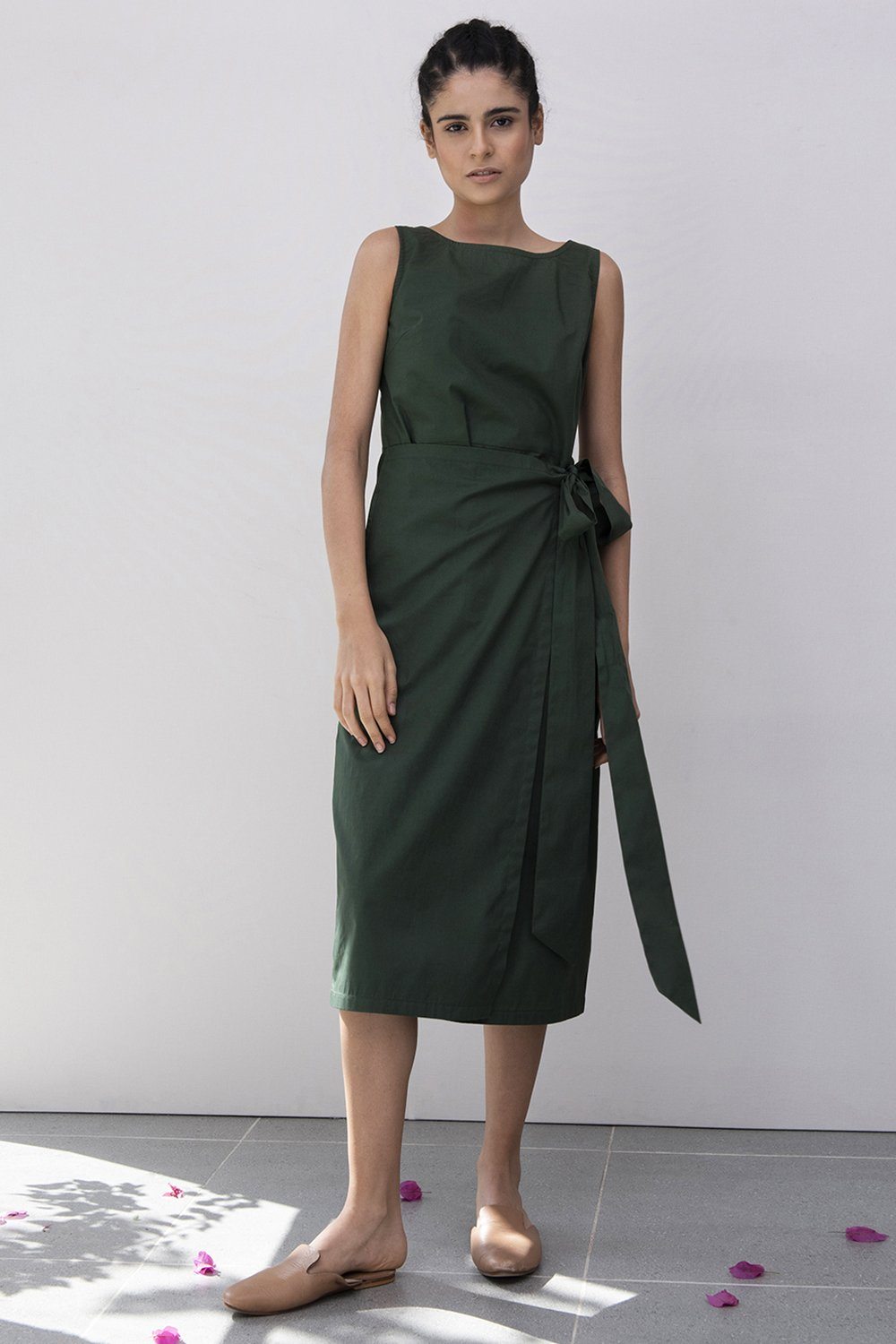 Dark green midi dress with a tie-up waist and side concealed zipper.