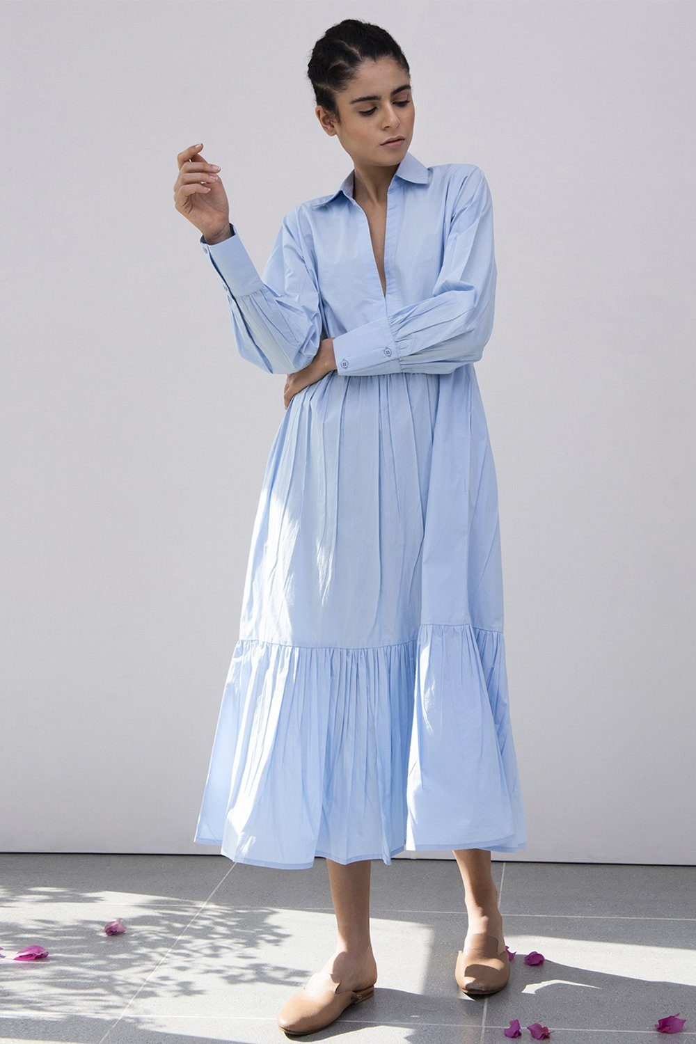 Blue collared long dress with delicately gathered tiers and cuffed sleeves.