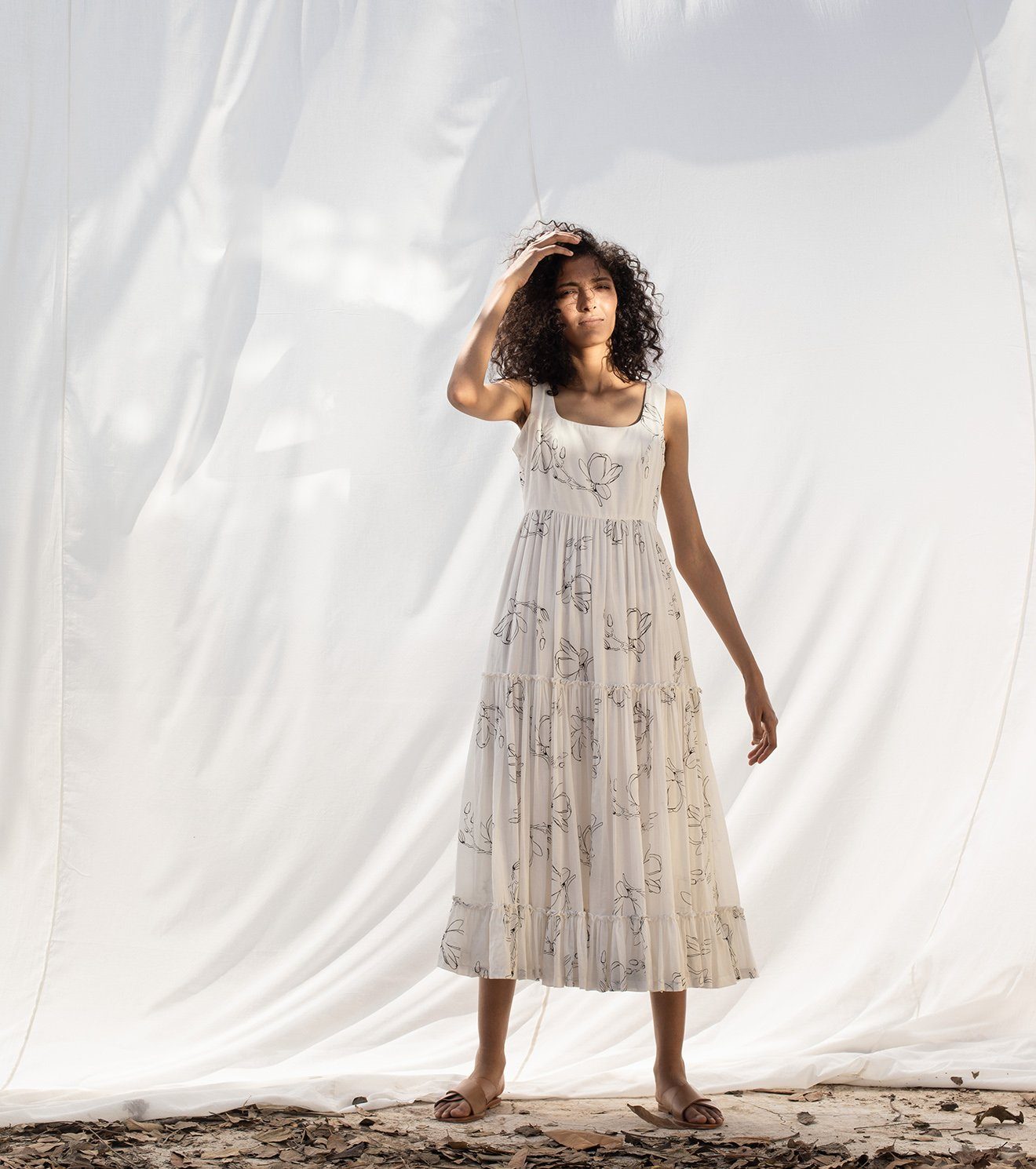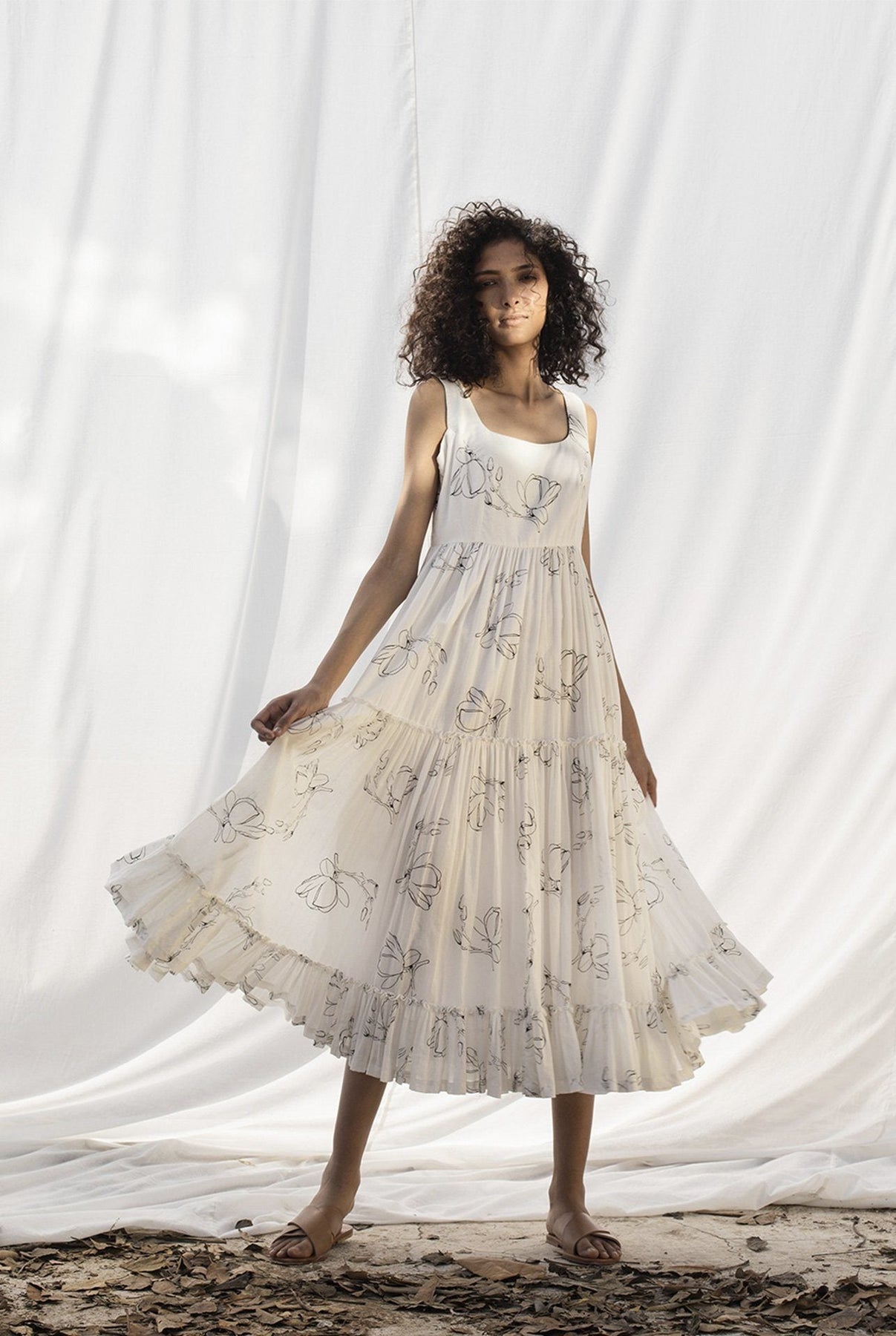 Ivory mulmul cotton sleeveless tiered tent midi dress with a round neckline and empire yoke. Handcrafted with an overall screen print of floral motifs.
