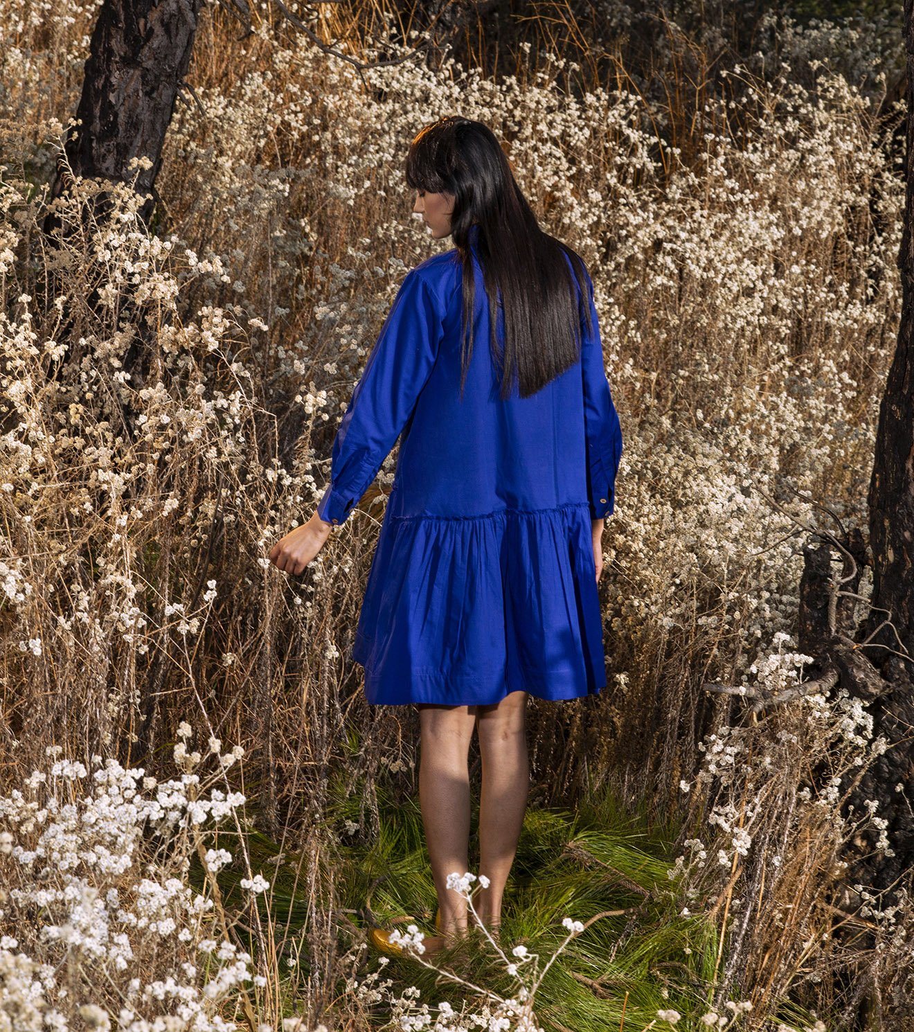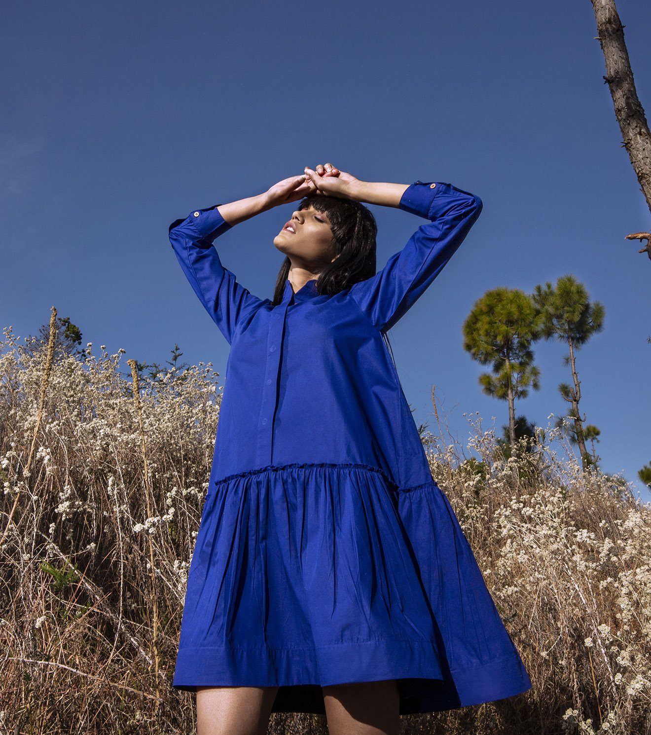 "Always looking for rainbows when it rains. Drop waist tent dress with an invisible placket, flounced bottom tier and full sleeves.