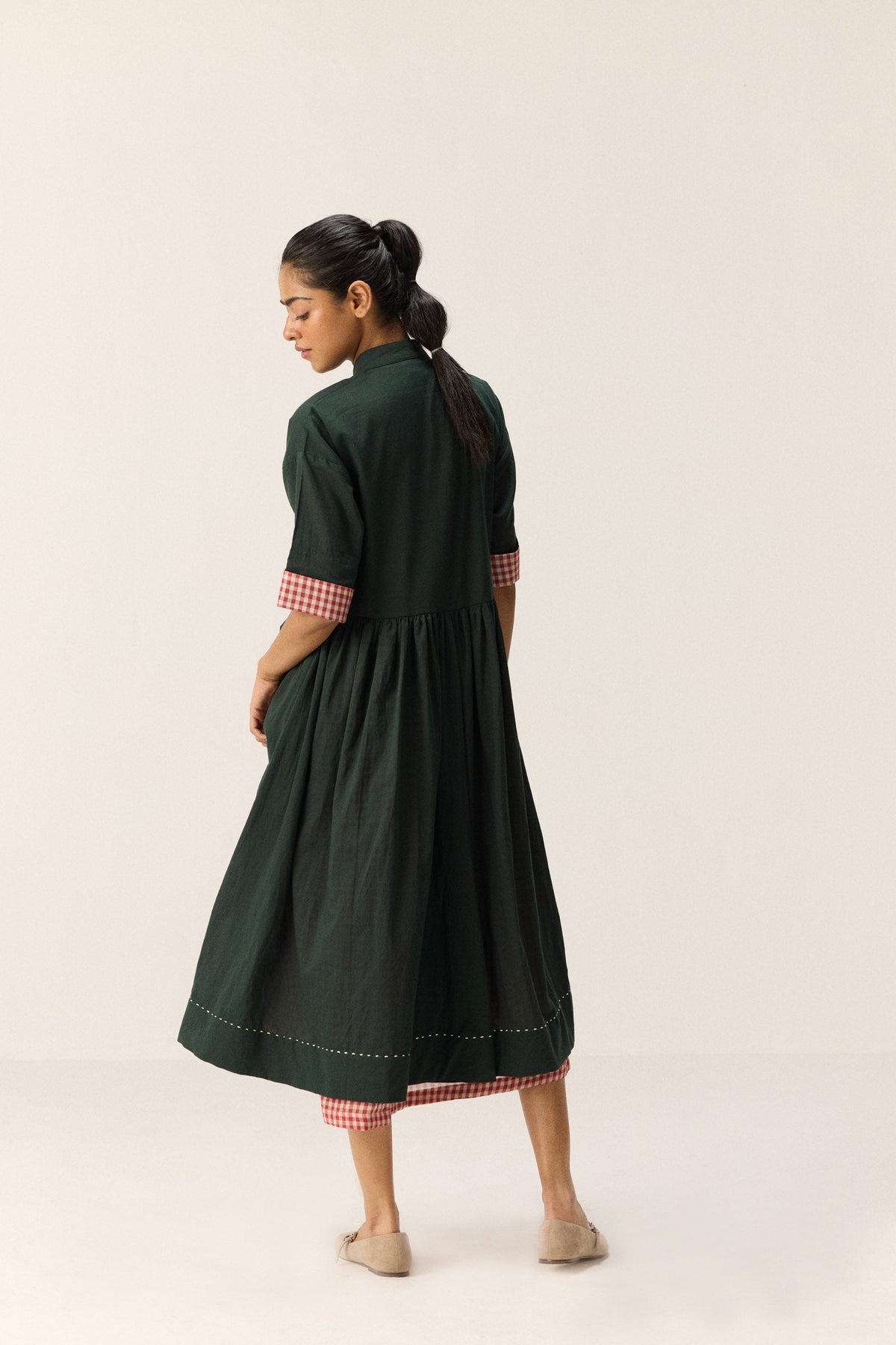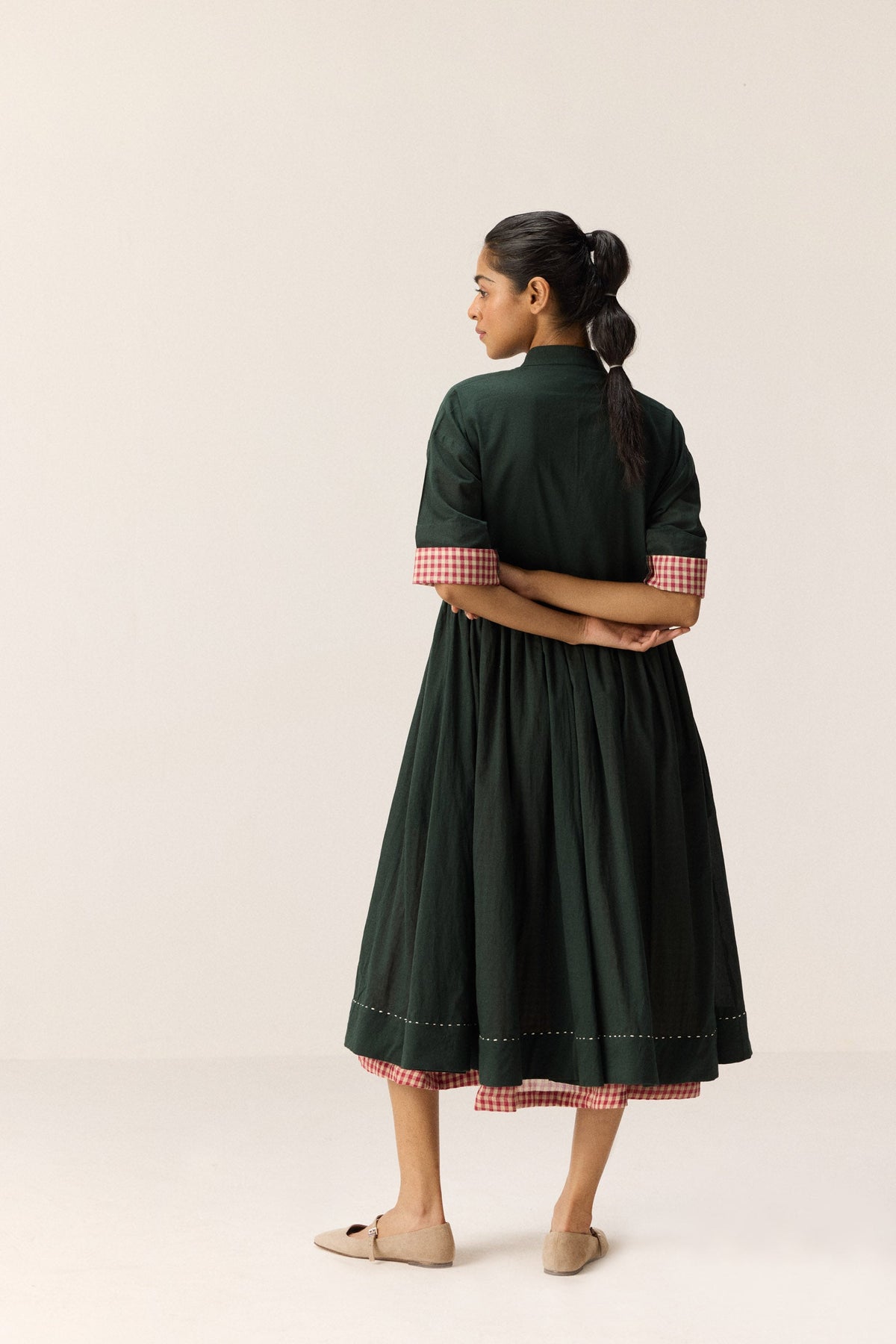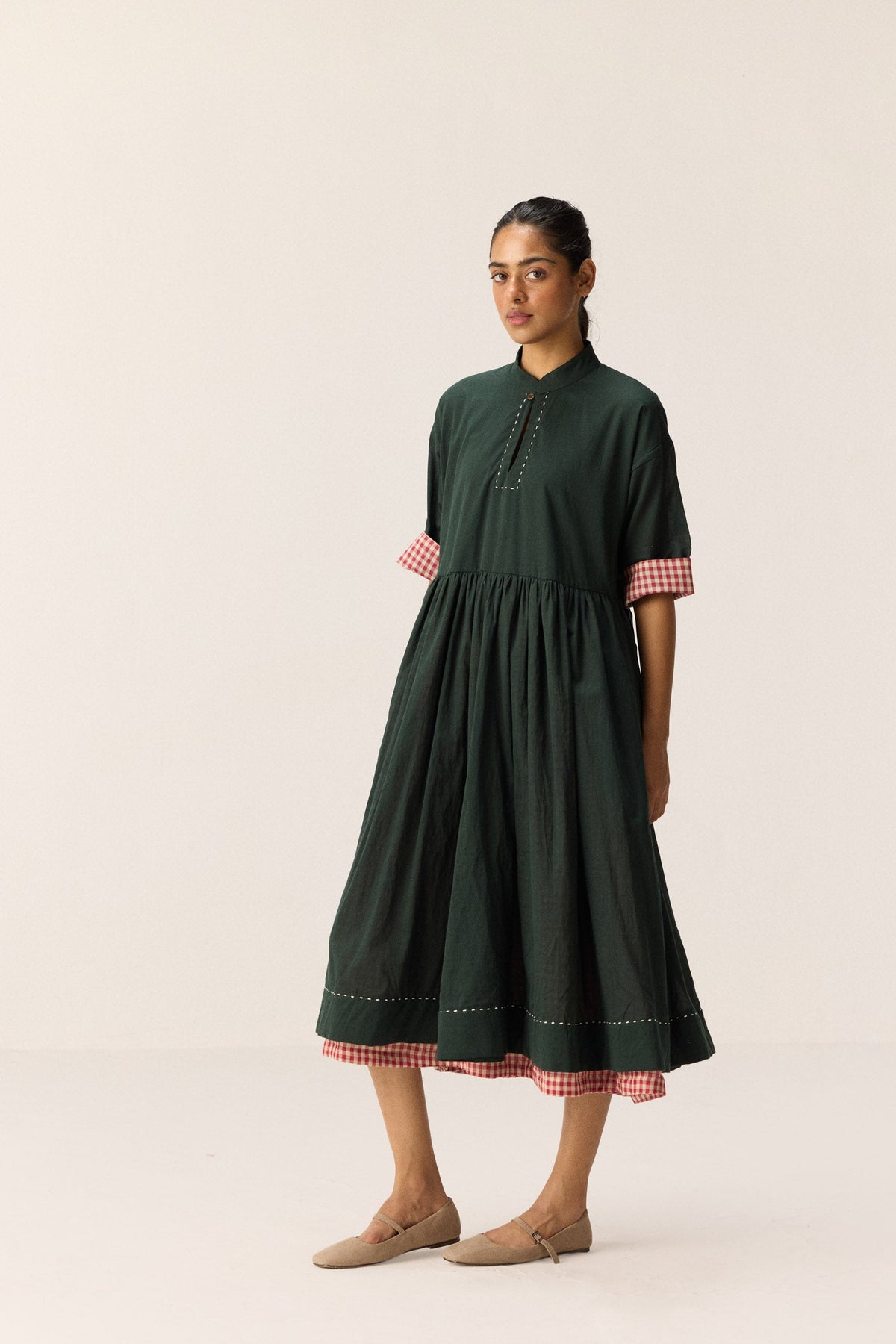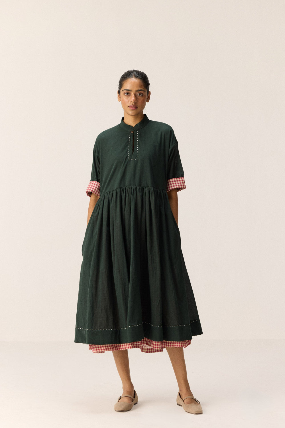 A dark green cotton mul dress featuring contrasting red and white printed mul along the sleeves and hem, creating a playful peekaboo effect. White running stitches highlight the neckline and bottom hem for added detail. Finished with side seam pockets for everyday ease.