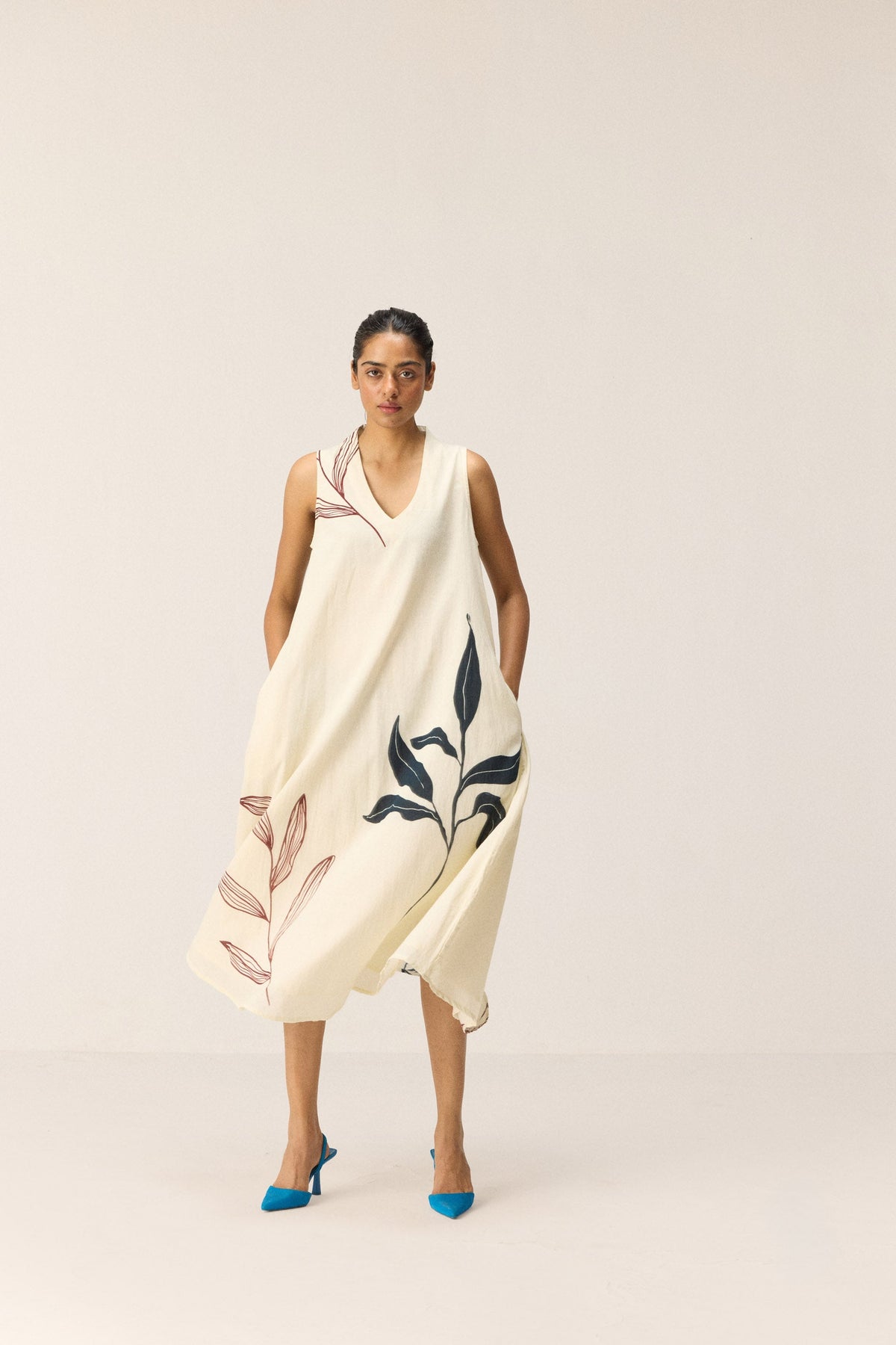 A classic Khara Kapas silhouette in soft white cotton mul, this sleeveless dress features a rounded V-neck and practical side pockets. The abstract black and red leaf print adds a bold, modern edge to its minimal form.