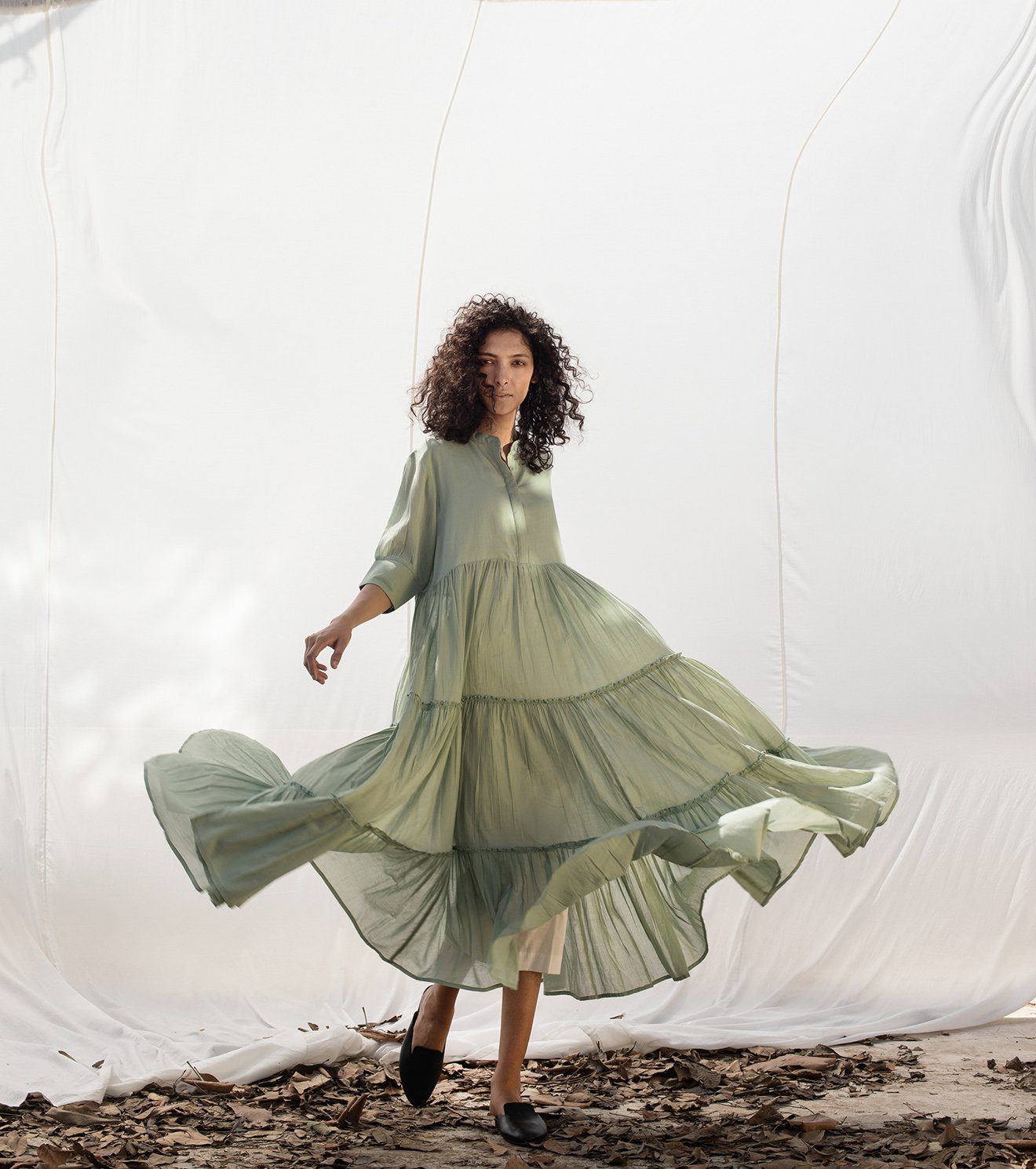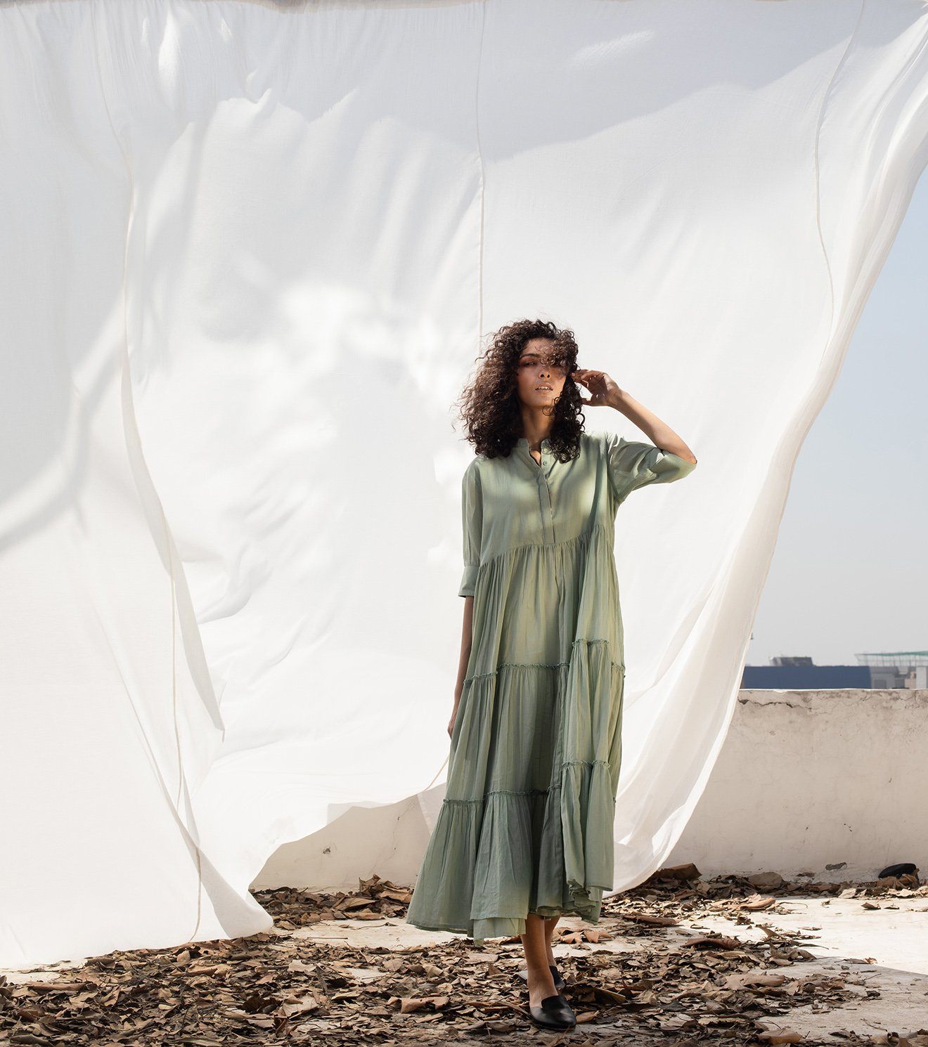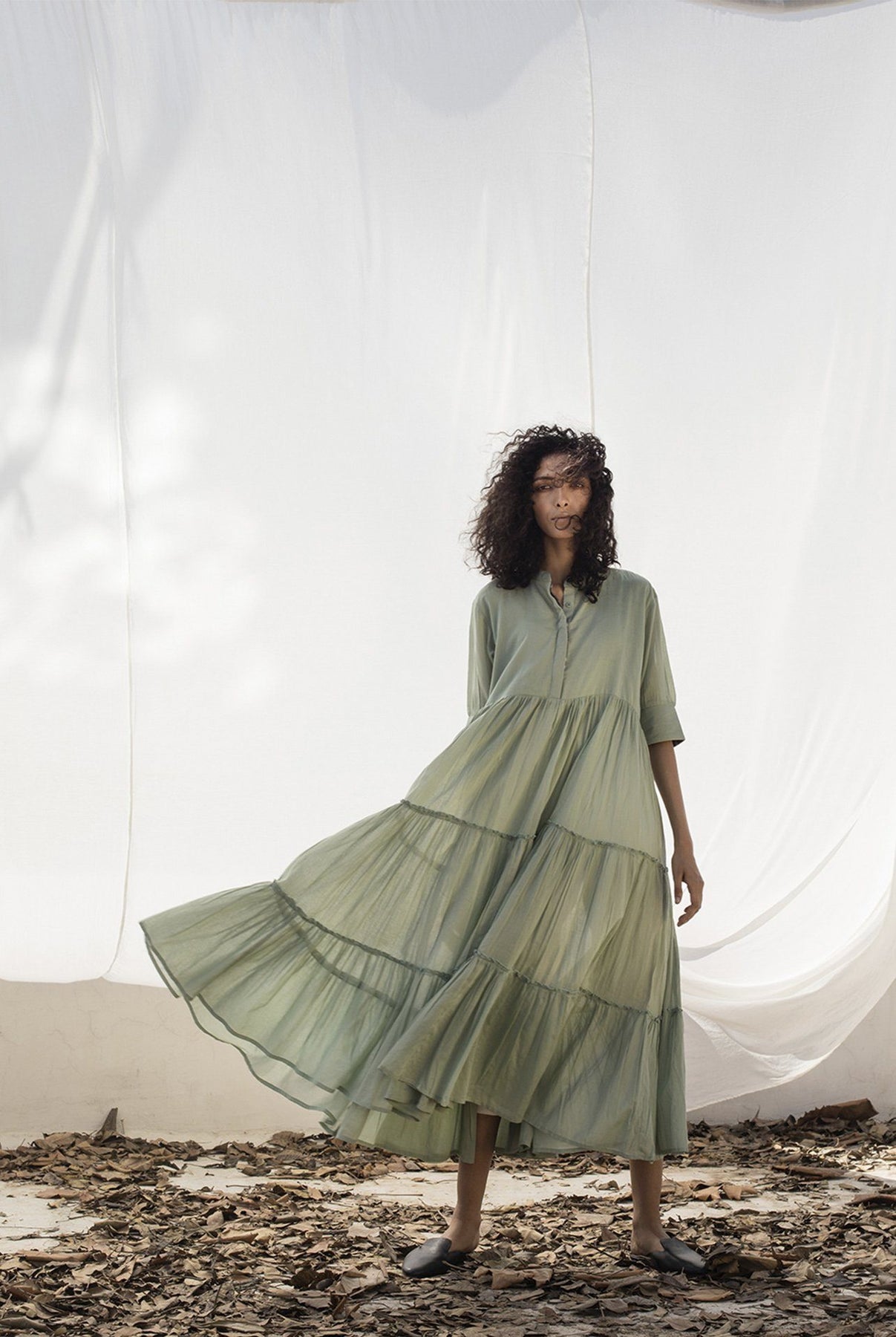 Sap mulmul tiered midi with a mandarin collar, invisible placket and three-fourth sleeves.