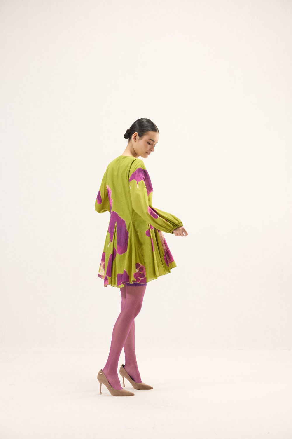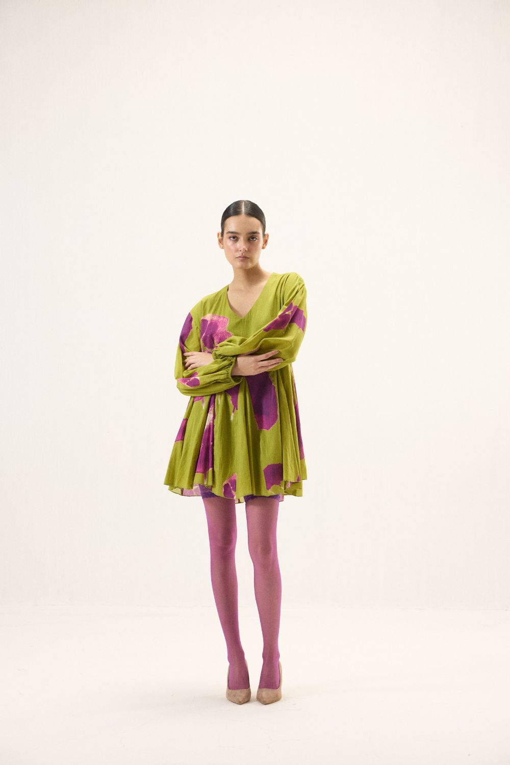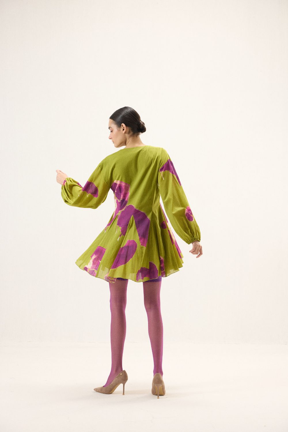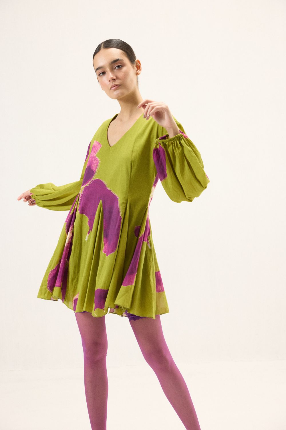 Crafted in airy cotton mul, this dress with bold painterly florals in vivid magenta on a lime base, moves with an effortless grace. Designed with a soft V neckline and full-length puff sleeves finished with gentle elasticated cuffs, it balances volume with ease. Godet panels at the hem create fluid flares that sway beautifully with every step, lending the silhouette a light, flowing charm, perfect for days that call for quiet elegance and comfort.