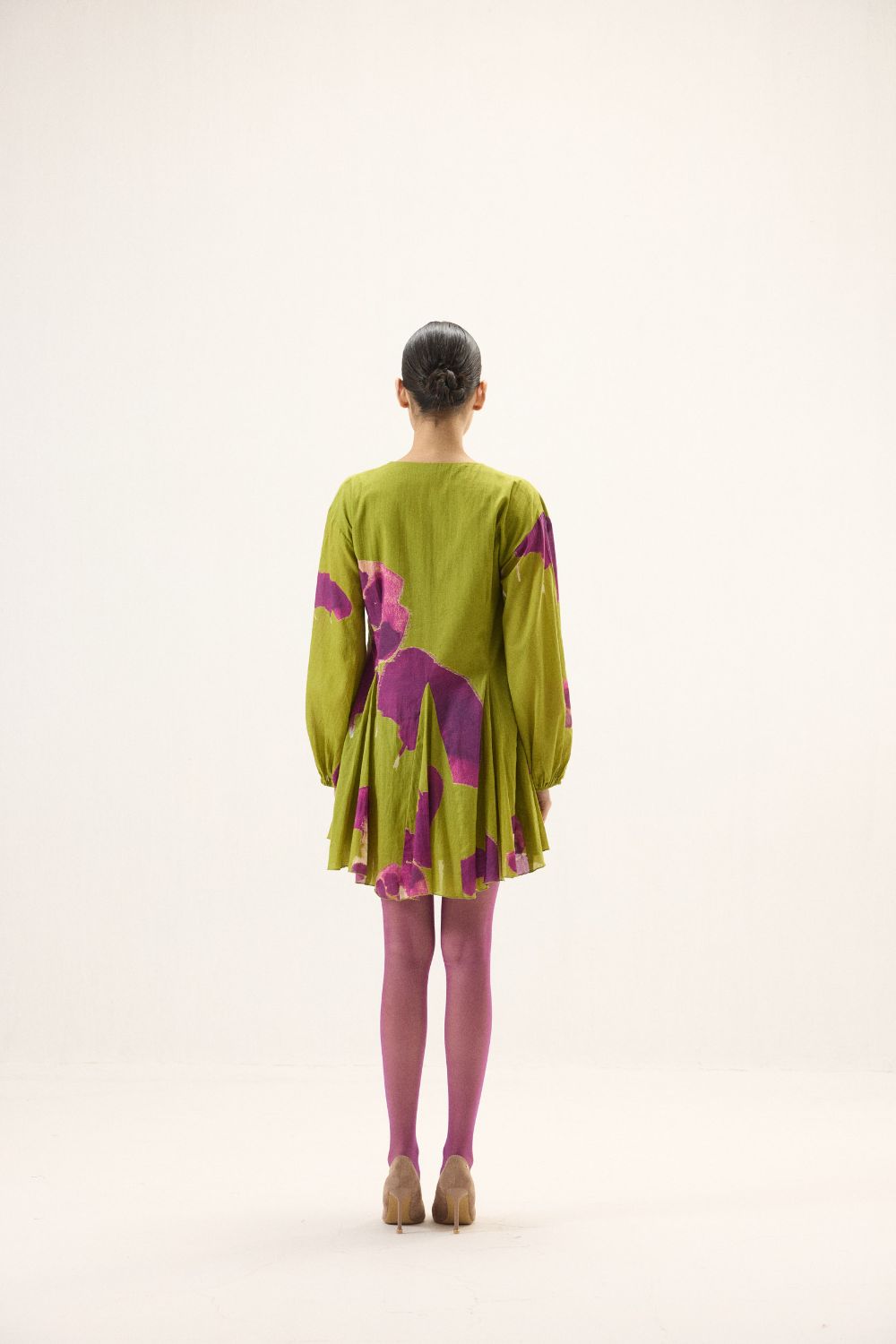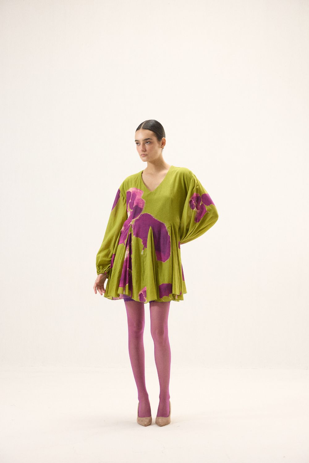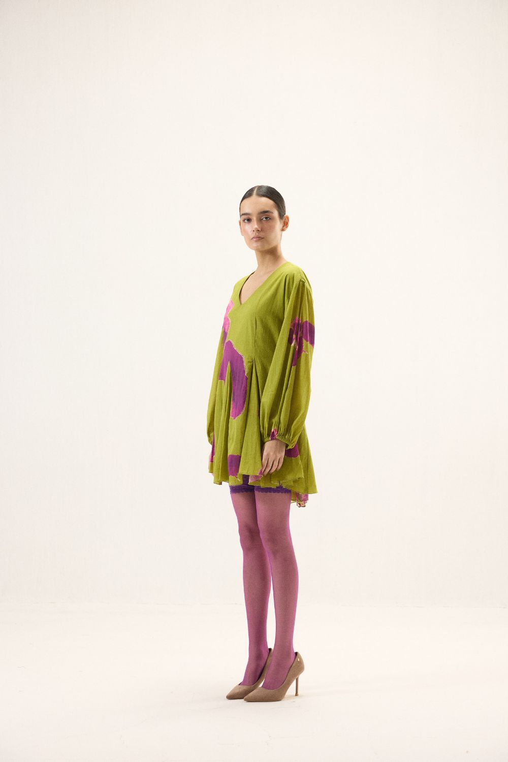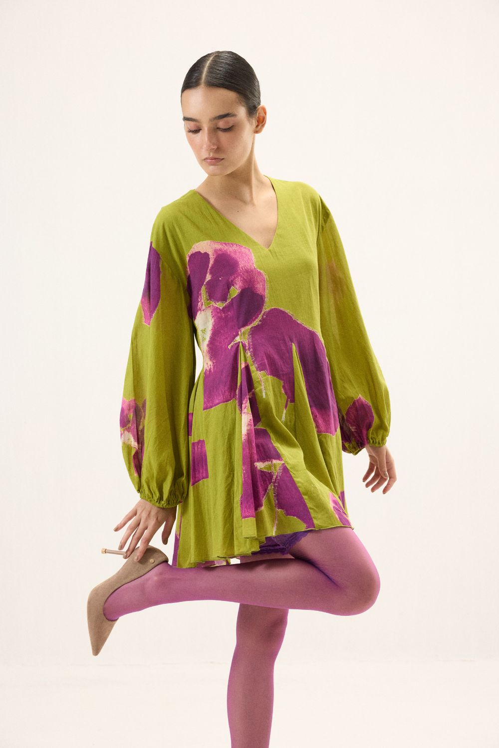 Crafted in airy cotton mul, this dress with bold painterly florals in vivid magenta on a lime base, moves with an effortless grace. Designed with a soft V neckline and full-length puff sleeves finished with gentle elasticated cuffs, it balances volume with ease. Godet panels at the hem create fluid flares that sway beautifully with every step, lending the silhouette a light, flowing charm, perfect for days that call for quiet elegance and comfort.