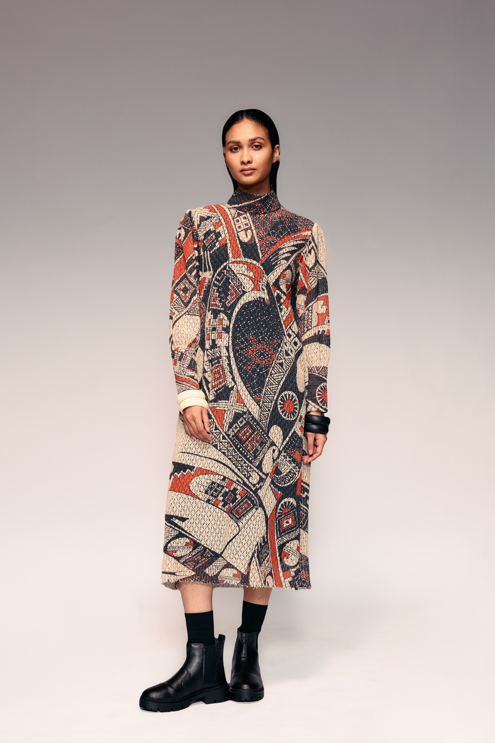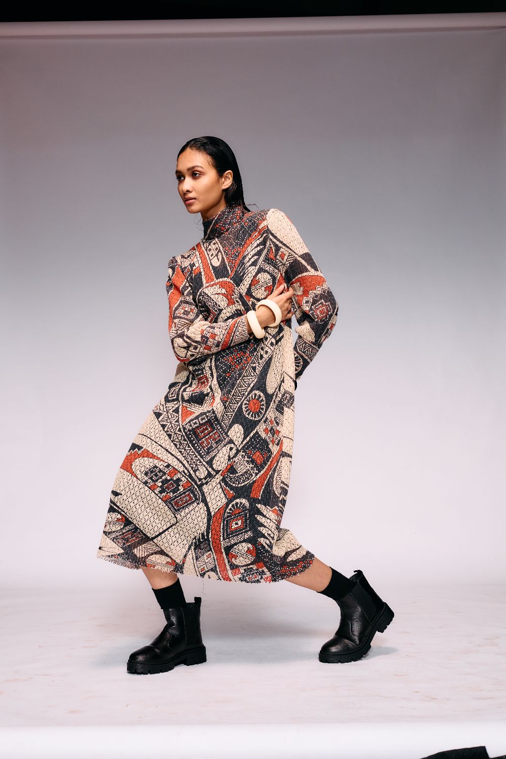 Crafted in soft cotton-net fabric, this Rust Print Midi blends comfort with artisanal elegance. The silhouette flows effortlessly with a relaxed fit and mid- length finish, ideal for classy and chic wear. Inspired by Mata Ortiz pottery motifs, its rust and black tones evoke earthy sophistication. Tailored with fine stitching and careful lining, it offers breathability and luxury in equal measure. Pair it with tan sandals or minimal heels for brunches, travel, or summer gatherings. Perfect for day-to-evening transitions with effortless charm.