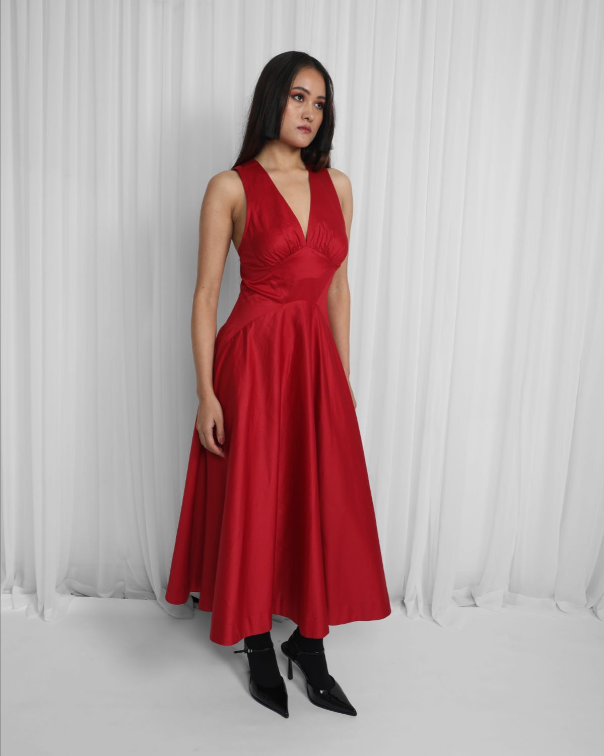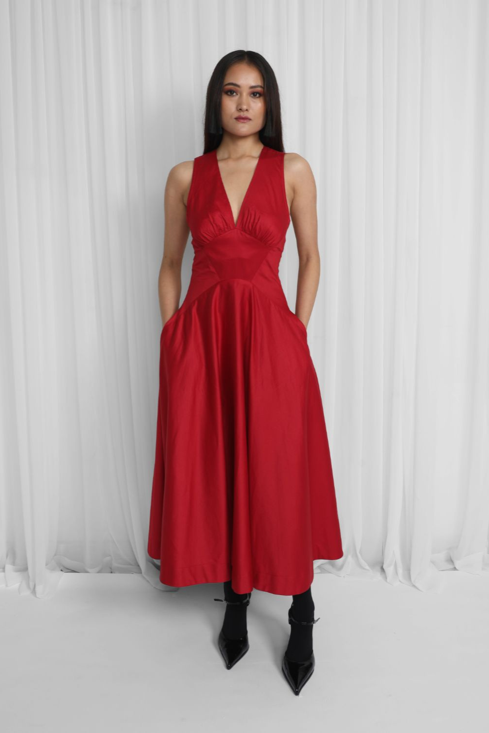 Fitted at waist and circular at bottom this dress is made of 100% cotton fabric featuring a deep V and fitted waist to create a sensuous silhouette, while strap detailing at back adds a sexy playfulness. With its seam details at bodice and curved waistline, it makes an assured statement. Model height is 5'8" Model wear size S garment length is 50"
