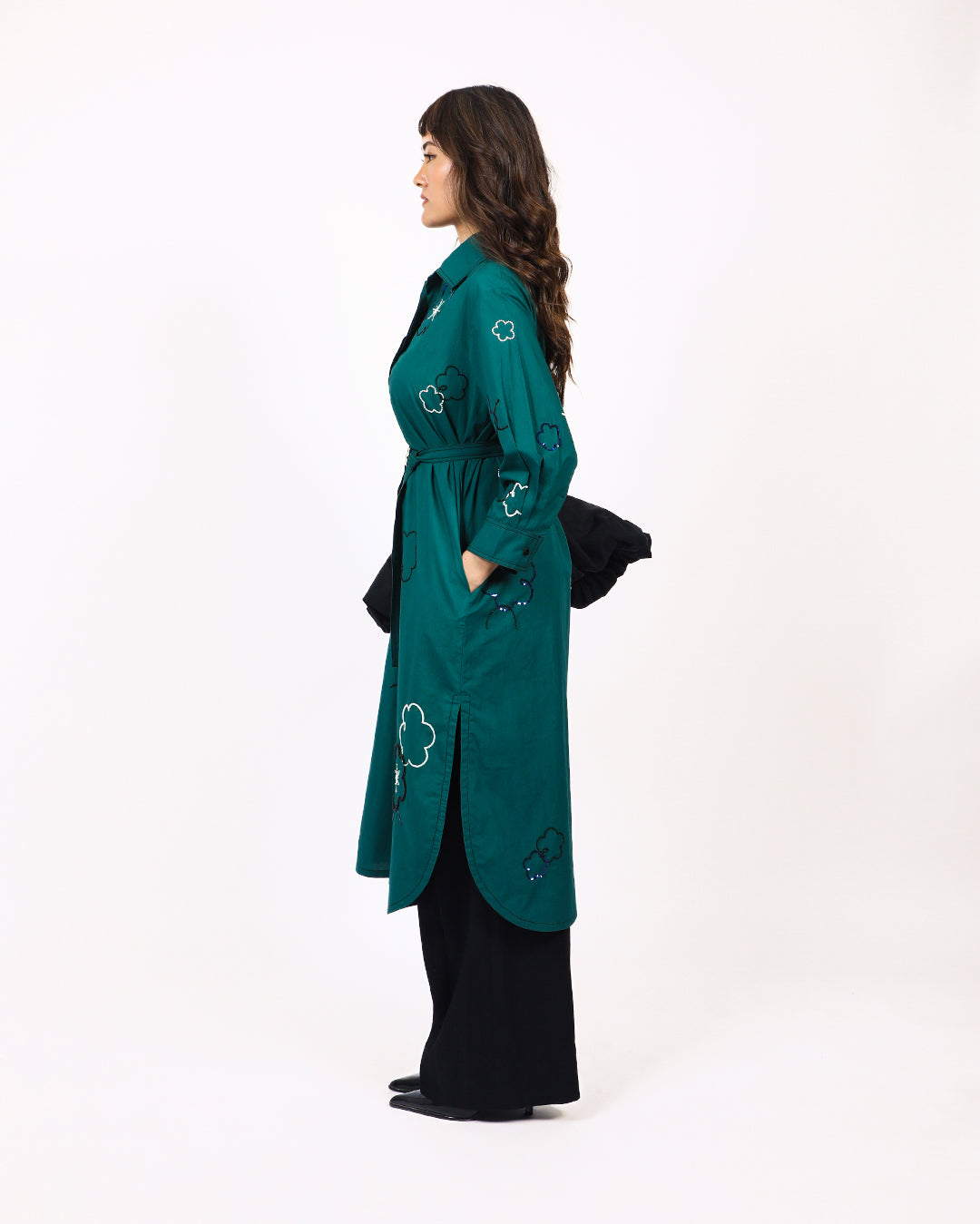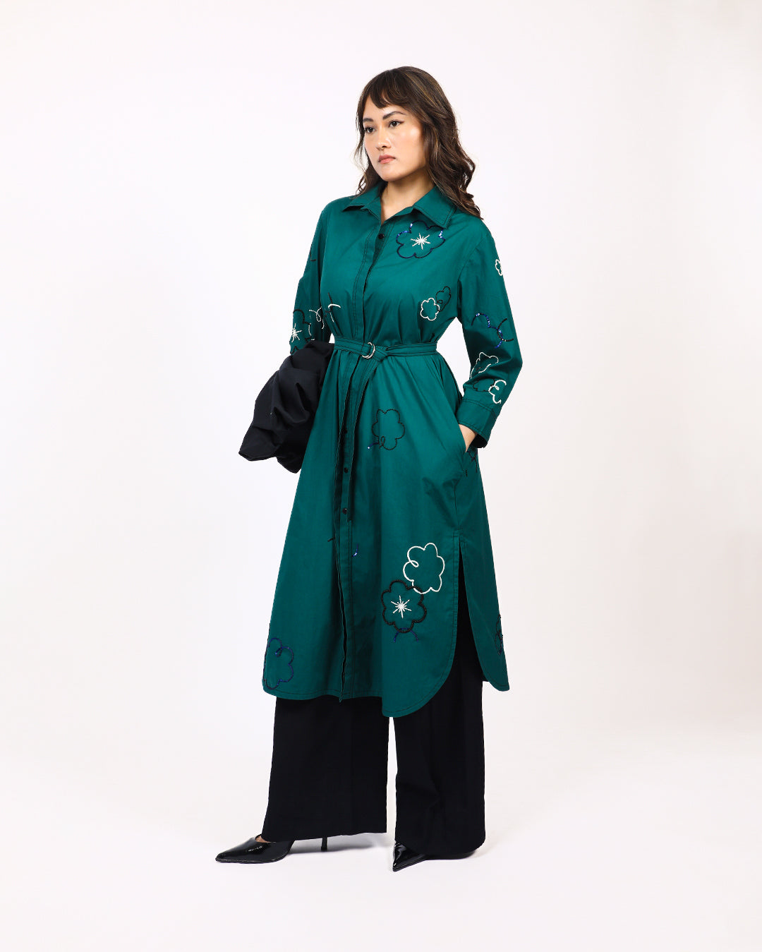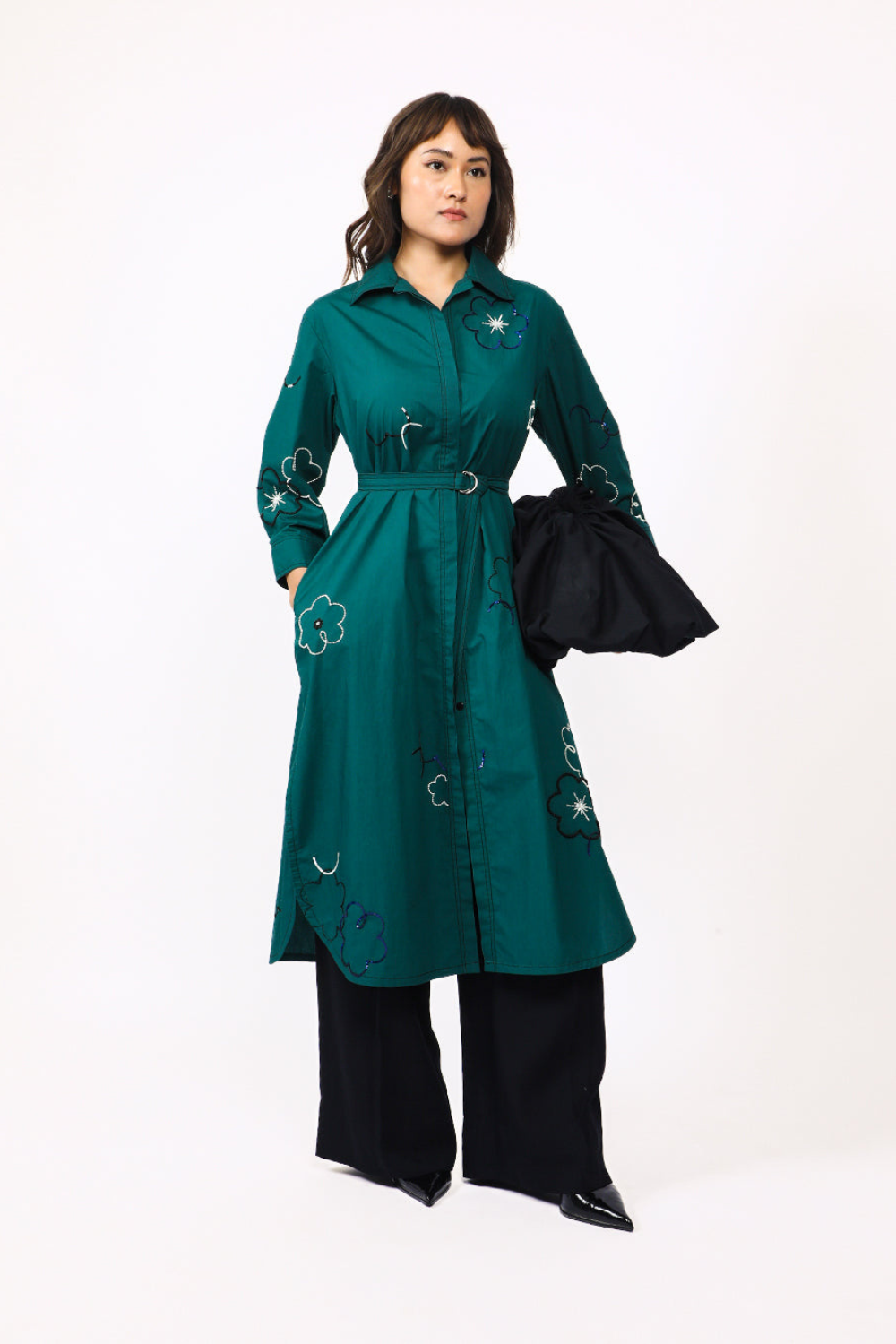 This shirt dress features delicate floral embellishments made from beads and sequins, adding a touch of sparkle and texture to the design. The dress has a side slit with curved hemline offering a soft, flattering silhouette. A full frontal placket opening runs the length of the dress, allowing for adjustable styling. It is paired with a detachable belt that cinches the waist, accentuating the figure. Model wear size S model height is 5'8 garment length is 48"