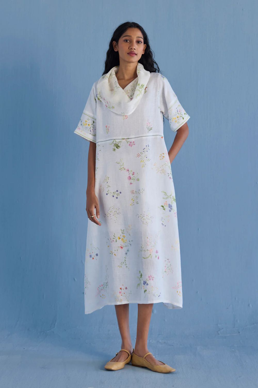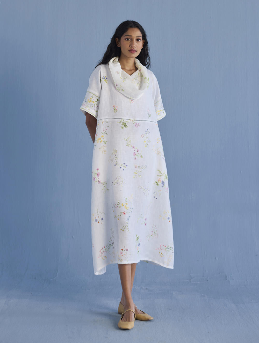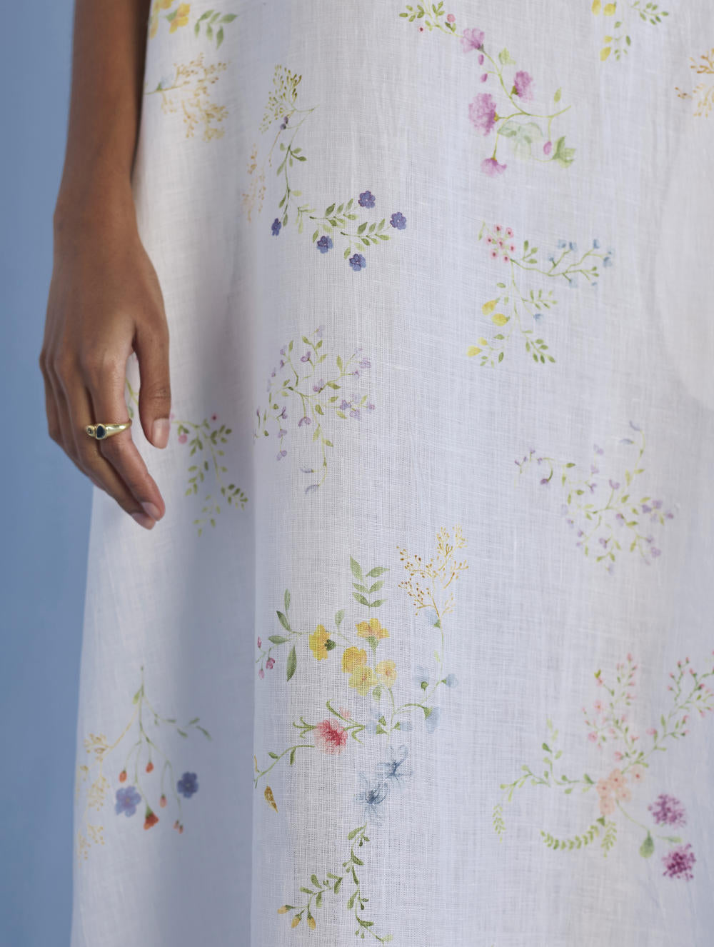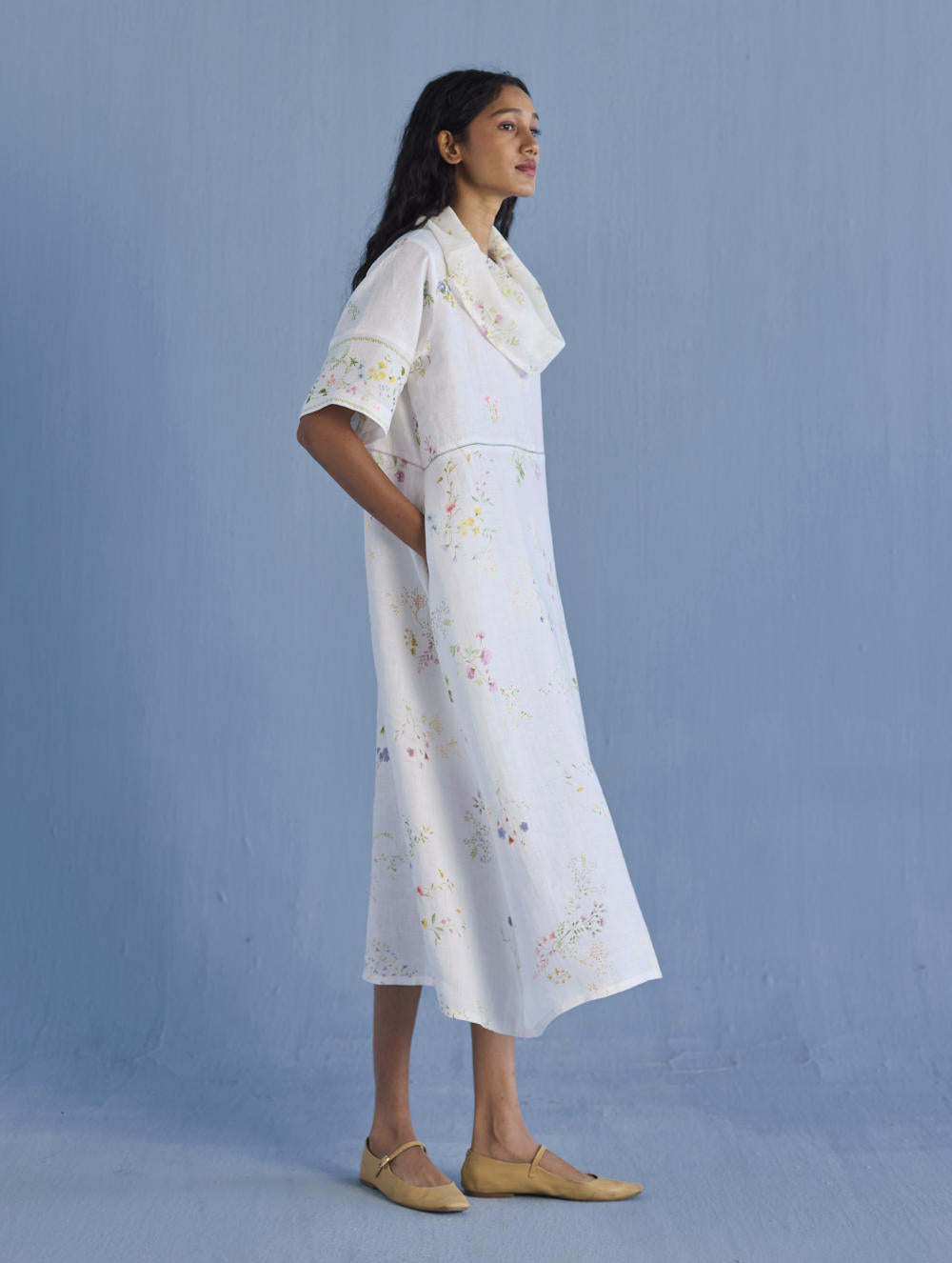 One of our timeless favourites - the cowl neck midi dress handcrafted in our soft yarn-dyed linen with cowl neck in printed soft sheer linen. The dress is designed in two hand-painted floral prints - a jaal floral print and a buta (motif) floral print. Accented with pop coloured fagotting stitch detailing in the front and back and finished with a printed border detail on the sleeves and pockets.