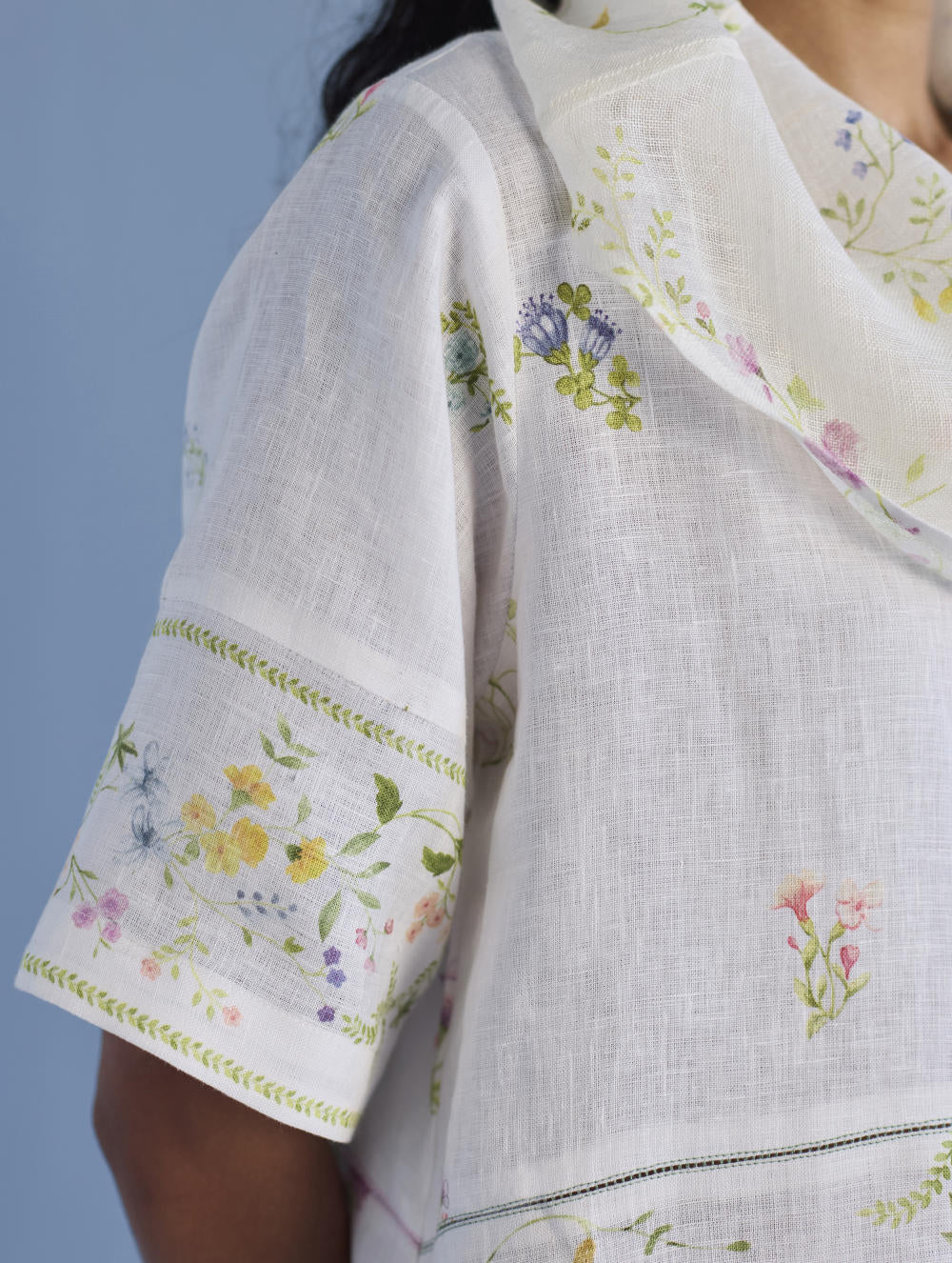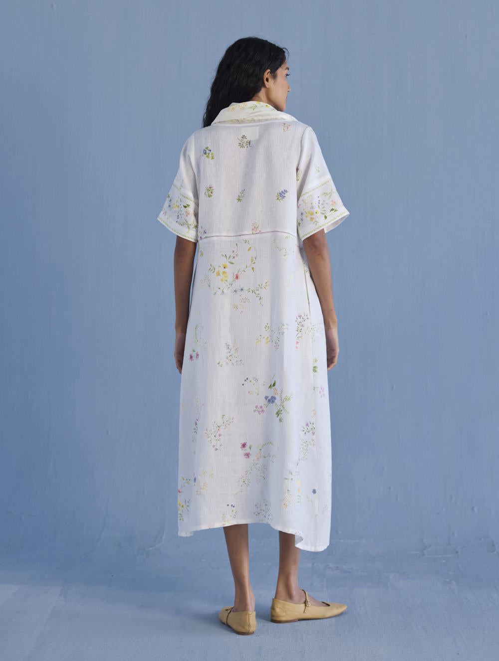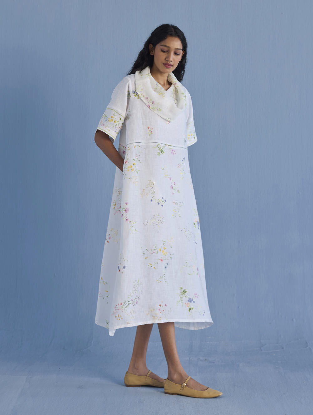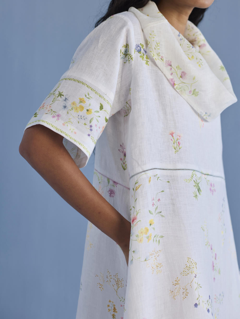 One of our timeless favourites - the cowl neck midi dress handcrafted in our soft yarn-dyed linen with cowl neck in printed soft sheer linen. The dress is designed in two hand-painted floral prints - a jaal floral print and a buta (motif) floral print. Accented with pop coloured fagotting stitch detailing in the front and back and finished with a printed border detail on the sleeves and pockets.