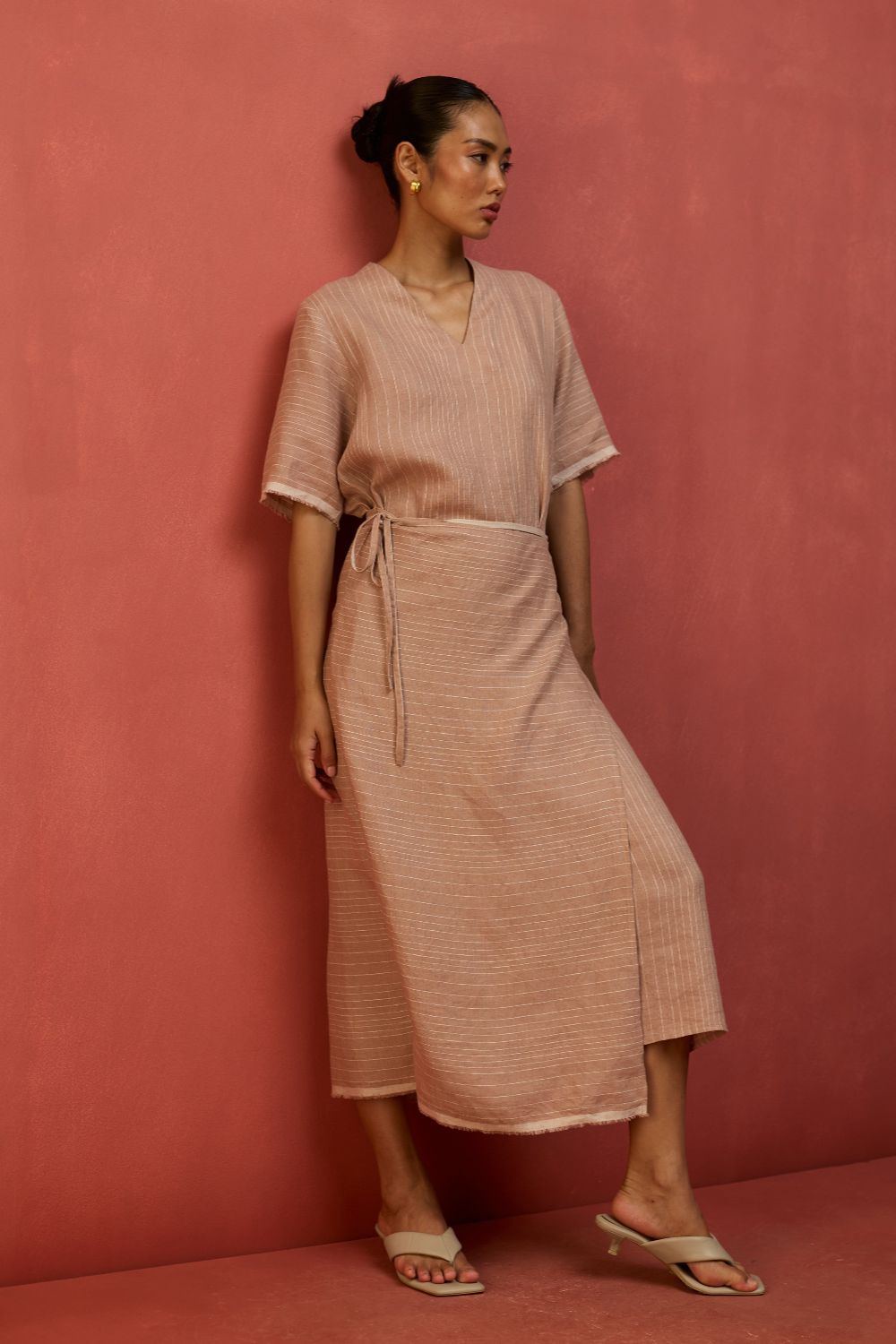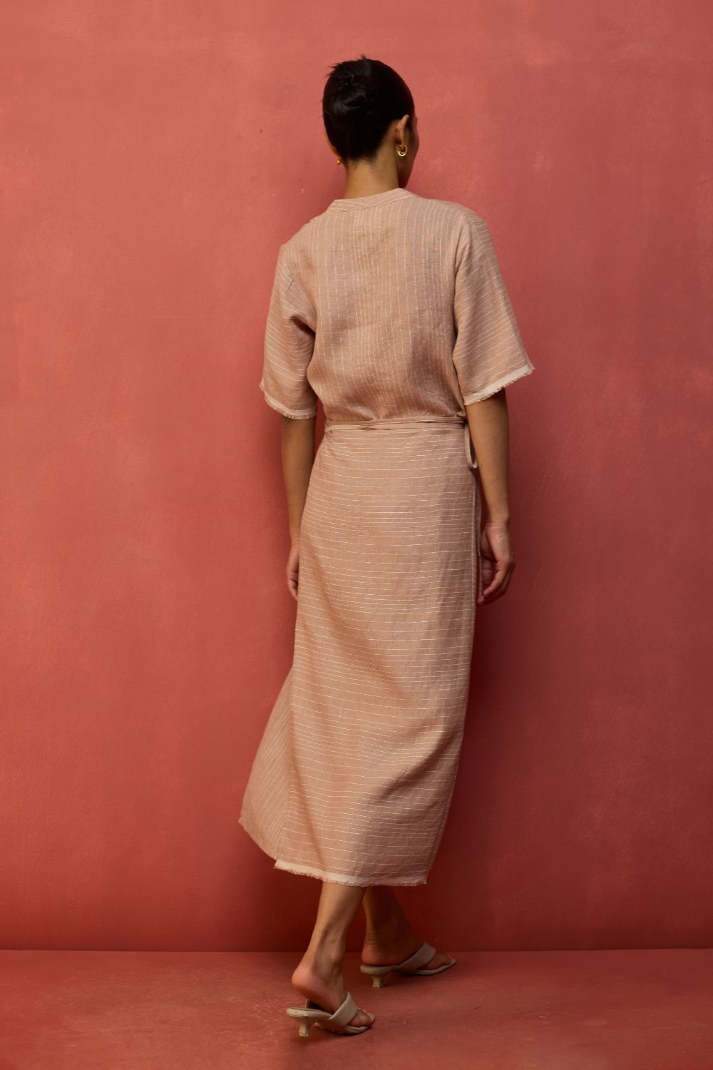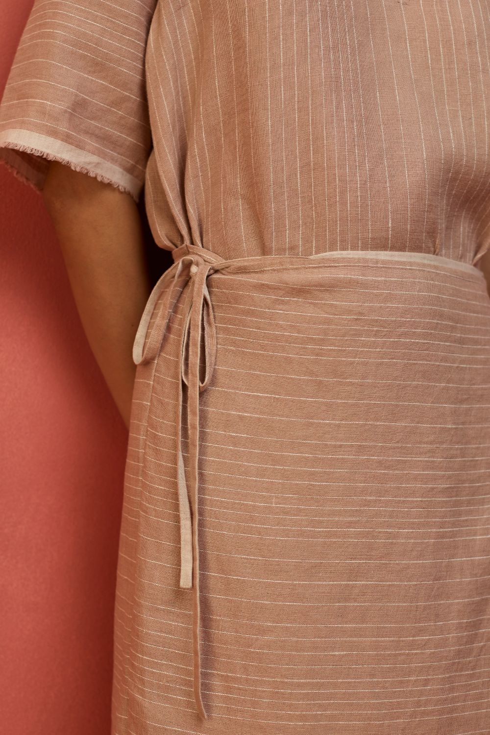 A statement wrap dress thoughtfully crafted for a timeless appeal in a breathable and lightweight stripe yarn-dyed linen. The design features an A line half-sleeve dress with an all-around wrap skirt silhouette with a back-slit for easy movement. The dress has elbow-length wide sleeves and is accented with frayed woven selvedge details along the sleeve and hemline. Karo can be worn relaxed or fitted as per the occasion and personal styling preferences.