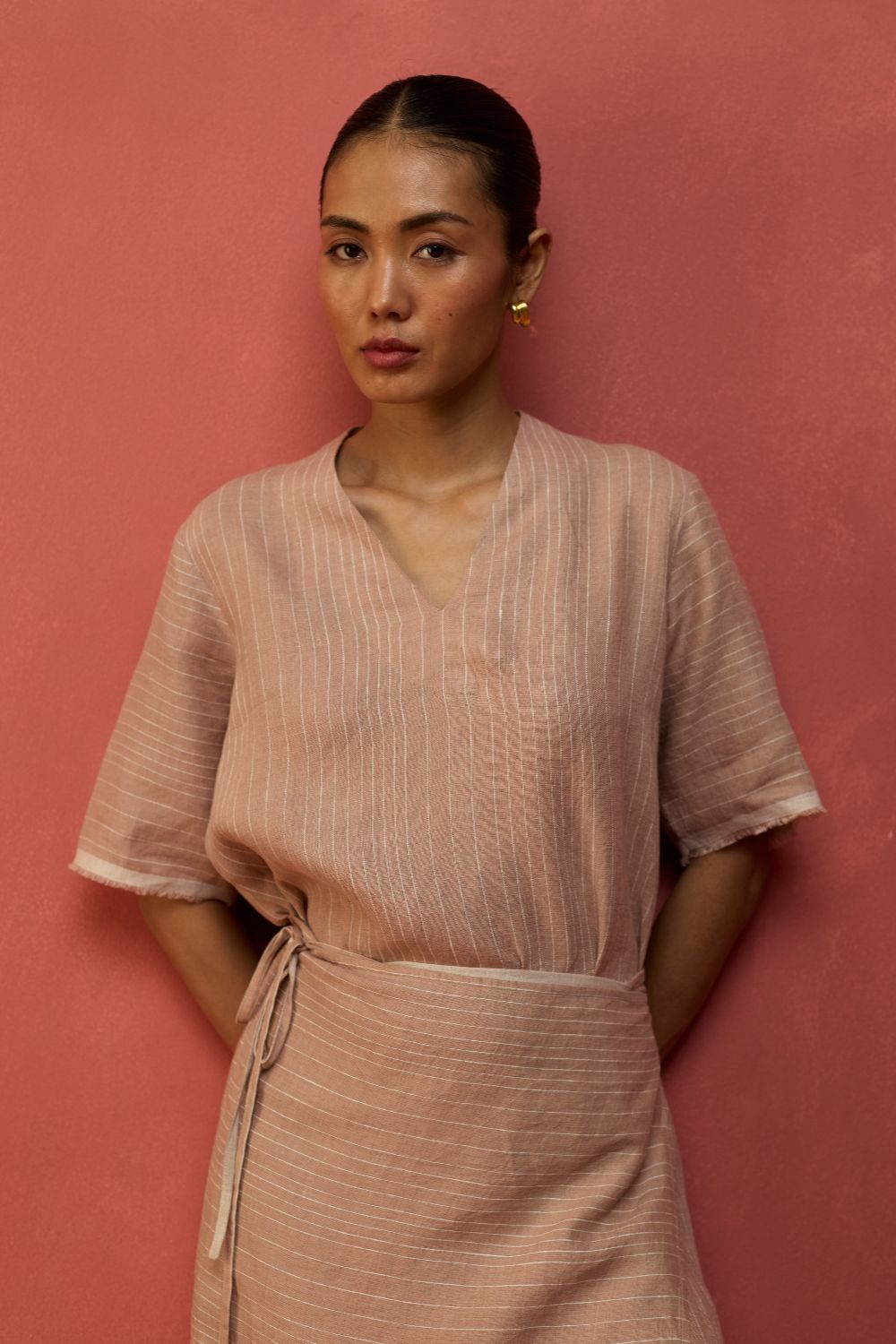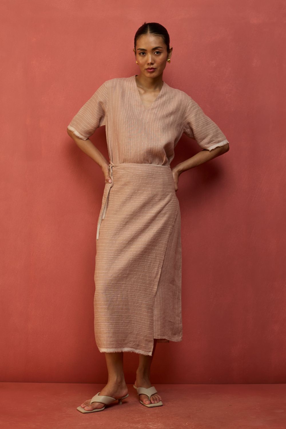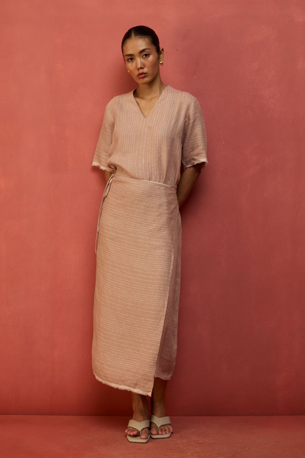 A statement wrap dress thoughtfully crafted for a timeless appeal in a breathable and lightweight stripe yarn-dyed linen. The design features an A line half-sleeve dress with an all-around wrap skirt silhouette with a back-slit for easy movement. The dress has elbow-length wide sleeves and is accented with frayed woven selvedge details along the sleeve and hemline. Karo can be worn relaxed or fitted as per the occasion and personal styling preferences.