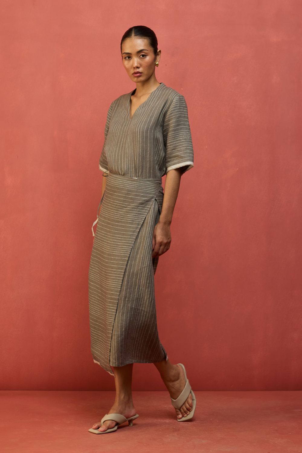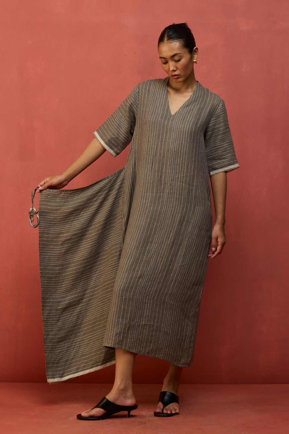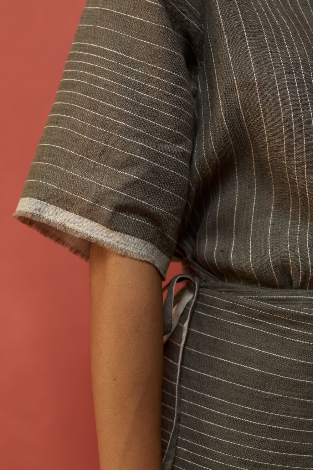 A statement wrap dress thoughtfully crafted for a timeless appeal in a breathable and lightweight stripe yarn-dyed linen. The design features an A line half-sleeve dress with an all-around wrap skirt silhouette with a back-slit for easy movement. The dress has elbow-length wide sleeves and is accented with frayed woven selvedge details along the sleeve and hemline. Karo can be worn relaxed or fitted as per the occasion and personal styling preferences.