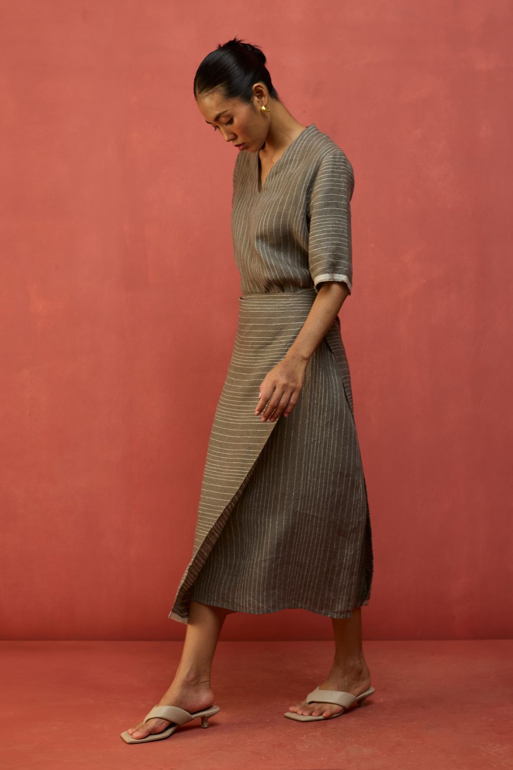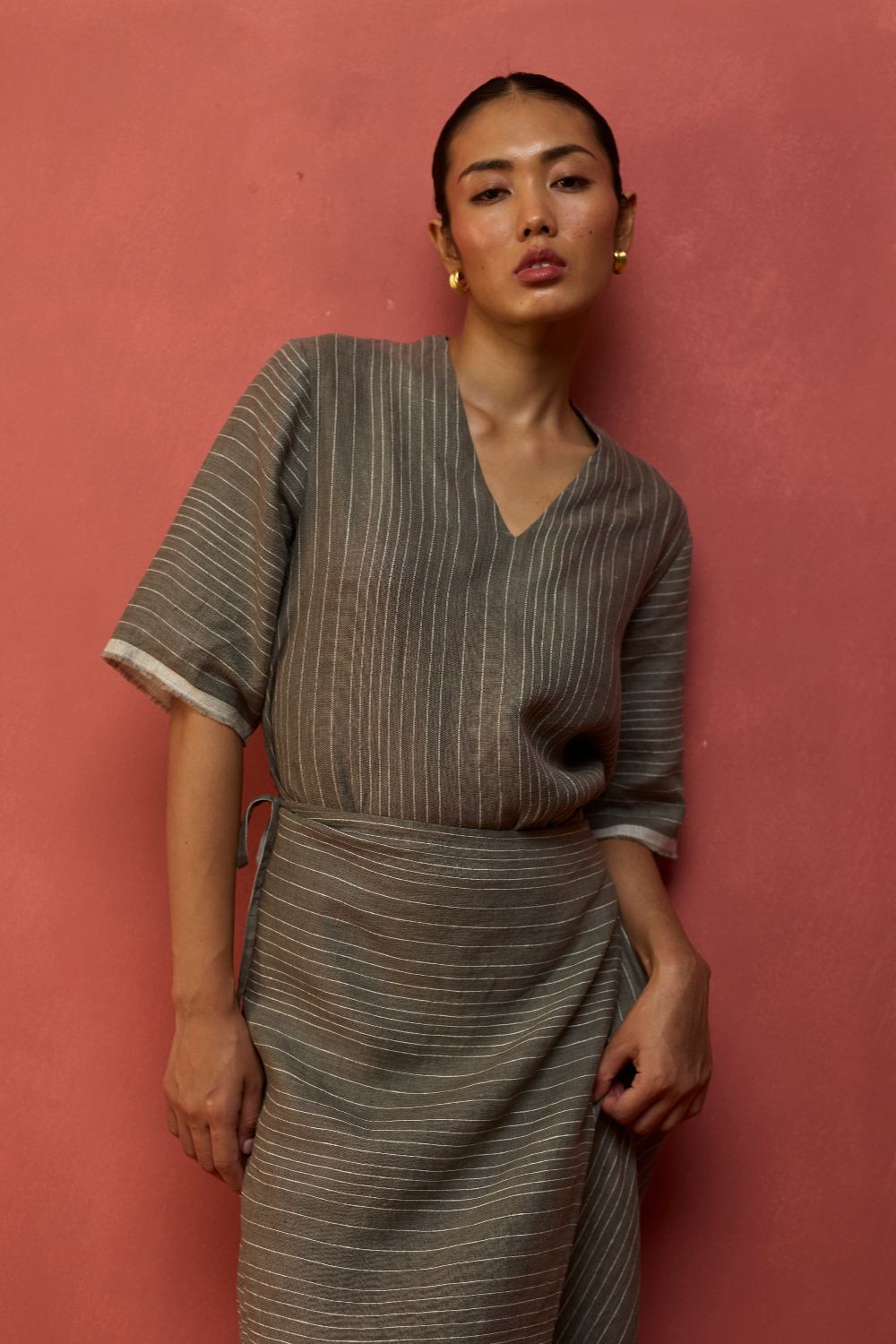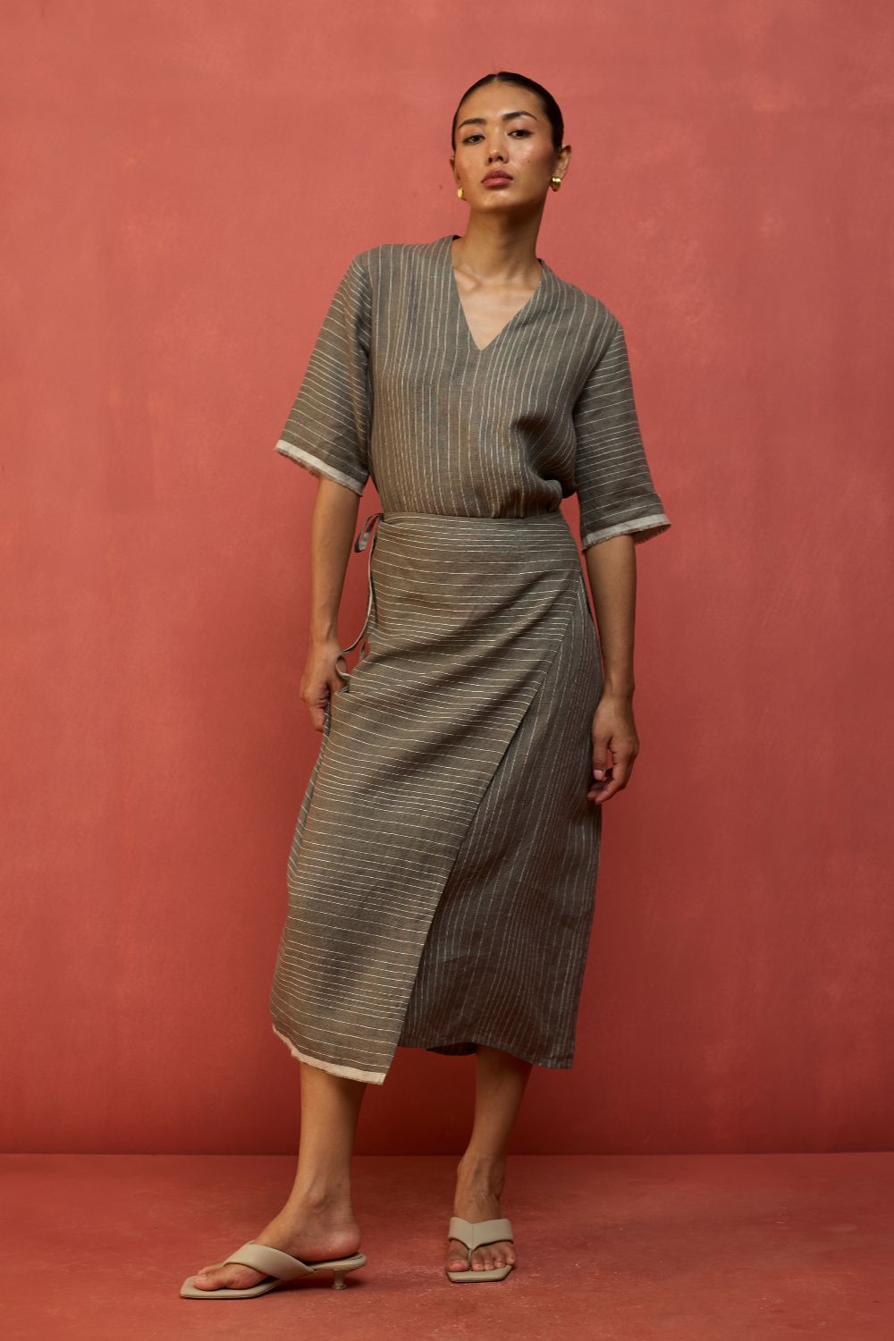 A statement wrap dress thoughtfully crafted for a timeless appeal in a breathable and lightweight stripe yarn-dyed linen. The design features an A line half-sleeve dress with an all-around wrap skirt silhouette with a back-slit for easy movement. The dress has elbow-length wide sleeves and is accented with frayed woven selvedge details along the sleeve and hemline. Karo can be worn relaxed or fitted as per the occasion and personal styling preferences.