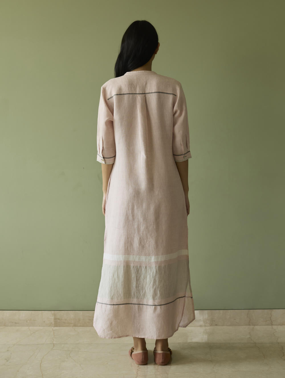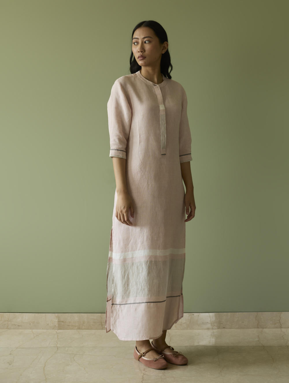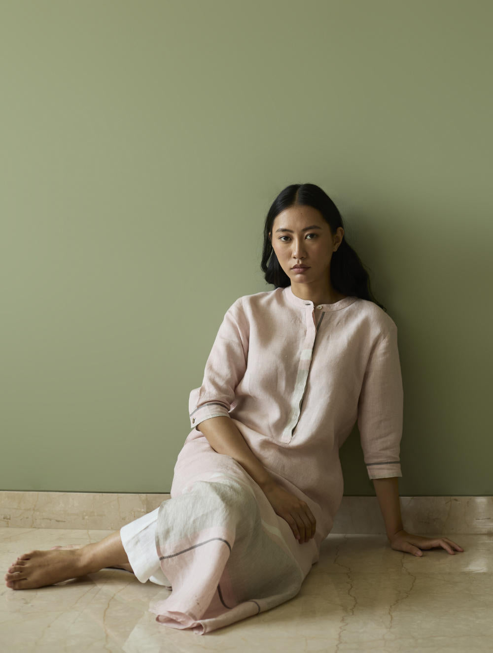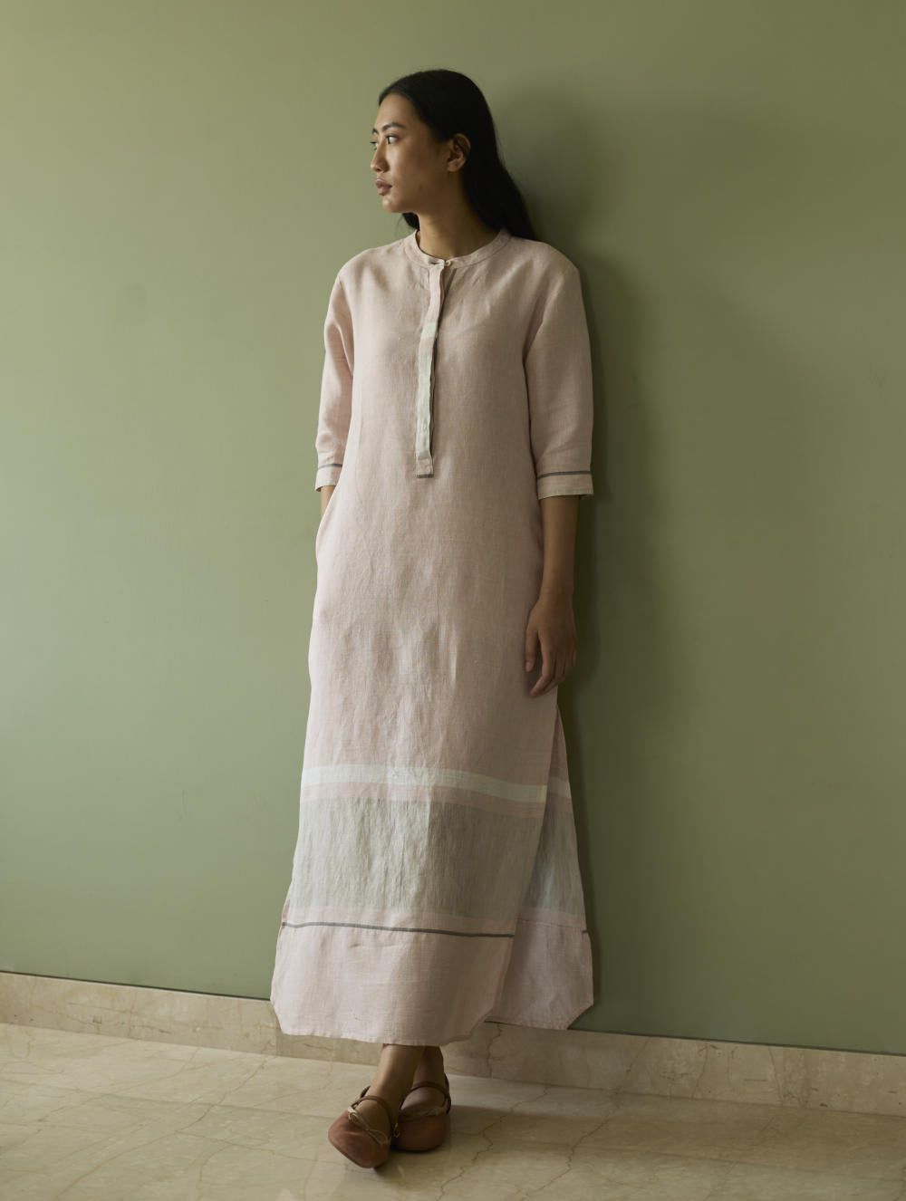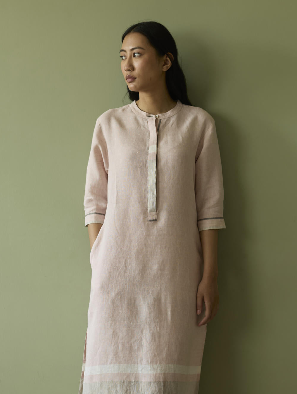 A full-length tunic dress with slits, mother of pearl buttons in a concealed placket, pockets, elbow-length sleeves with cuff in our signature soft handloom metallic linen with a yarn-dyed ivory band and a grey coloured woven selvedge. The placement of the grey selvedge adds balance and uniqueness to the silhouette. Classic and timeless, Terra is wearable for many occasions, both formal and informal