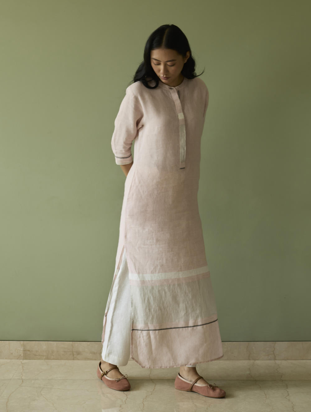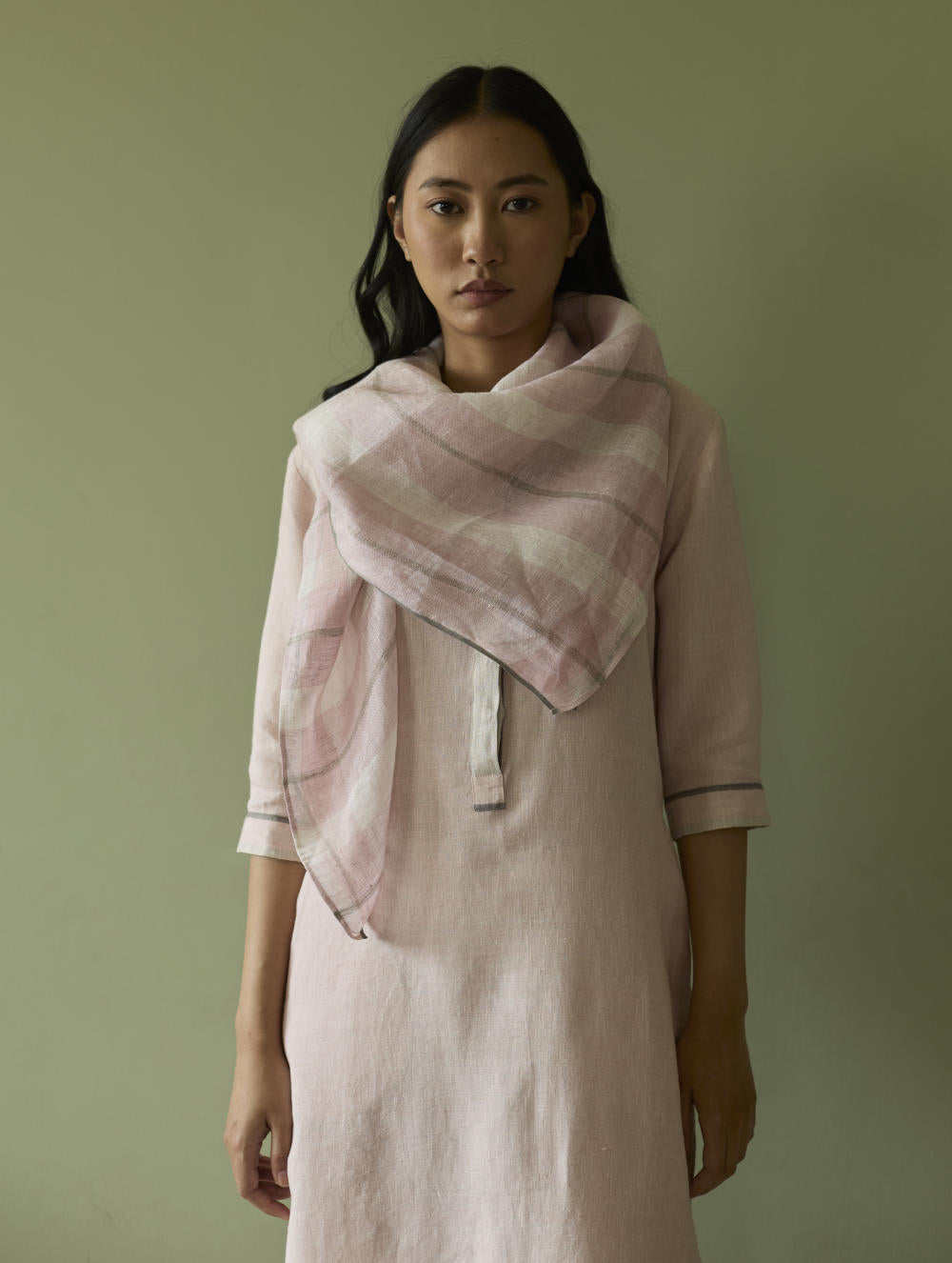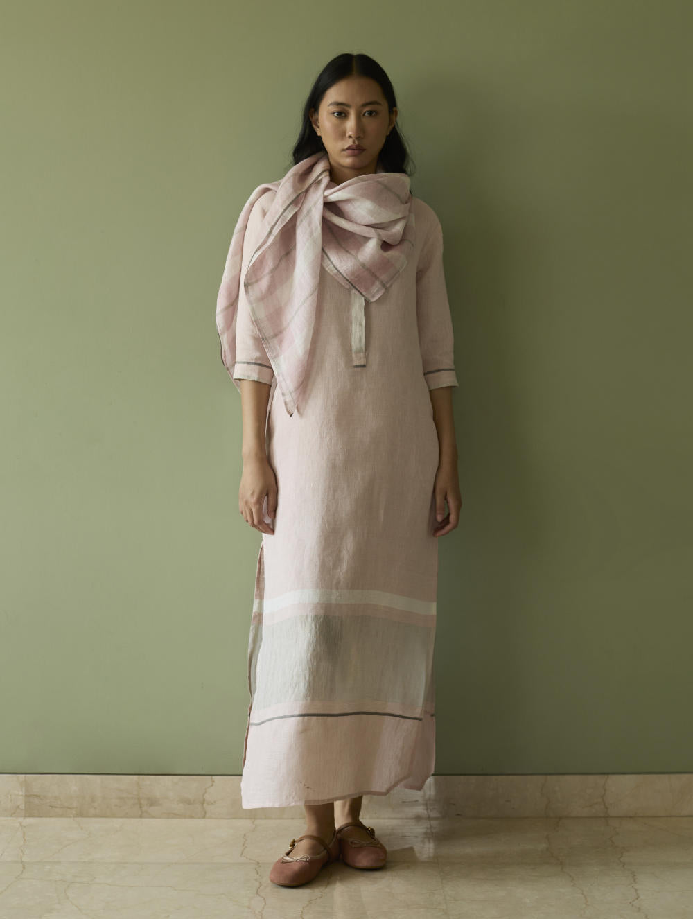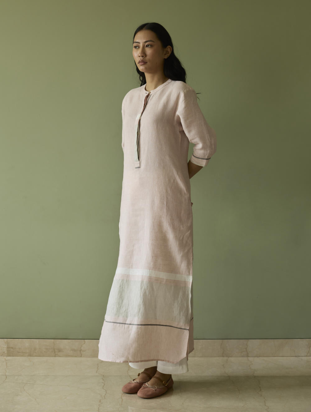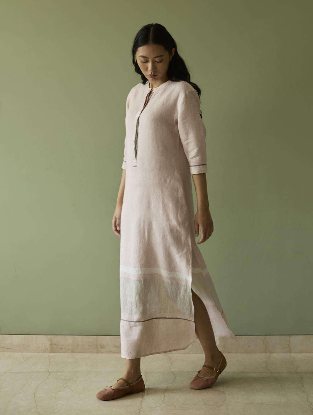 A full-length tunic dress with slits, mother of pearl buttons in a concealed placket, pockets, elbow-length sleeves with cuff in our signature soft handloom metallic linen with a yarn-dyed ivory band and a grey coloured woven selvedge. The placement of the grey selvedge adds balance and uniqueness to the silhouette. Classic and timeless, Terra is wearable for many occasions, both formal and informal