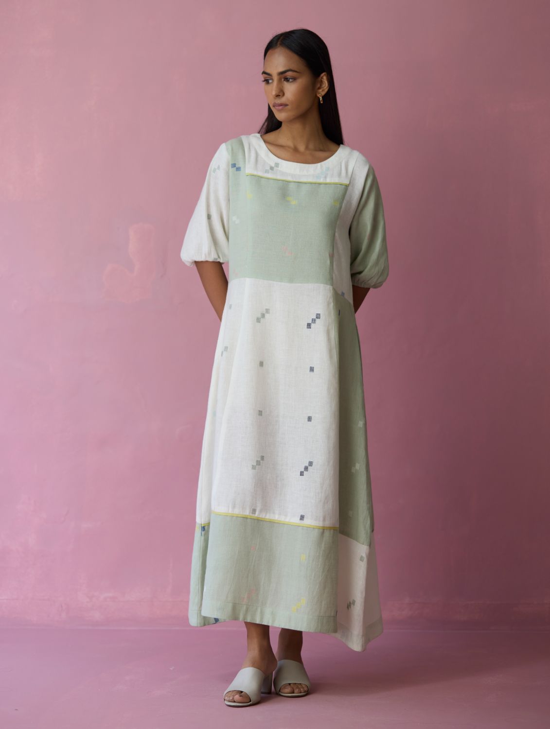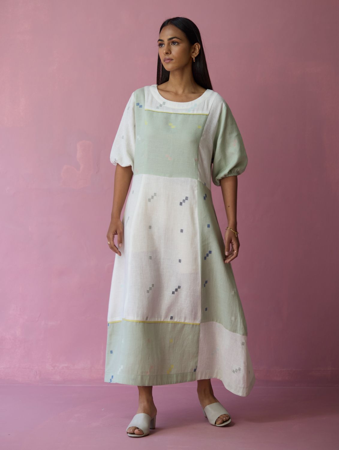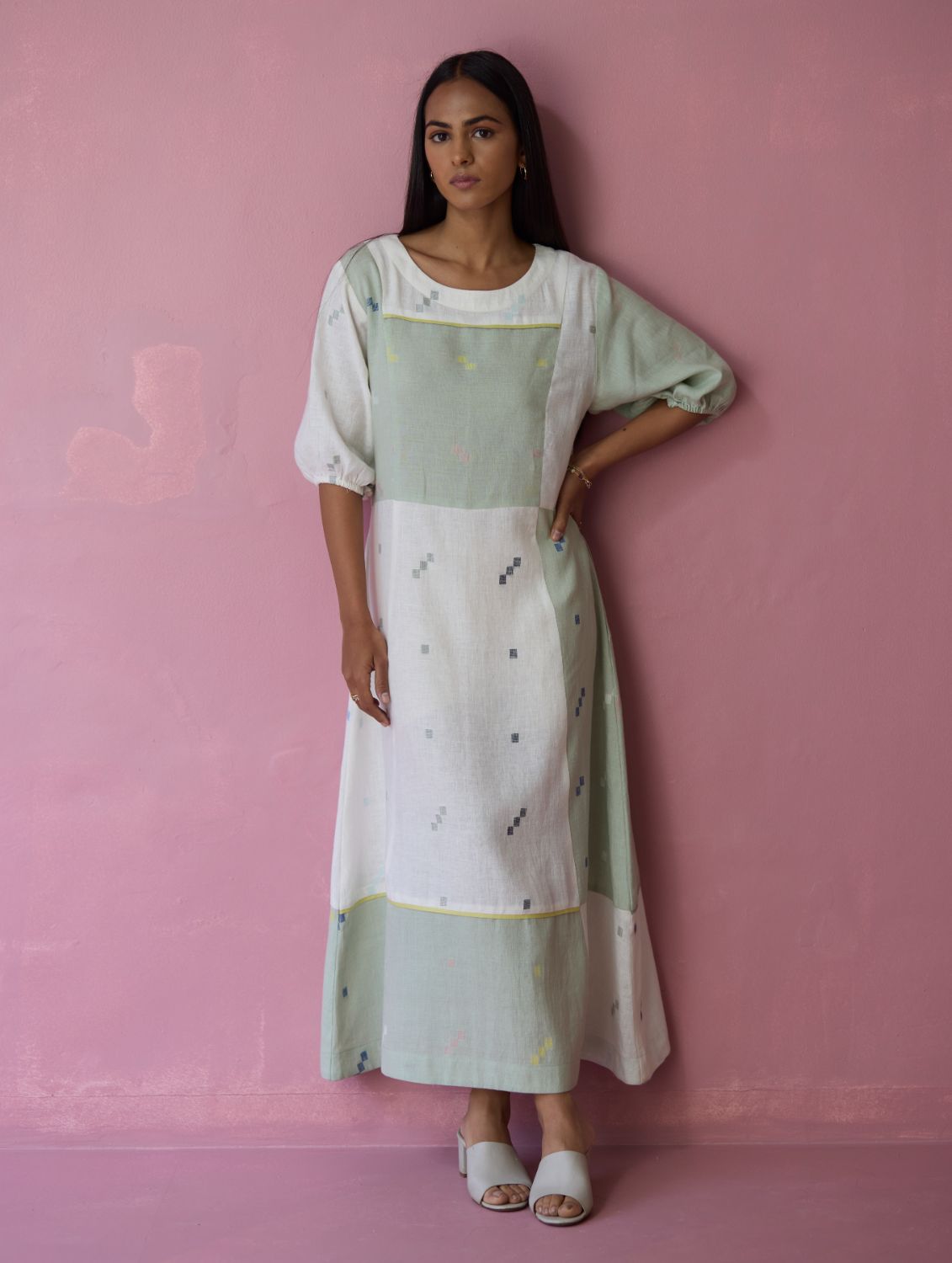 Thie Vani colourblock dress is crafted in two yarn-dyed handloom soft jamdani linens with unique varying 4-colour square motif weaves. A contemporary silhouette that is designed with patchwork panelling paired with woven selvedge borders placed thoughtfully across the bodice. Designed for everyday wear, the dress has flattering puff sleeves and a soft boat neck - a dress that can easily carry you from formal to informal events - one of our versatile favourites.