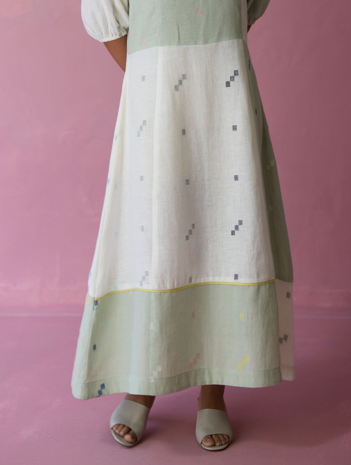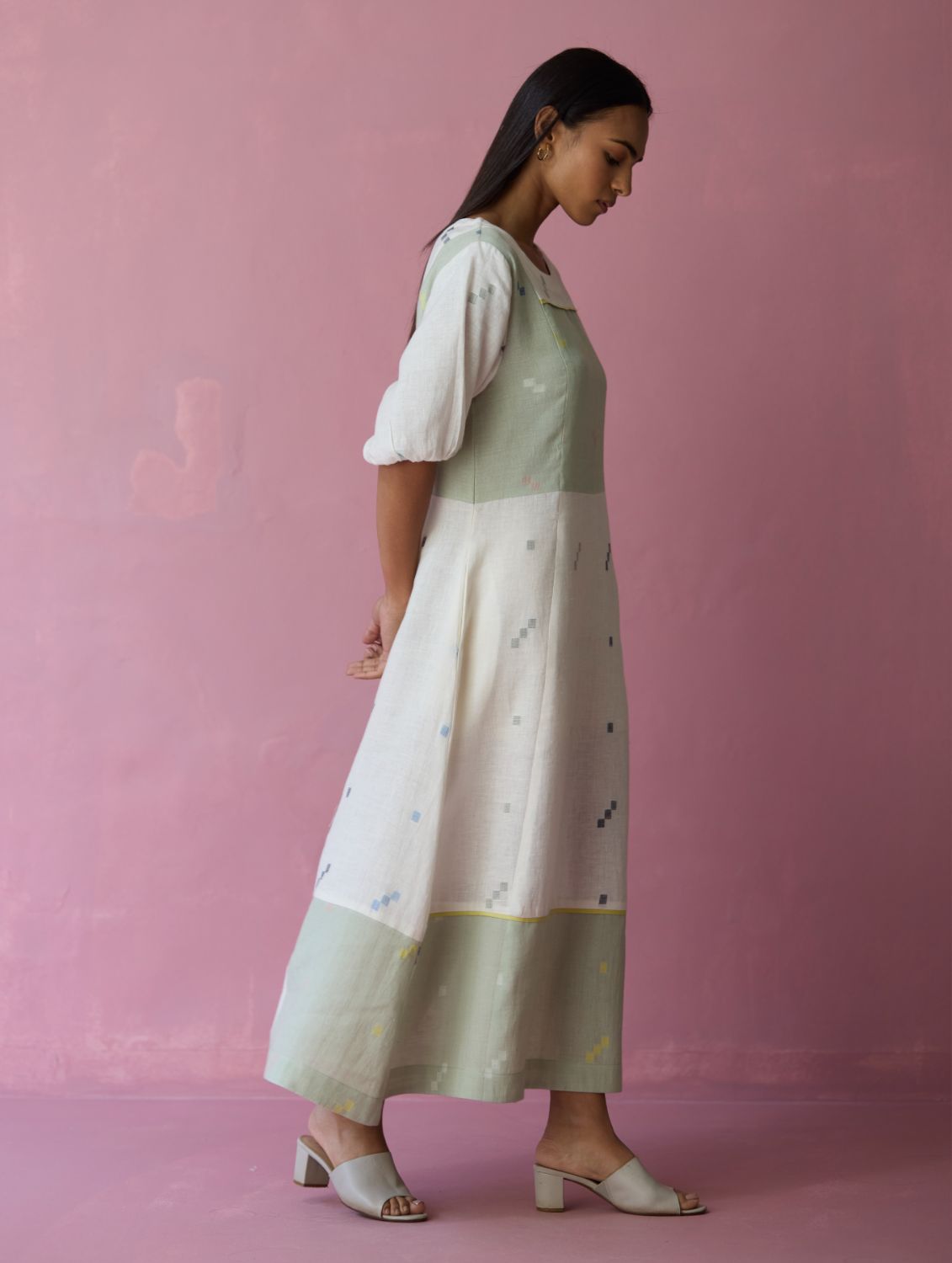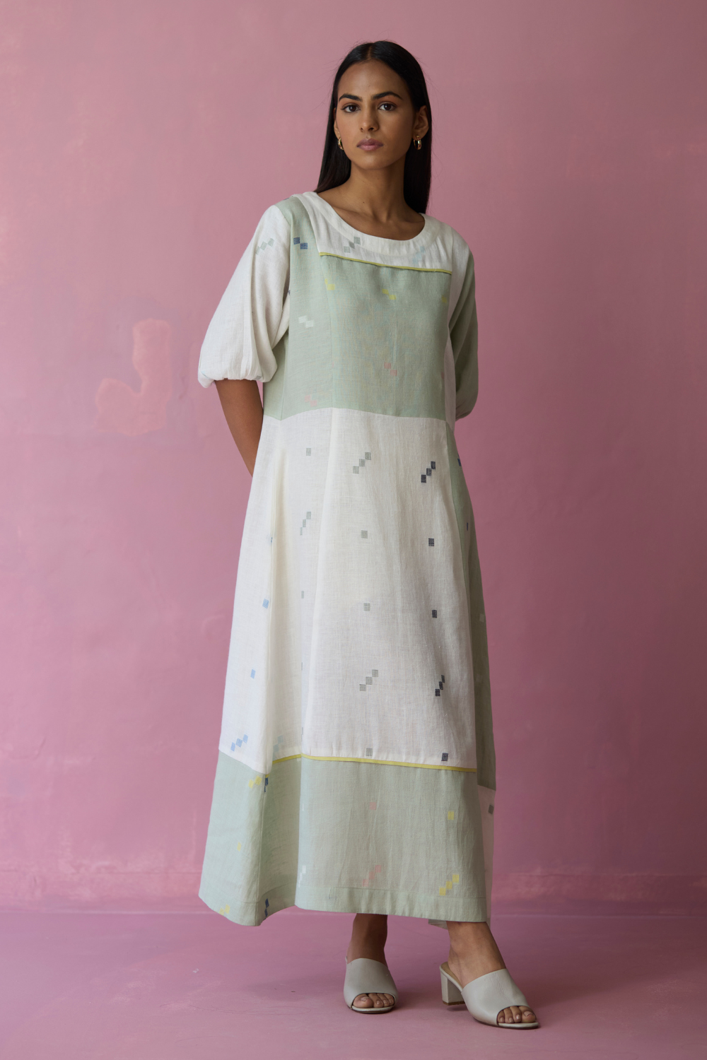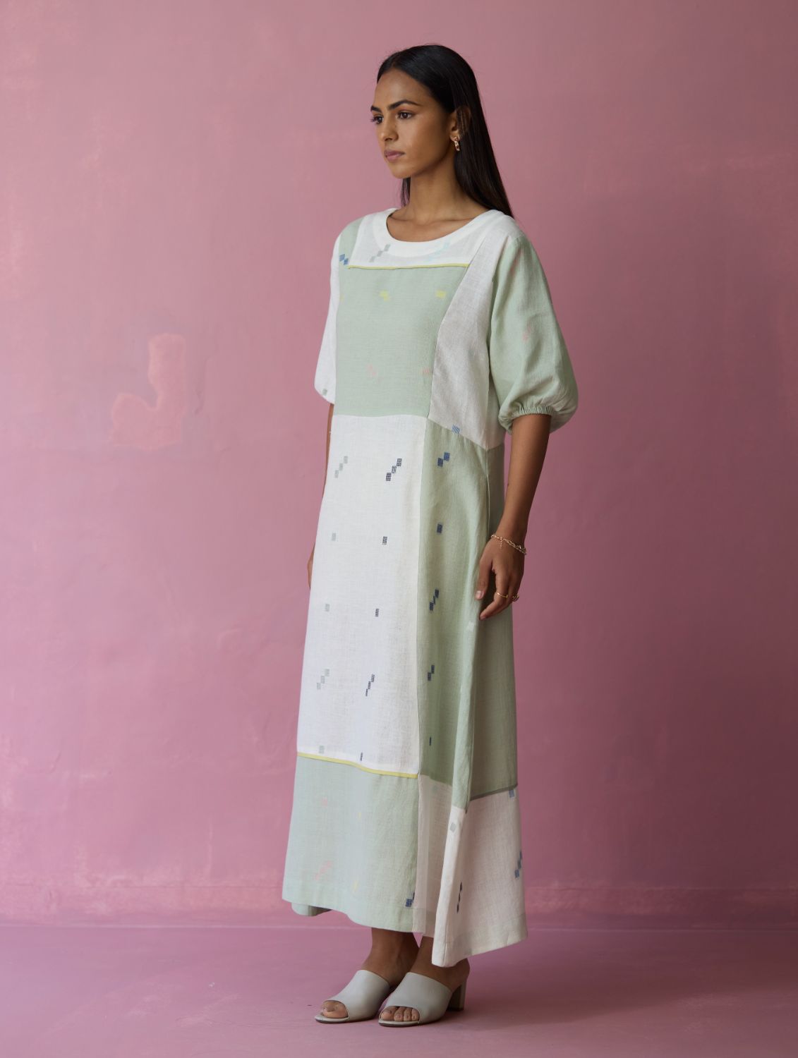 Thie Vani colourblock dress is crafted in two yarn-dyed handloom soft jamdani linens with unique varying 4-colour square motif weaves. A contemporary silhouette that is designed with patchwork panelling paired with woven selvedge borders placed thoughtfully across the bodice. Designed for everyday wear, the dress has flattering puff sleeves and a soft boat neck - a dress that can easily carry you from formal to informal events - one of our versatile favourites.