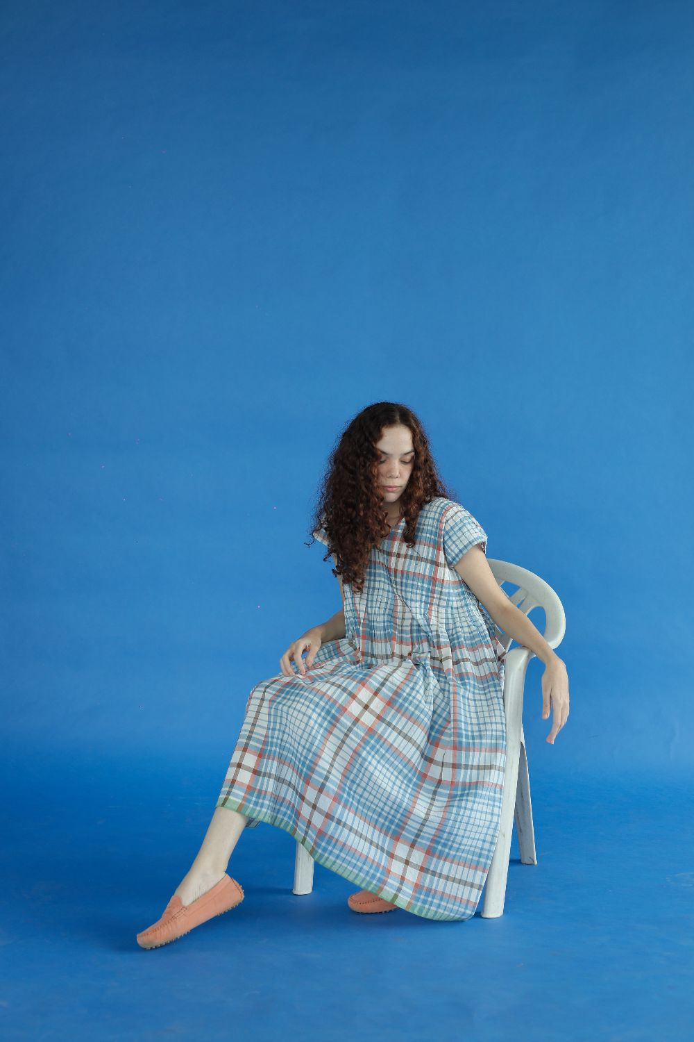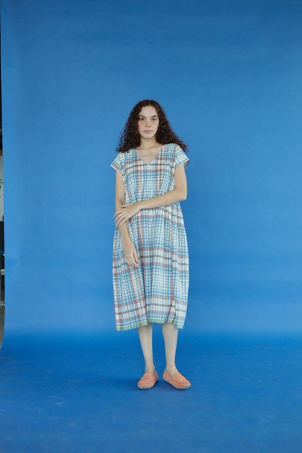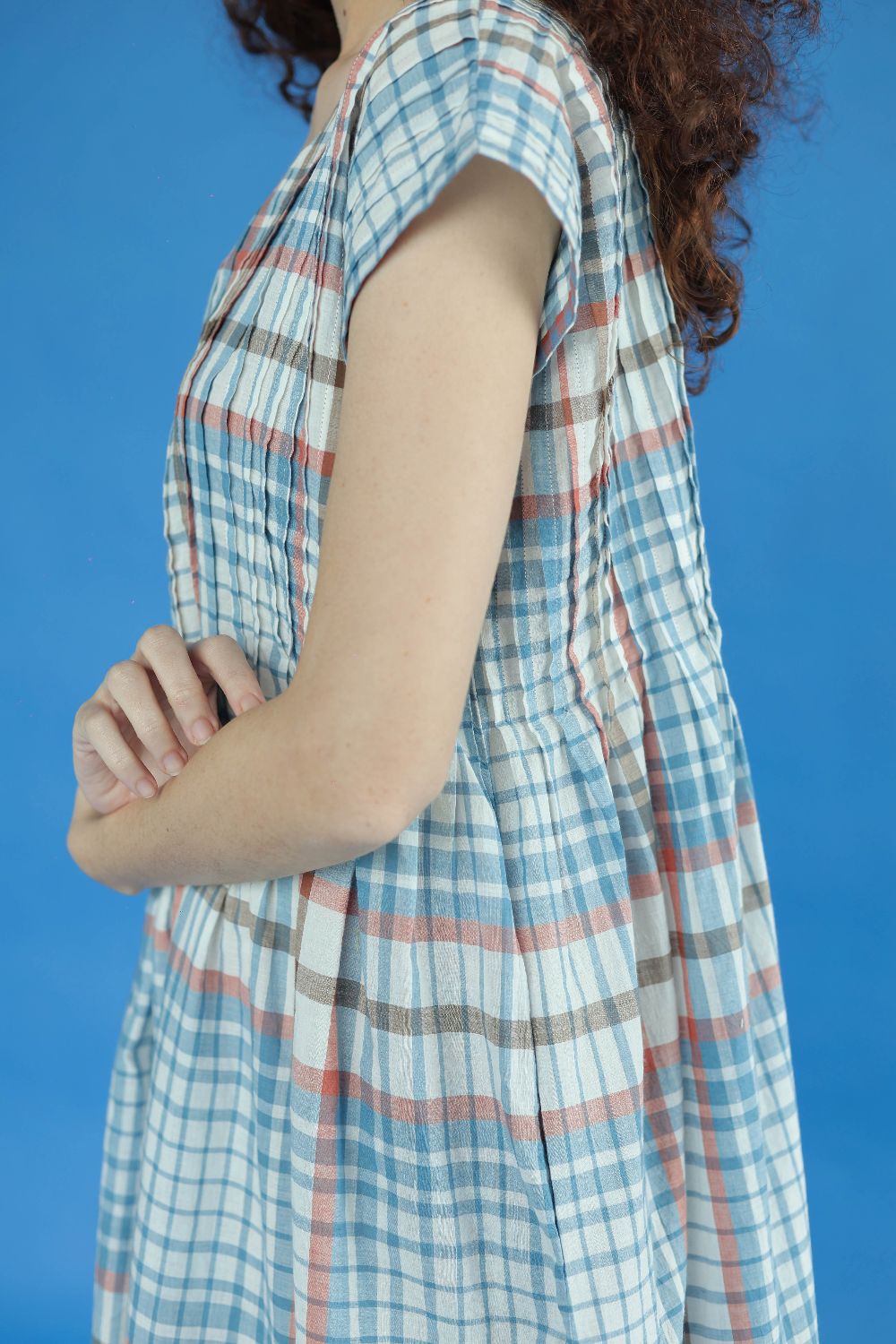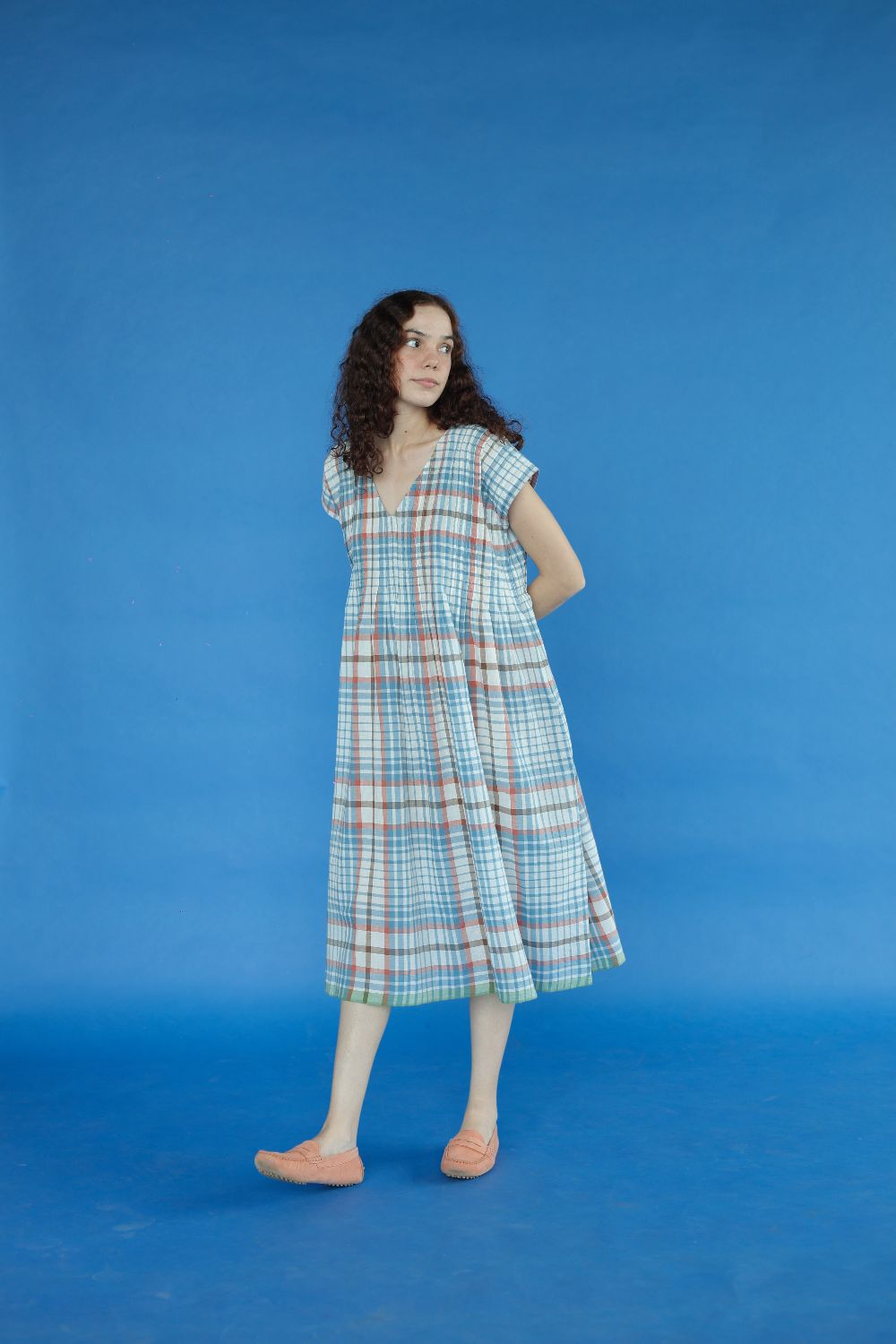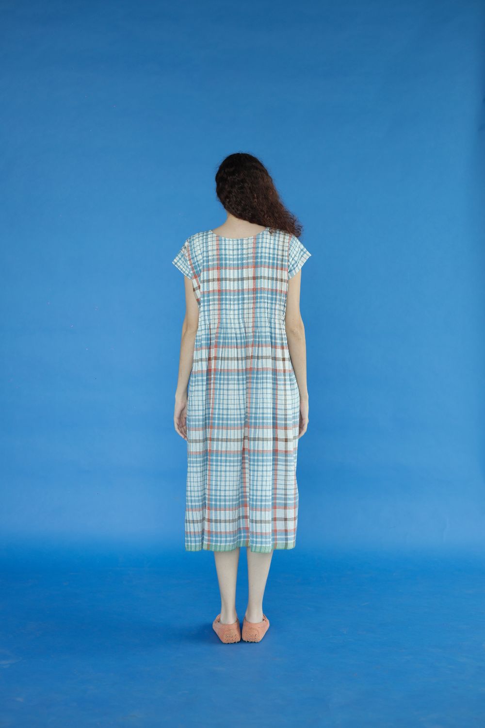 Easy, breezy, and perfect for warm days. Cut from engineered handwoven cotton checks, with delicate bodice pleats, pockets and a contrasting green hemline. Darla will become your go-to summer dress.