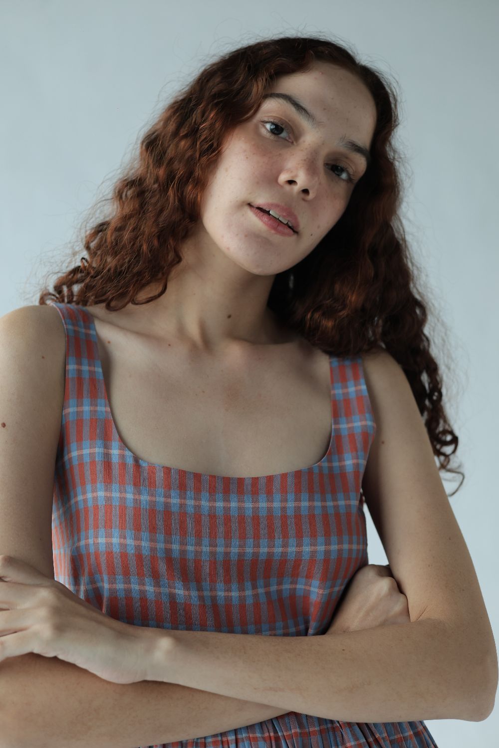 A change from the classic Mason & Mill dresses, 'Mia' is a sleeveless cotton midi that comes with a slightly fitted bodice elasticated at the back, and gathers that run down the waistline - this time in a subtle yet bold two toned checks with a vibrant contrasting yellow selvage.