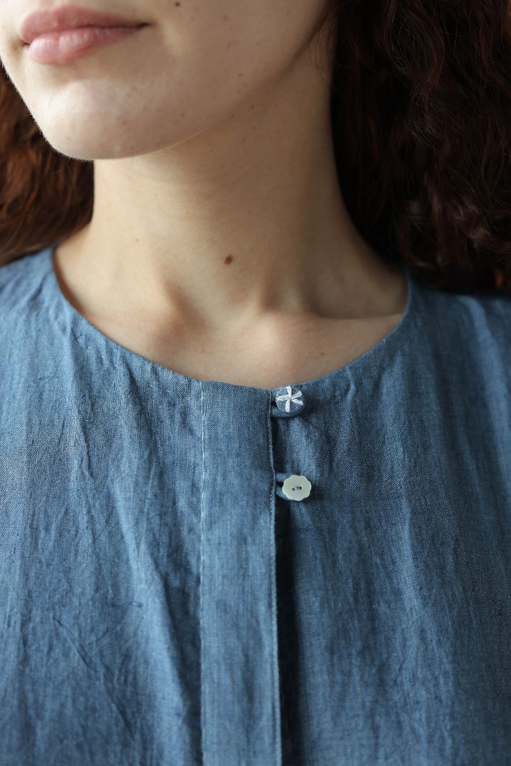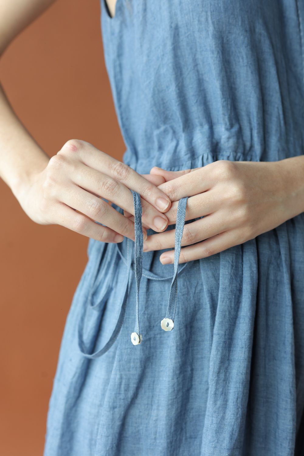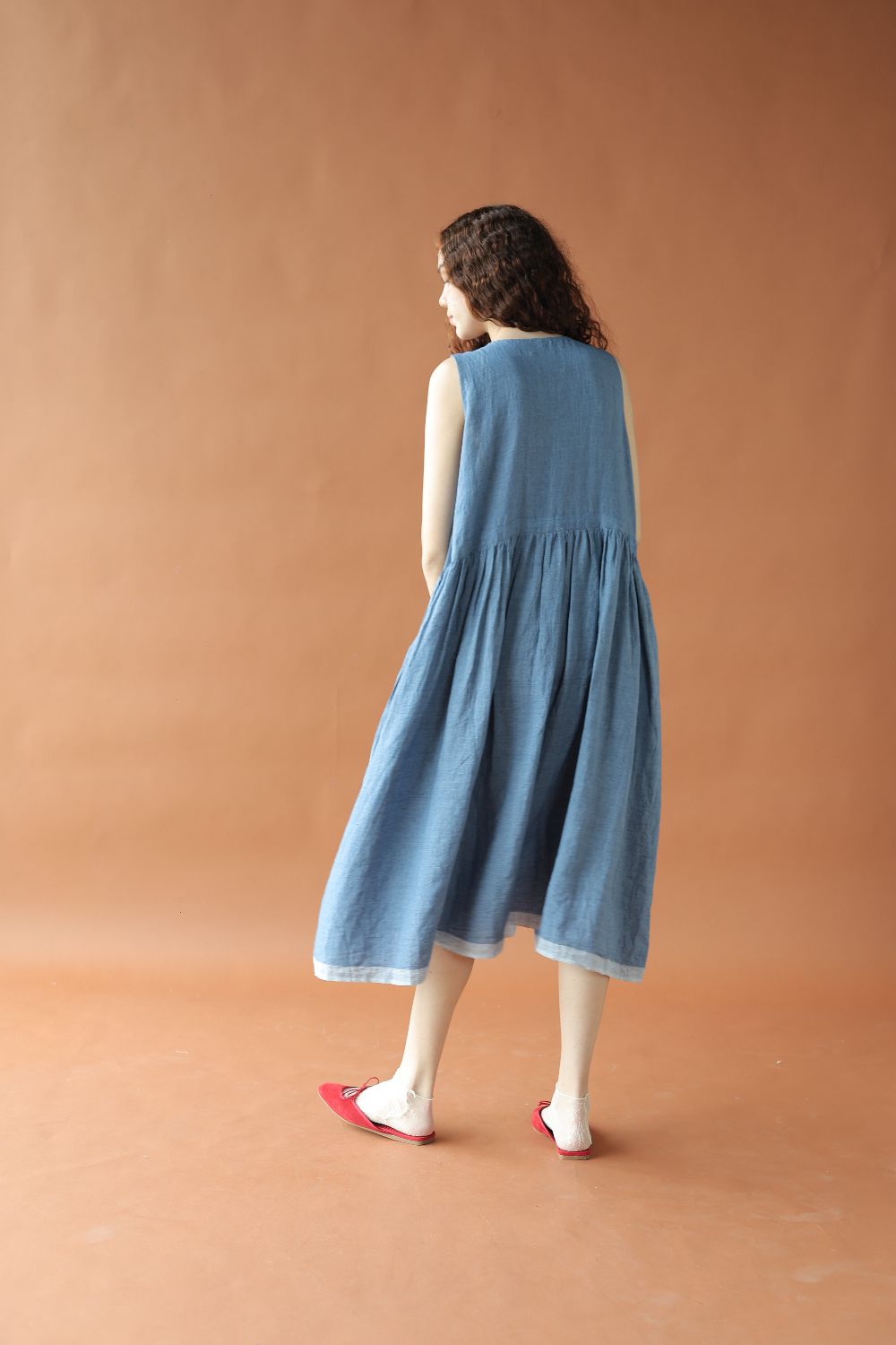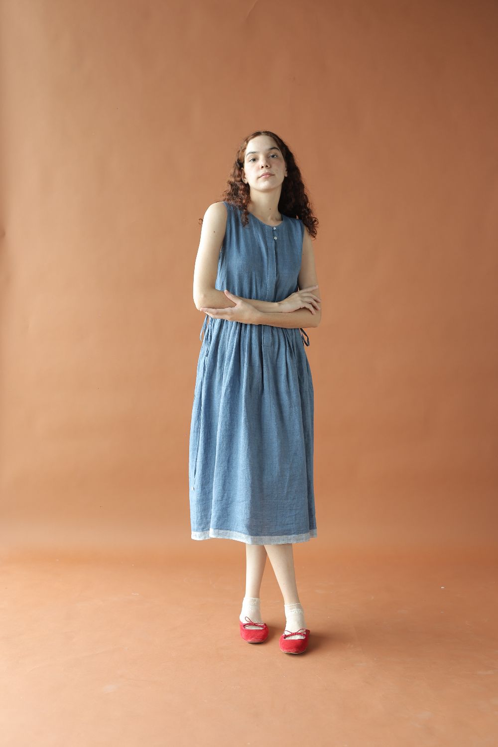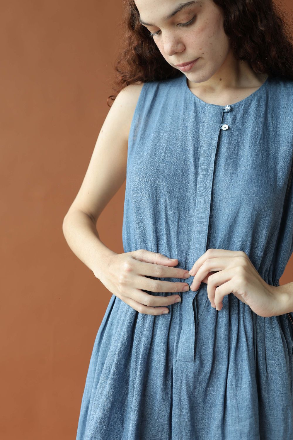 This relaxed sleeveless linen dress has a drawstring waist for a dramatic fit, that can be left undone or cinched. Inseam pockets, contrasting hem details, a concealed placket with two buttons highlighted at the top finish the dress.