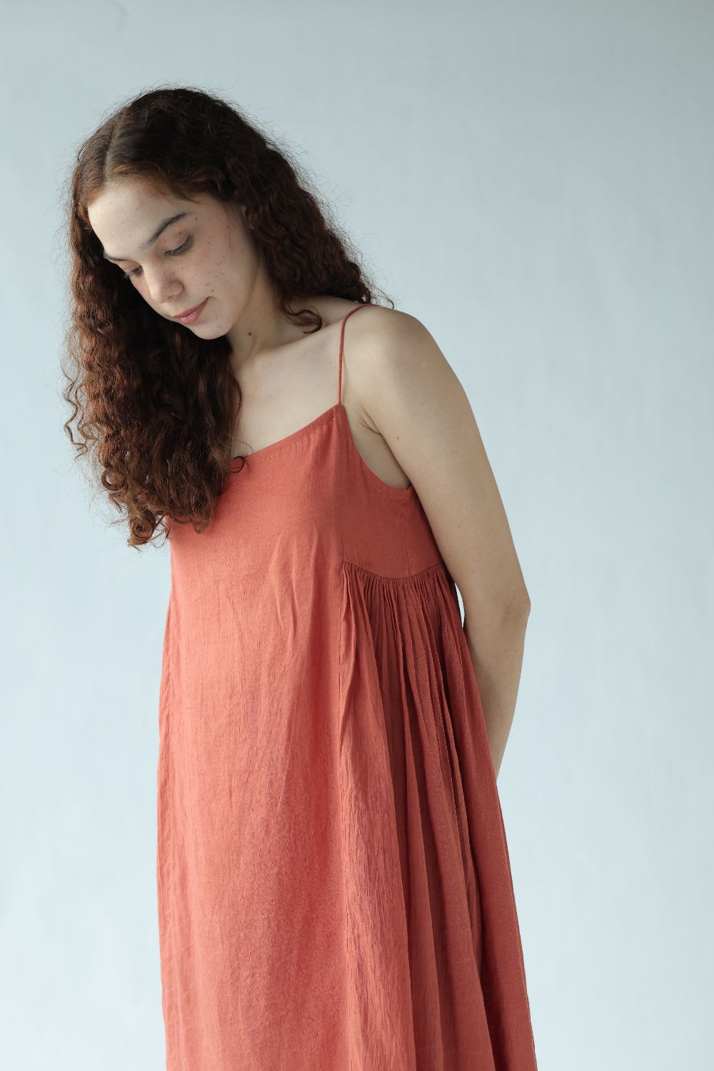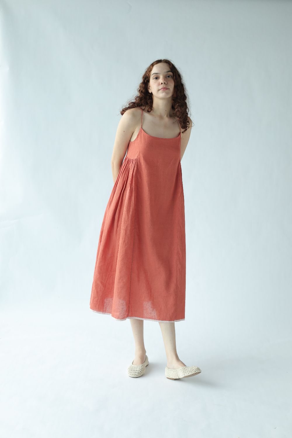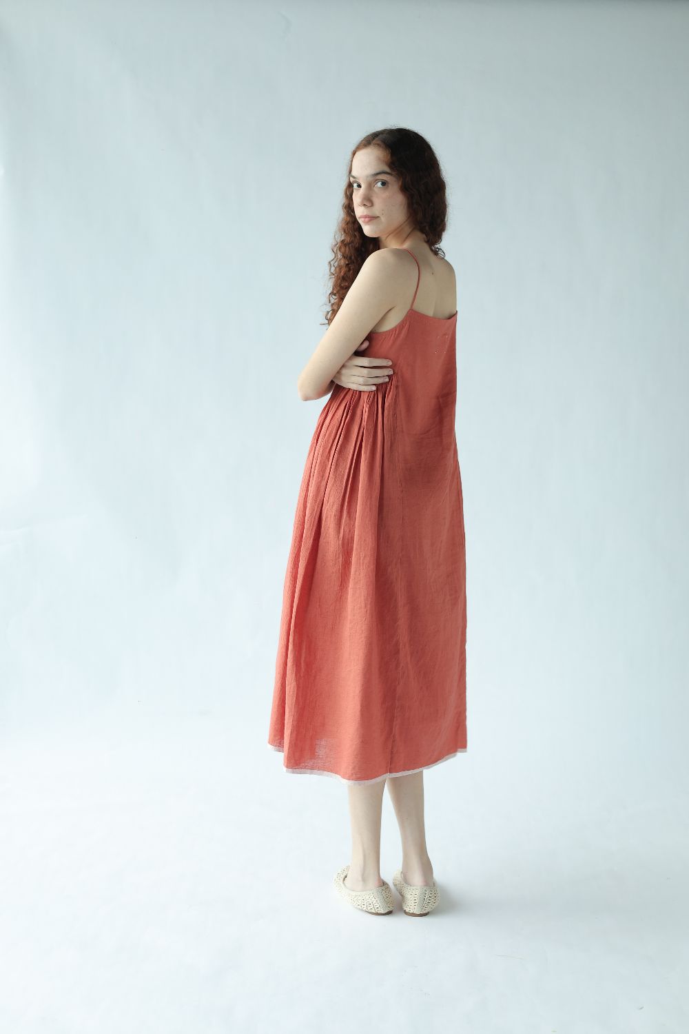 Noodle strap midi dress in handwoven cotton linen, with side gathered panels that include pockets. Finished with a hand hemmed neckline and off White selvedge at the hem.