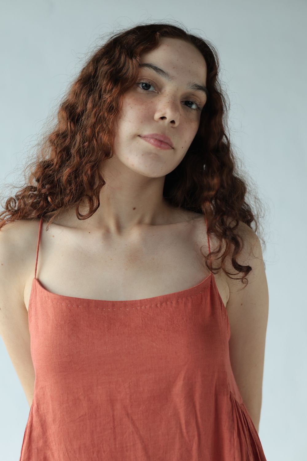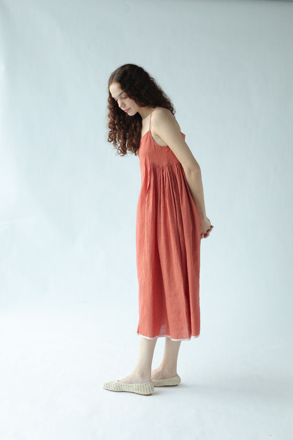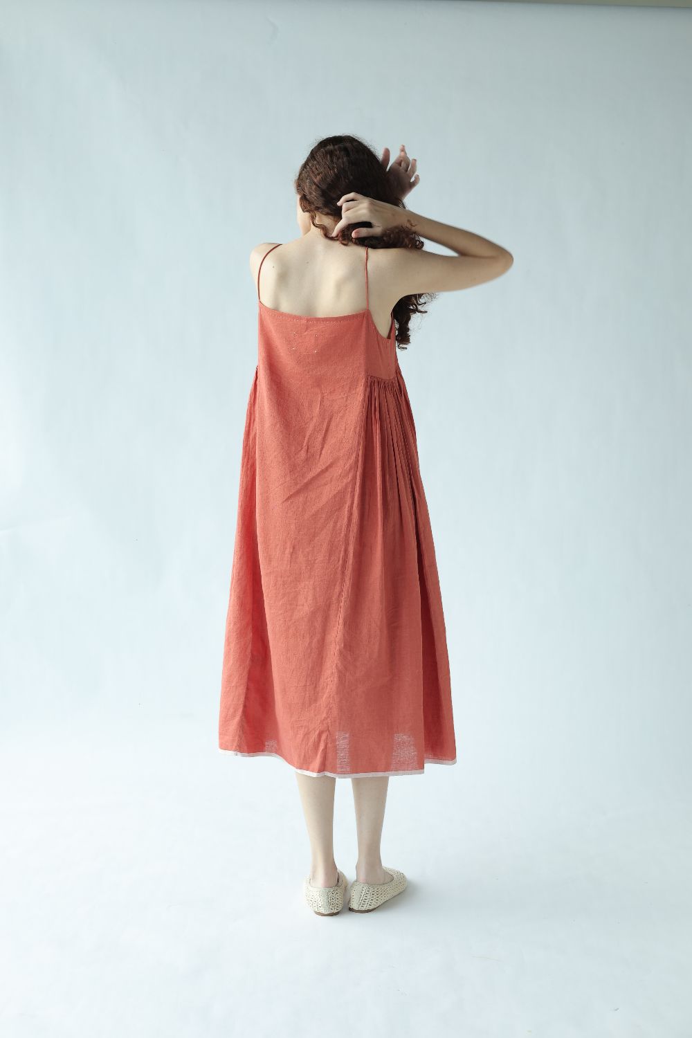 Noodle strap midi dress in handwoven cotton linen, with side gathered panels that include pockets. Finished with a hand hemmed neckline and off White selvedge at the hem.