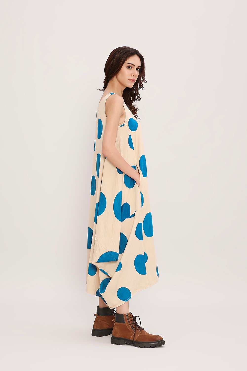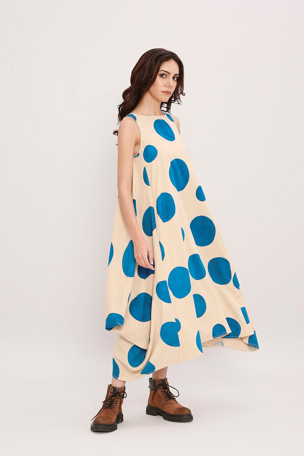 Our classic side cowl dress with a boat neckline makes a subtle yet striking statement, featuring handblocked polka dots all over. A perfect blend of effortless drape and playful detailing.