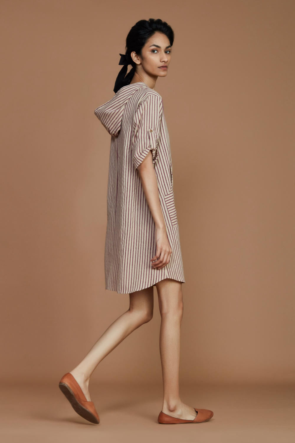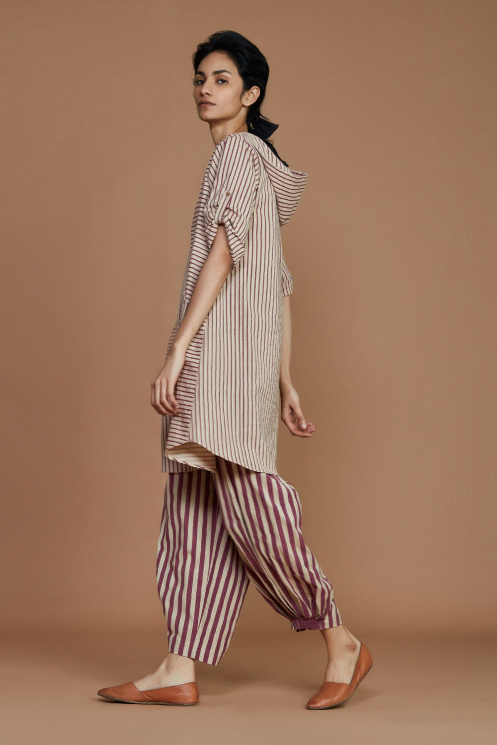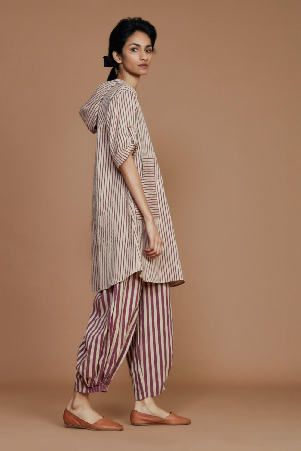Handwoven Cotton With AZZO Free Dye - Ivory with Mauve hand block printed stripes