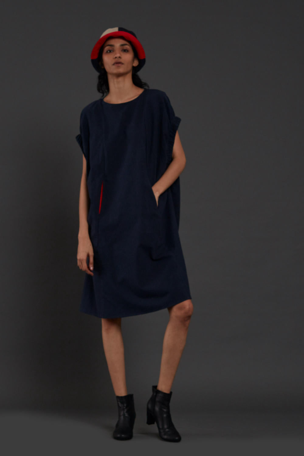 Midi length shift dress with extended elasticated sleeves and two front contrast pockets.