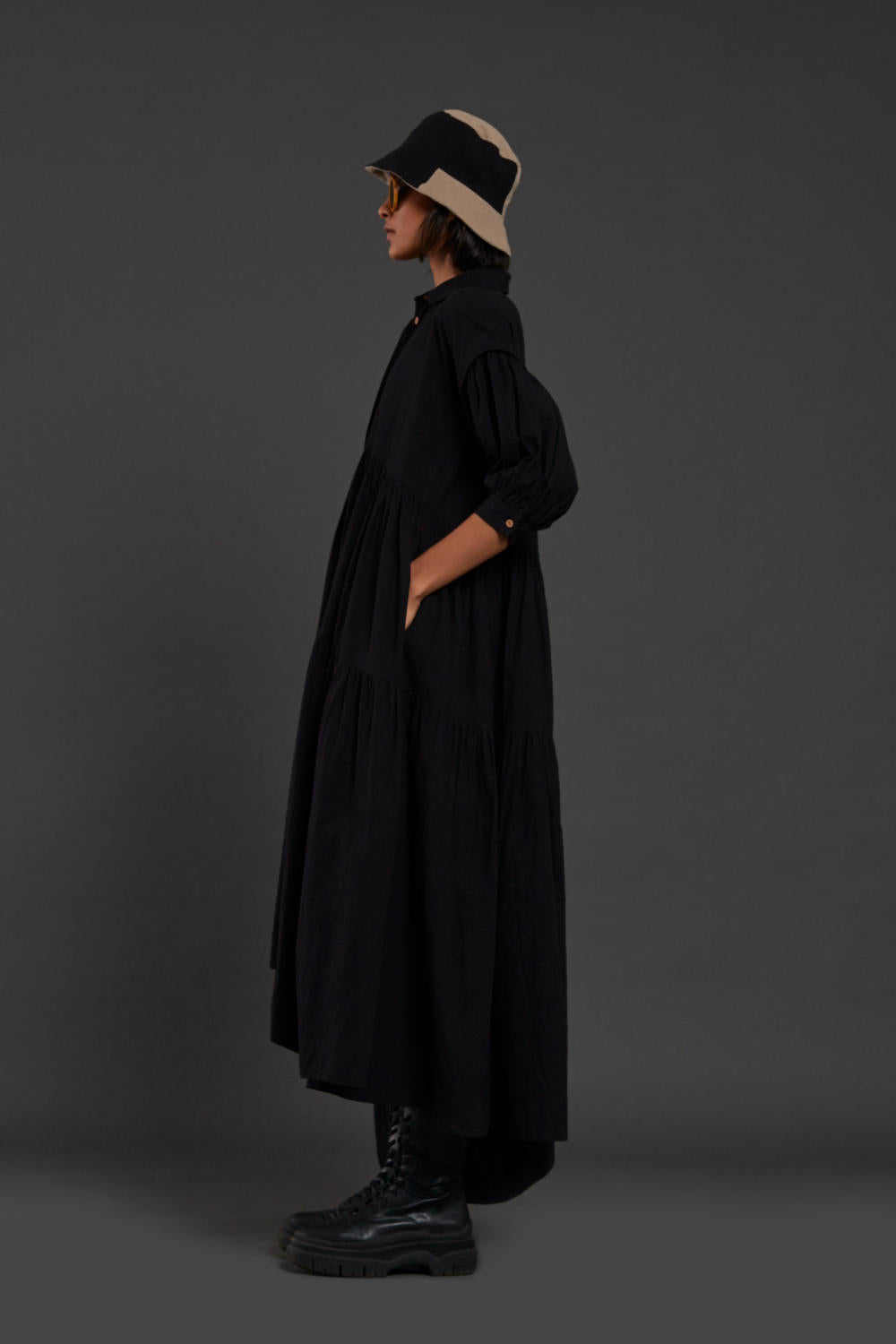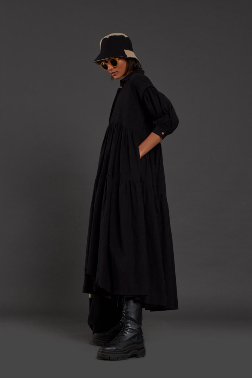 Ankle-length tiered shirt dress with extended balloon sleeves, front button opening and side pockets.