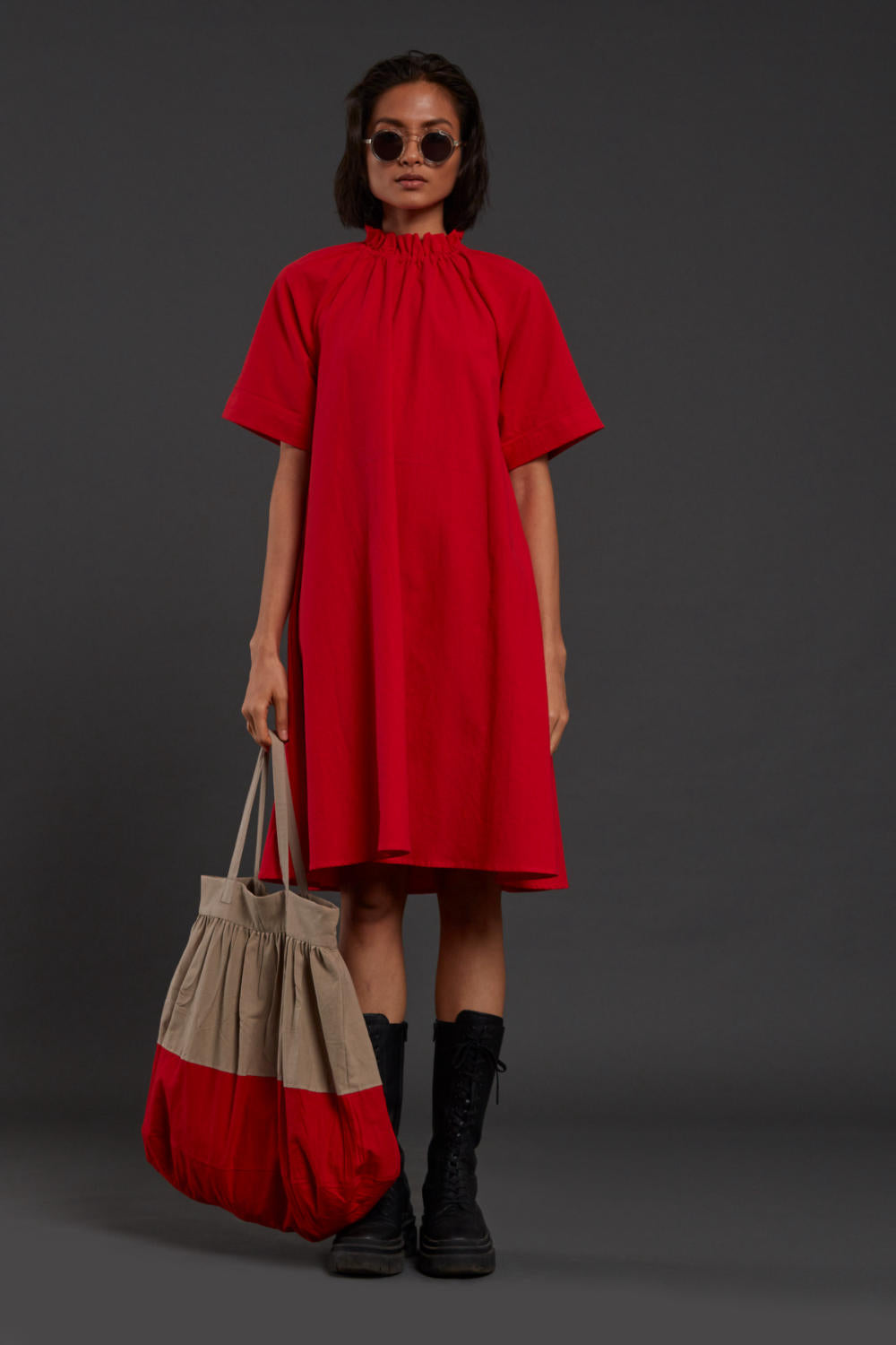 Midi length shift dress with elasticated neckline and raglan sleeves. Comes with side pockets.