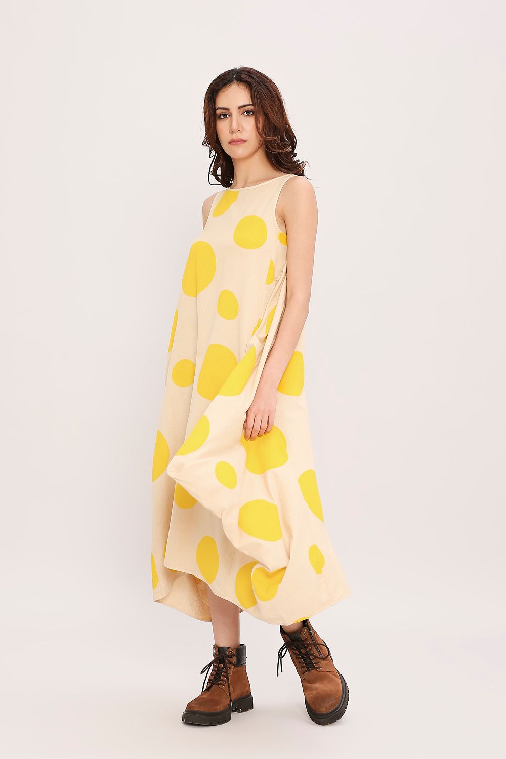 Our classic side cowl dress with a boat neckline makes a subtle yet striking statement, featuring handblocked polka dots all over. A perfect blend of effortless drape and playful detailing.