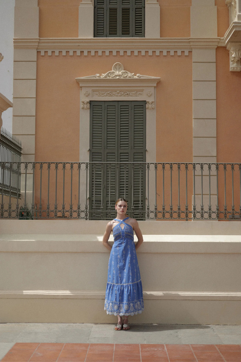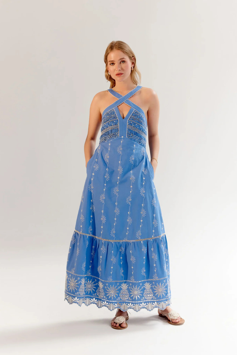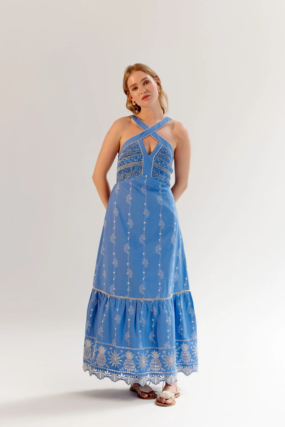 Introducing the Aida Maxi, a graceful halter-neck dress designed to capture the essence of effortless summer elegance. It is available in three exquisite variations: Postcard and Seashell, featuring vibrant placement prints on breezy viscose linen, and a timeless Schiffli Embroidery design in giza poplin with smocking on the upper body. All variations feature adjustable straps adorned with beaded tassels and tier detailing at the bottom for added movement and charm.