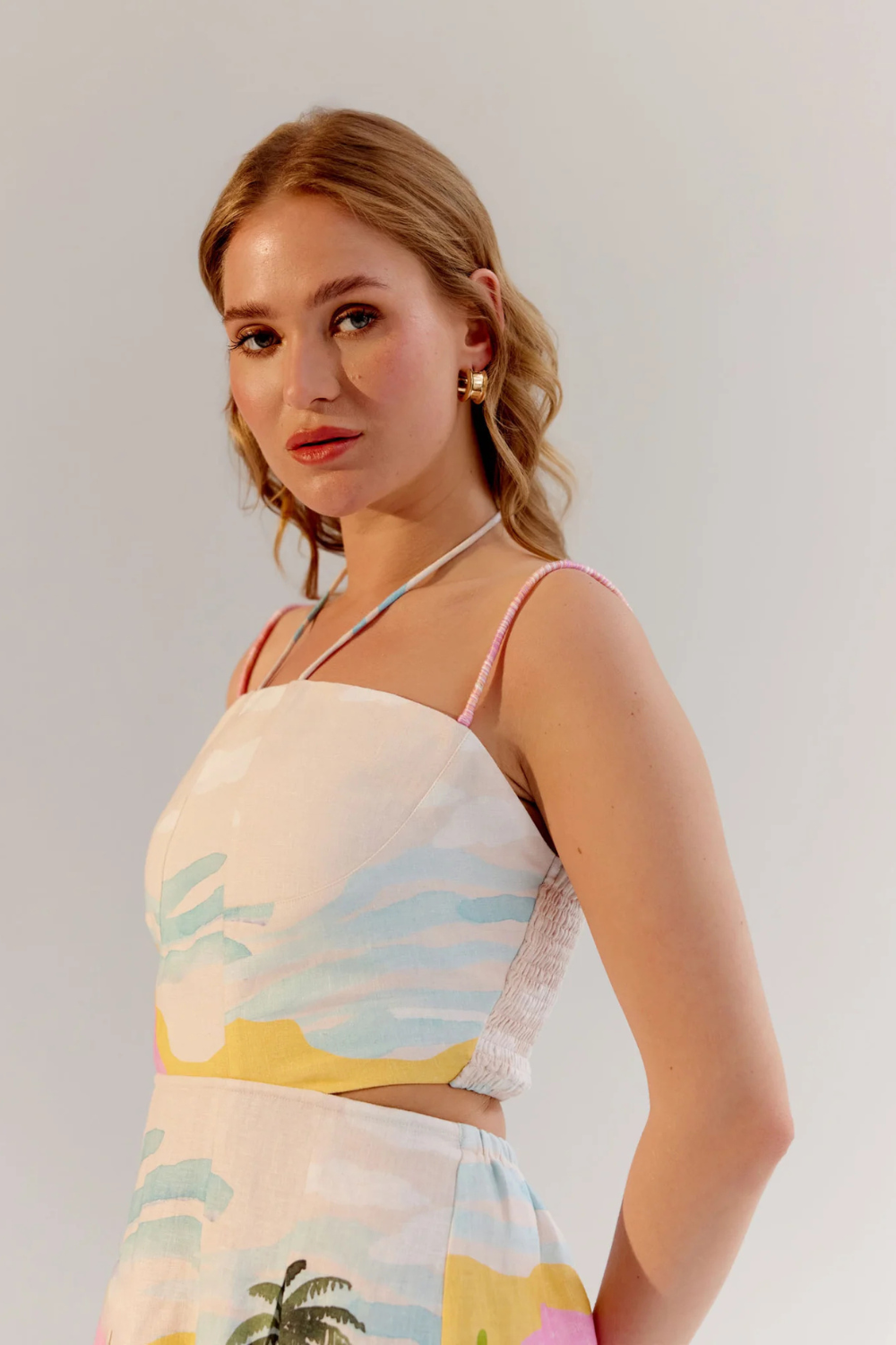 Introducing the Ariel Midi that comes in two elegant variations: By the Sea, a placement print on breathable linen lyocell, and a classic Schiffli Embroidery on premium giza poplin. Both designs feature straps adorned with intricate anchor threads wrapped around the strap detailing, adding a unique nautical-inspired touch.