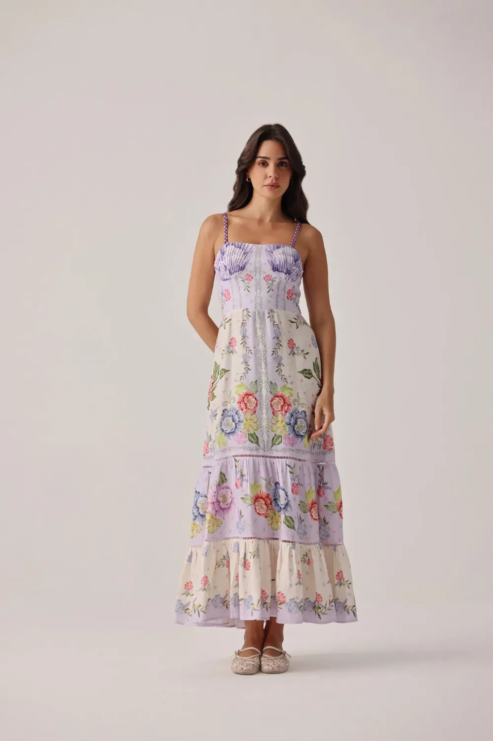 Fine-strap sleeveless maxi dress silhouette with a two-tiered fall
