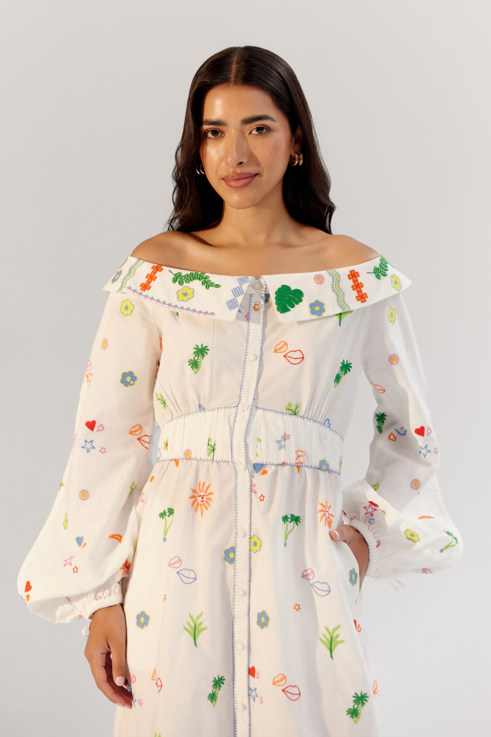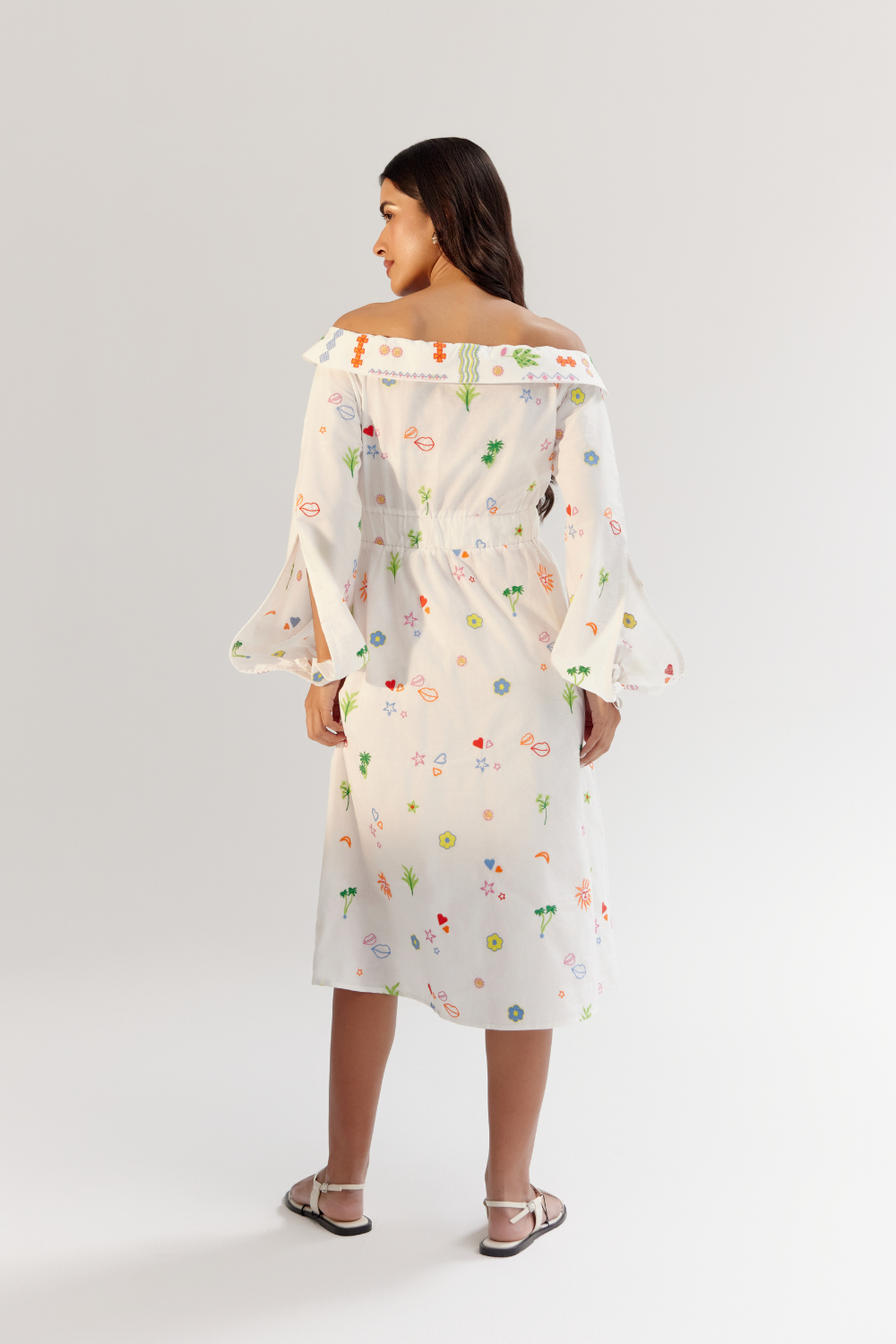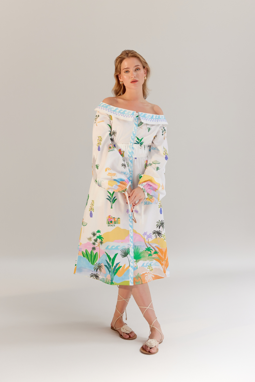 The Sage Midi is an off-shoulder masterpiece crafted from premium Giza poplin, offering a perfect blend of elegance and ease. Available in two stunning variations—By the Sea, featuring a placement print, and an all-over embroidered design—this dress captures the essence of summer charm. Thoughtfully placed pleating near the waist and an elasticated back provide a flattering fit while ensuring comfort and flexibility.