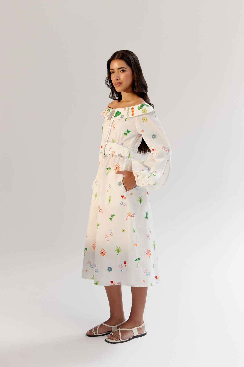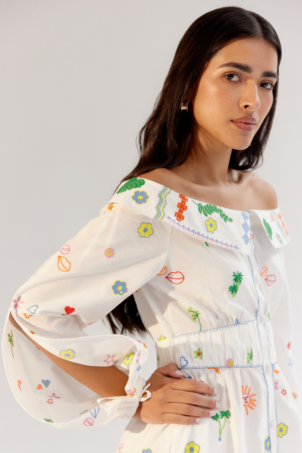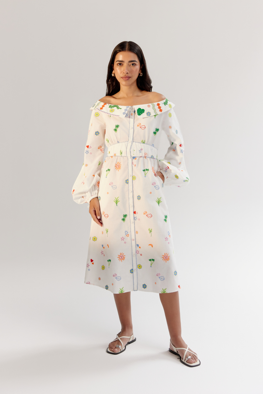 The Sage Midi is an off-shoulder masterpiece crafted from premium Giza poplin, offering a perfect blend of elegance and ease. Available in two stunning variations—By the Sea, featuring a placement print, and an all-over embroidered design—this dress captures the essence of summer charm. Thoughtfully placed pleating near the waist and an elasticated back provide a flattering fit while ensuring comfort and flexibility.
