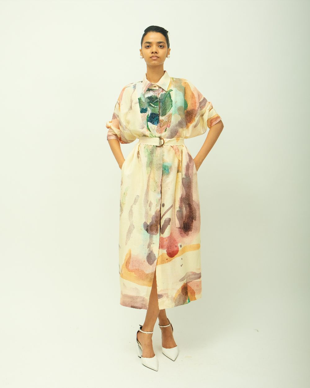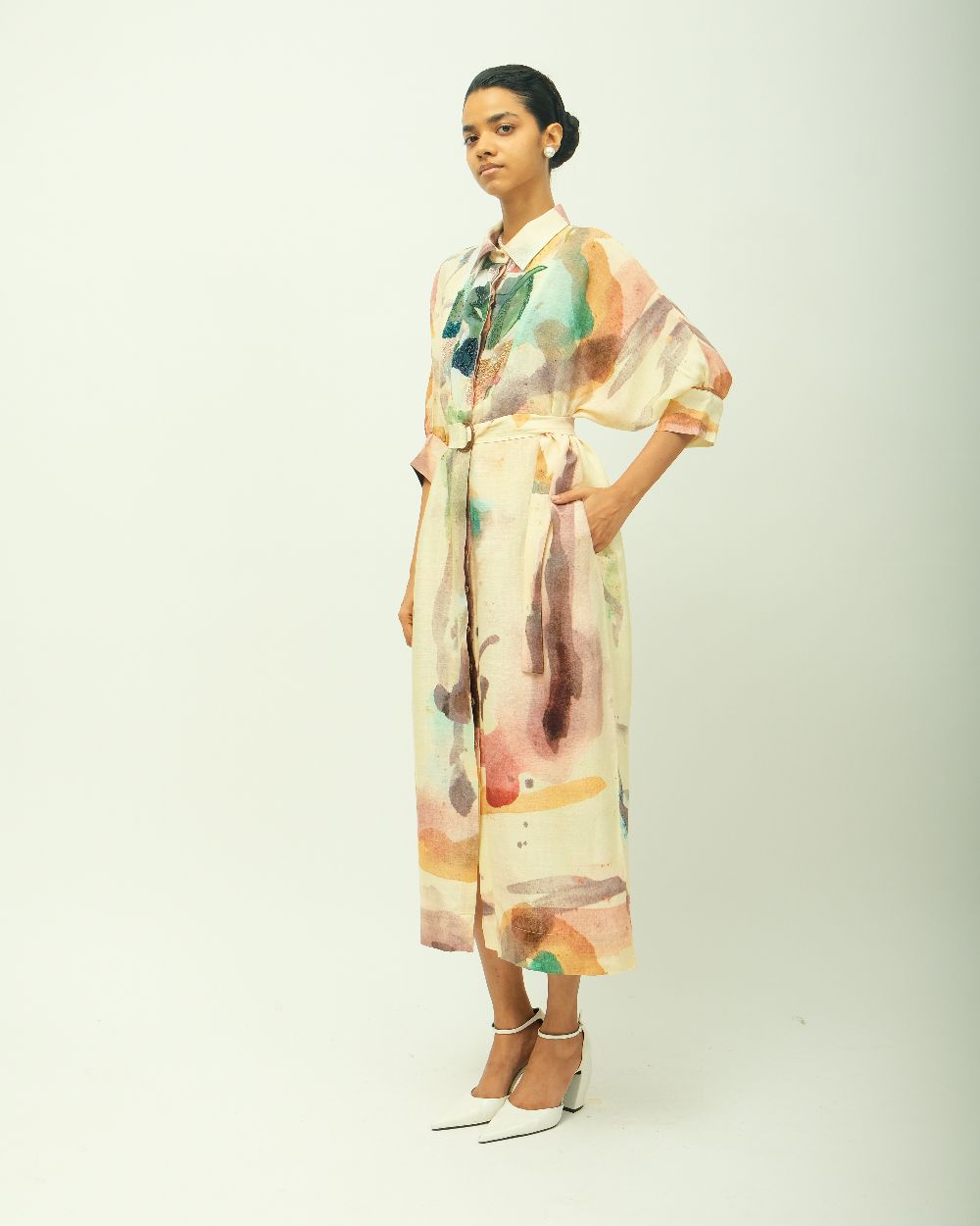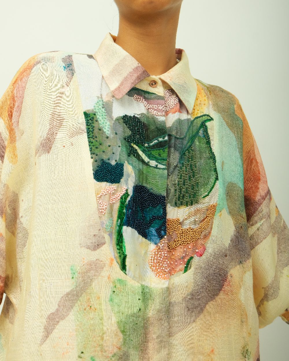 Anti-Fit Dress, asymmetrical yoke, bead detailing, shirt collar, full concealed placket, three-fourth sleeves, side pockets, hand-painted abstract expressionist digitally transferred print, Variations in color, texture, and weave are inherent due to the hand-made nature of the garment- Single piece. Garment Length - 48"