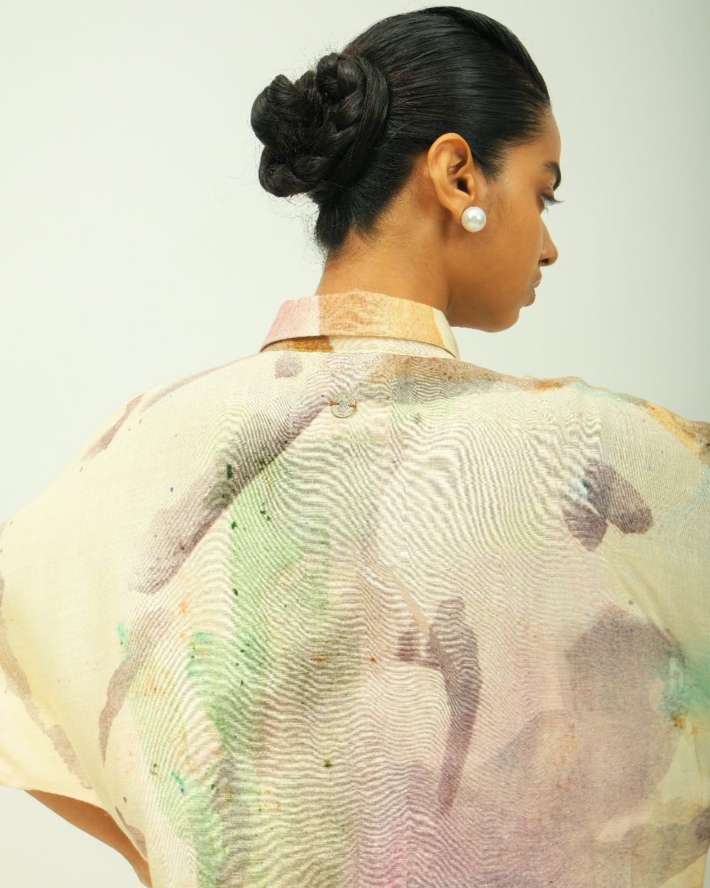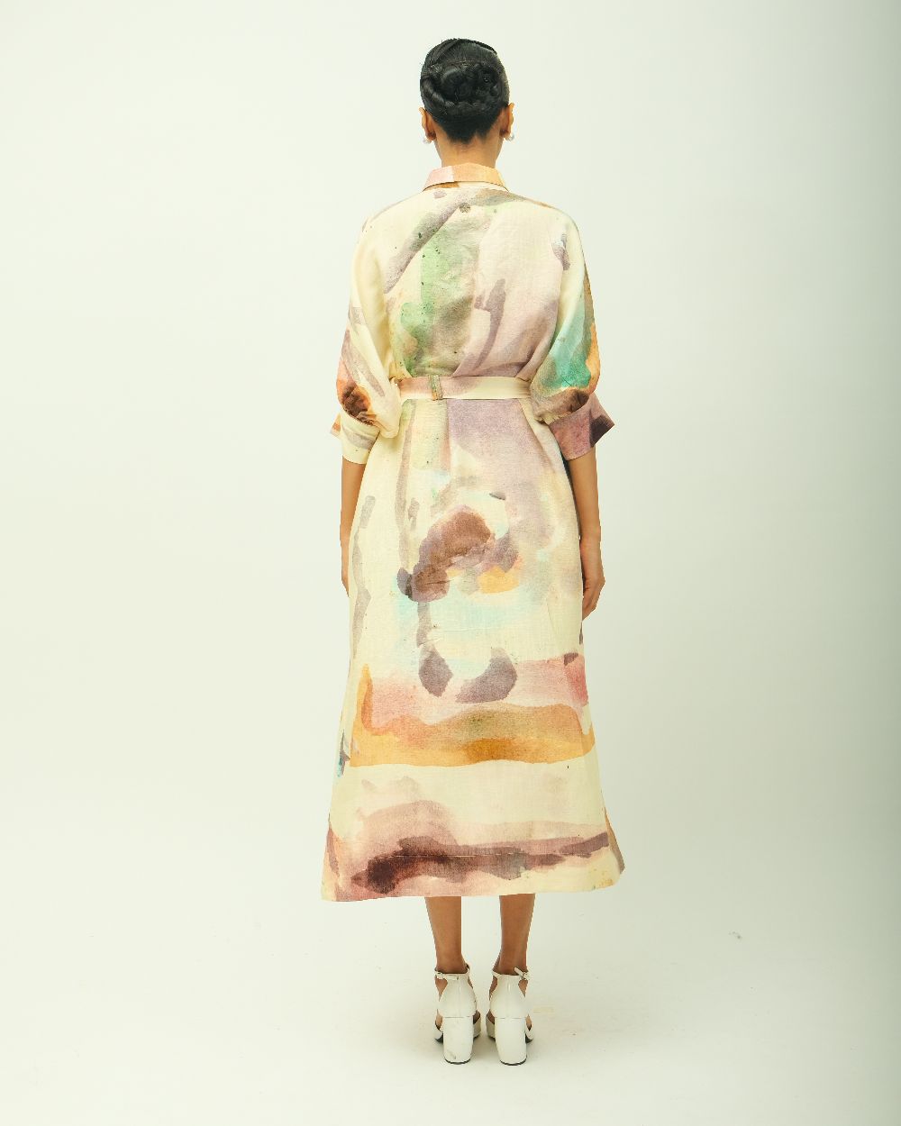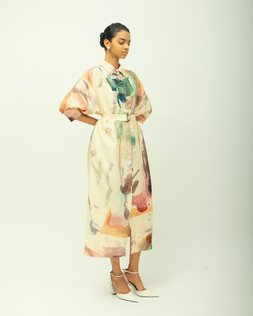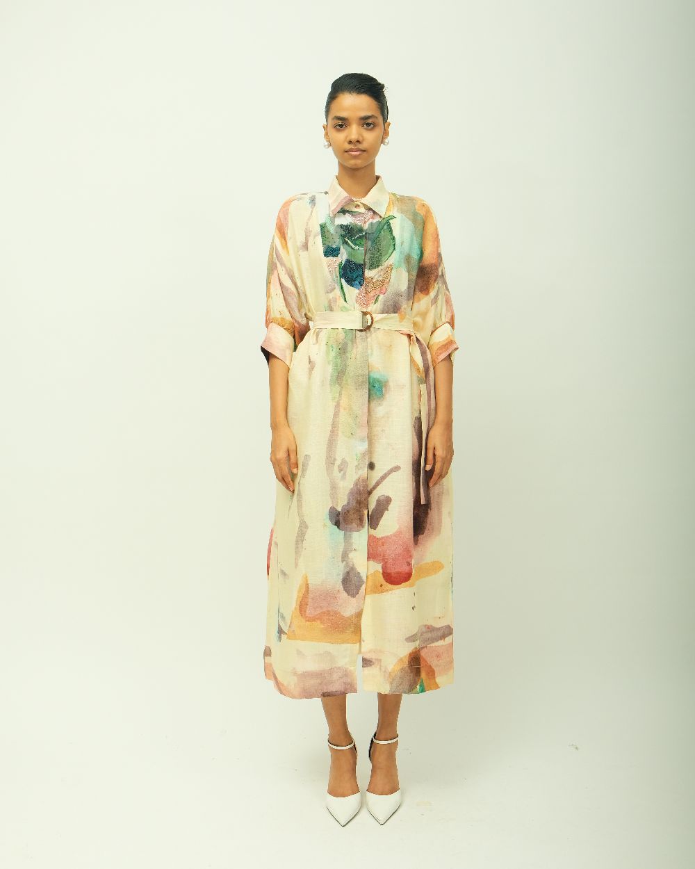 Anti-Fit Dress, asymmetrical yoke, bead detailing, shirt collar, full concealed placket, three-fourth sleeves, side pockets, hand-painted abstract expressionist digitally transferred print, Variations in color, texture, and weave are inherent due to the hand-made nature of the garment- Single piece. Garment Length - 48"