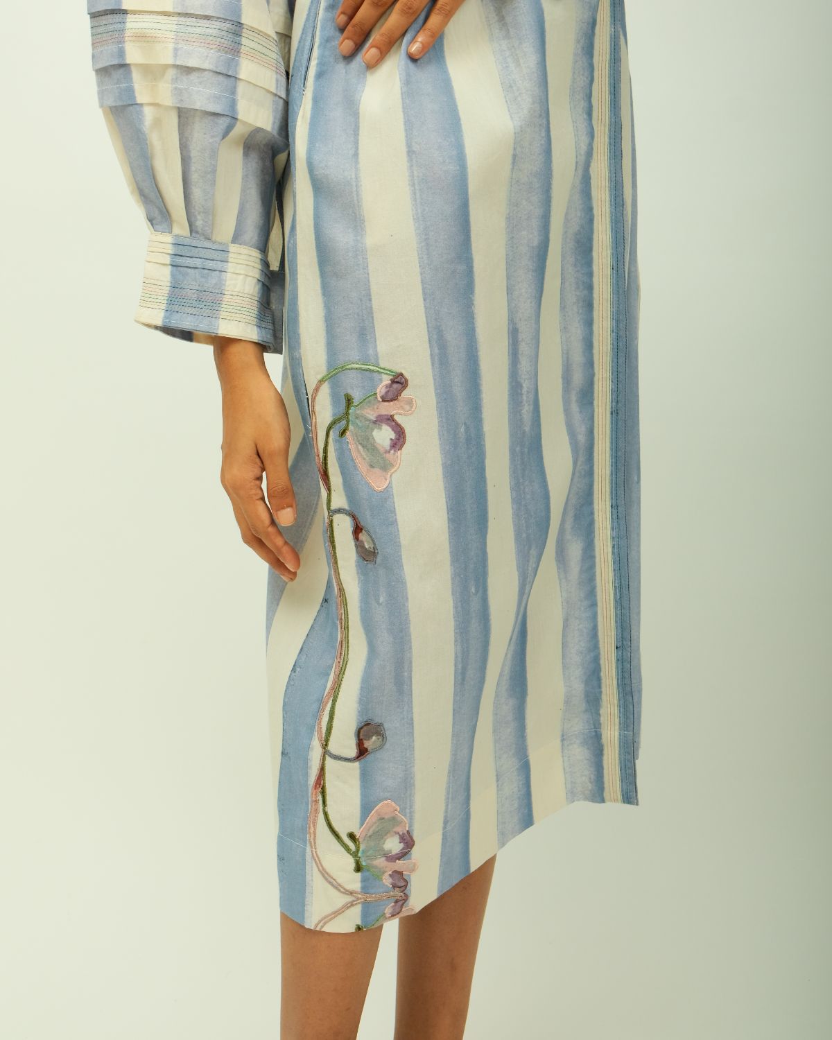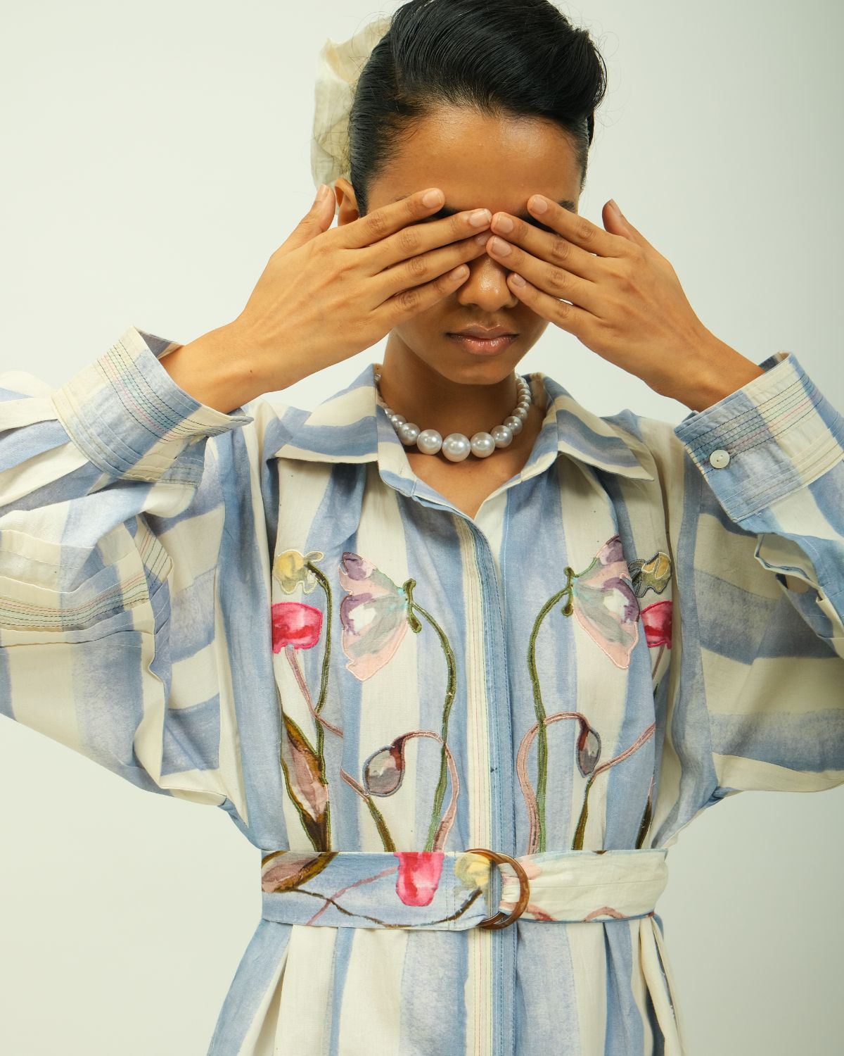 Anti-fit shirt dress featuring a classic shirt collar and long sleeves with stitch detailing. Designed with a concealed placket enhanced by vertical stitch lines and functional side pockets. The garment showcases a digitally transferred hand-painted abstract floral print, accented with floral appliqué work. Print placement may vary—each piece is one of a kind. Garment Length - 48"