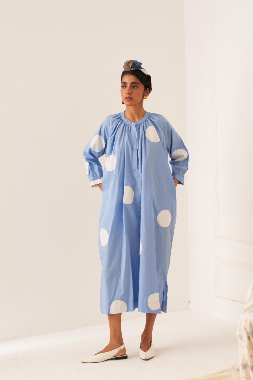 Anti-fit Polka Appliqué Dress with Mandarin Collar, Half Placket, and Gathered Neck & Sleeves, Featuring Vintage Coin Detailing on the Back. Model is wearing size M.