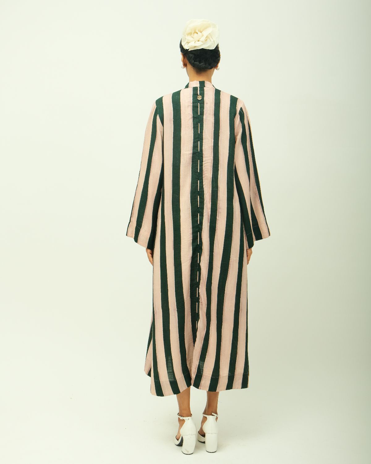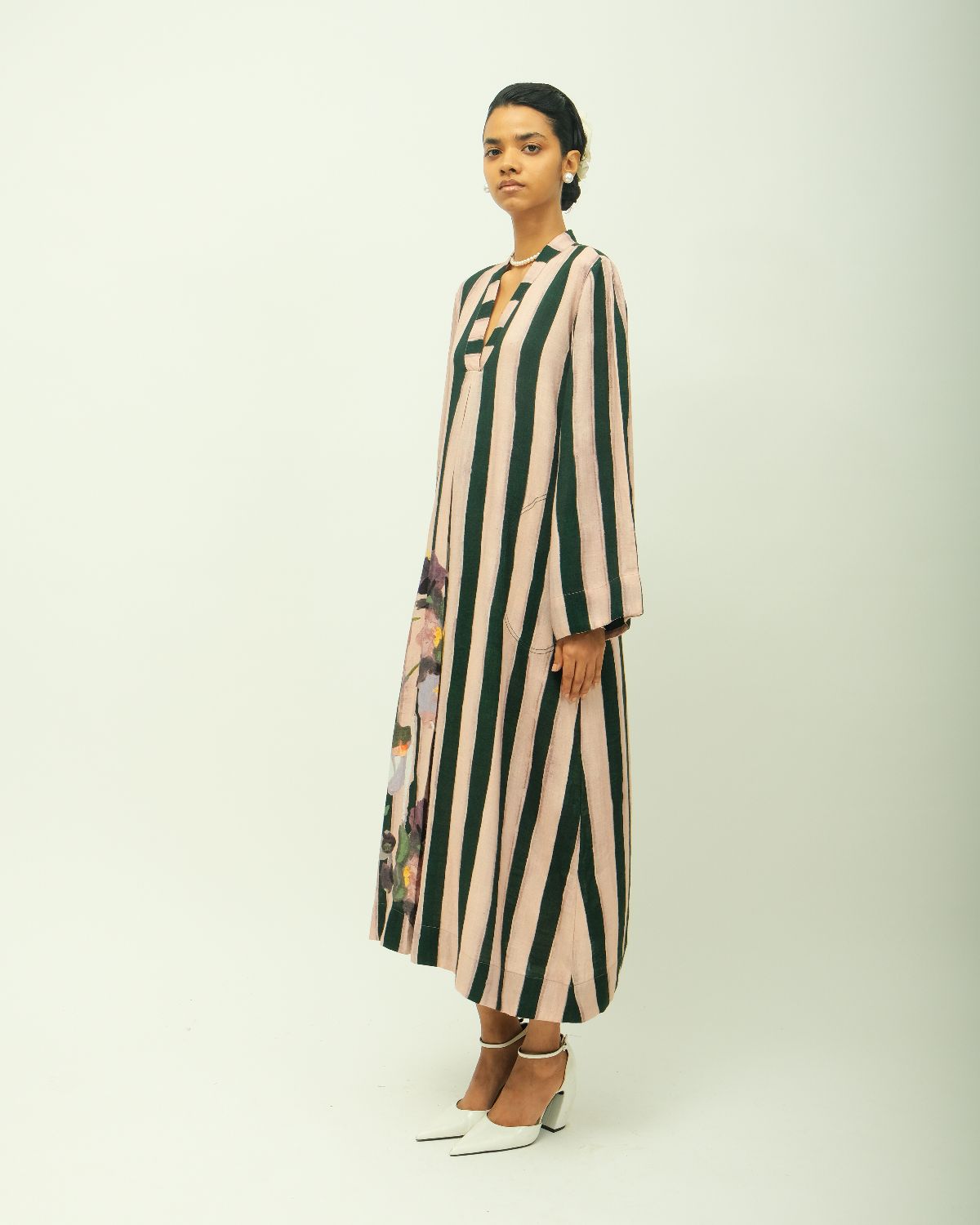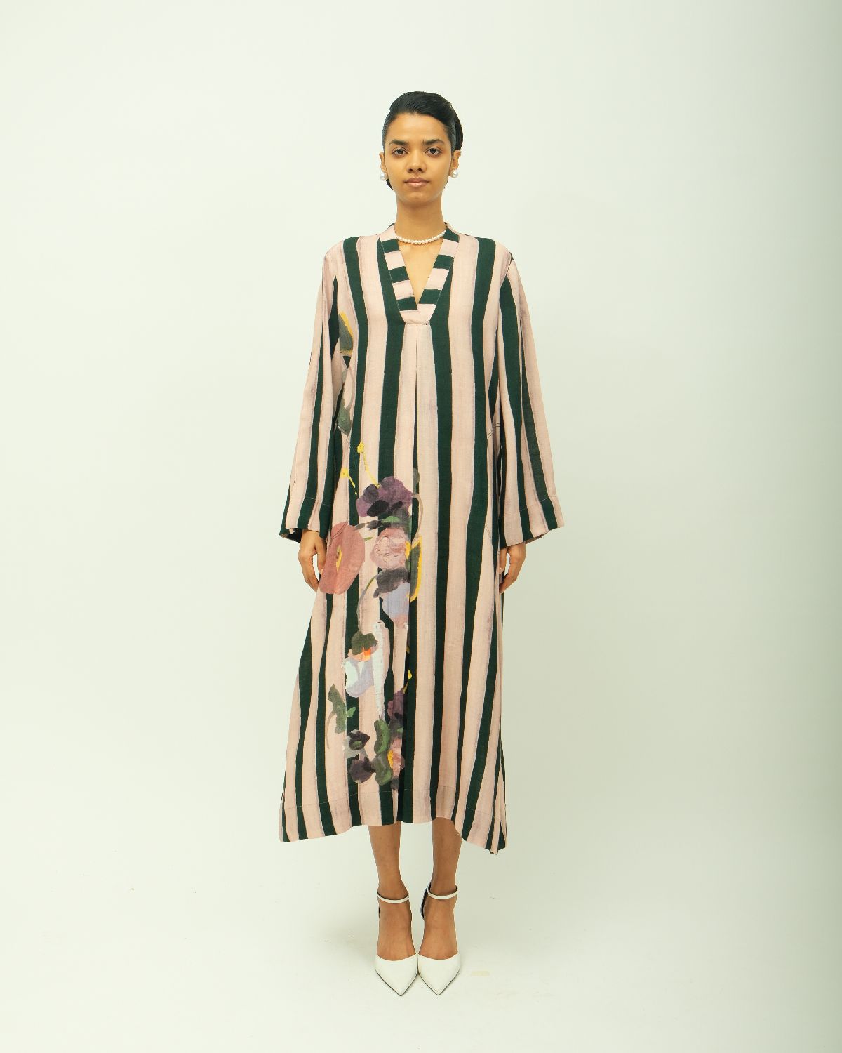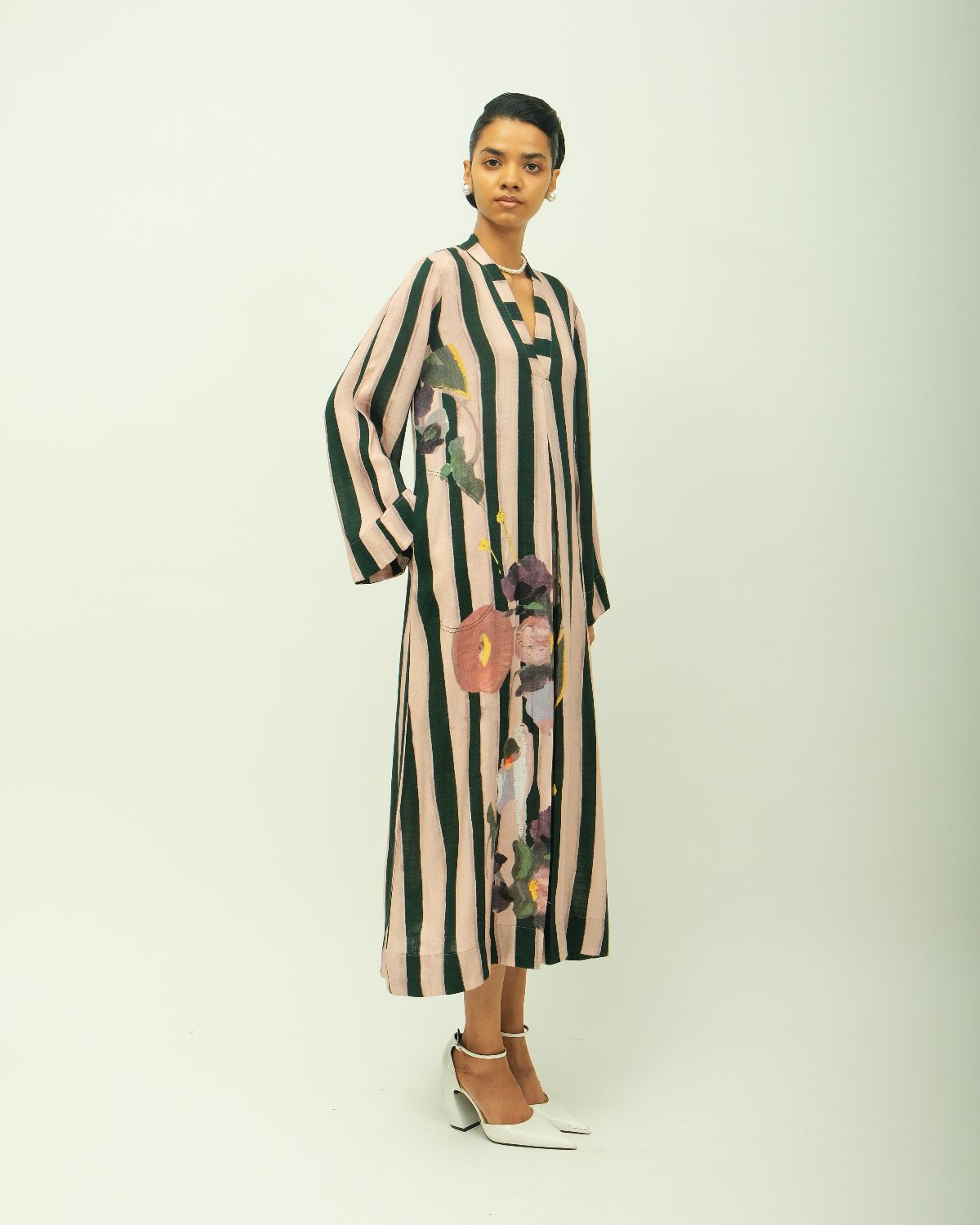 Relaxed anti-fit dress featuring a soft V-neckline and full-length sleeves, accentuated with delicate bead detailing. Adorned with a hand-painted abstract expressionist print, digitally transferred for precision and vibrancy. Finished with topstitched side pockets for added utility. Print placement may vary—each piece is uniquely crafted. Garment Length - 48"