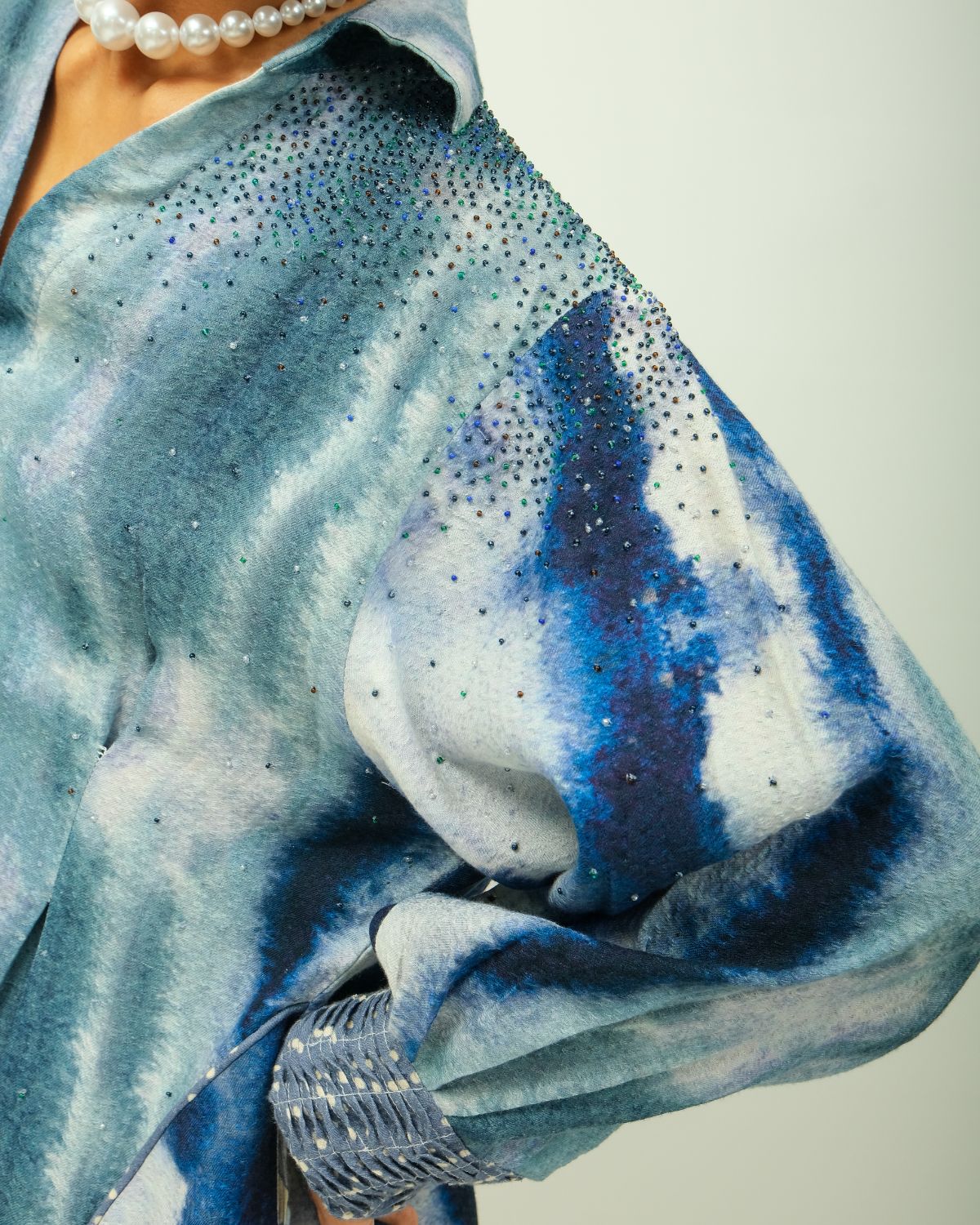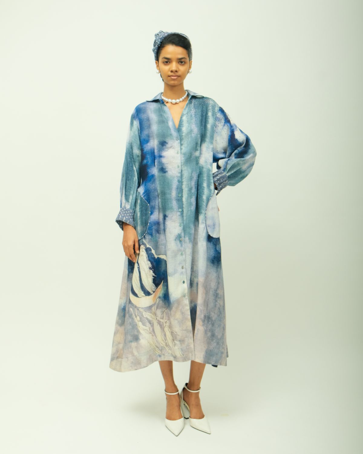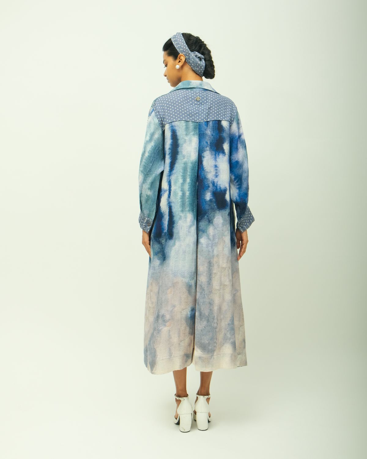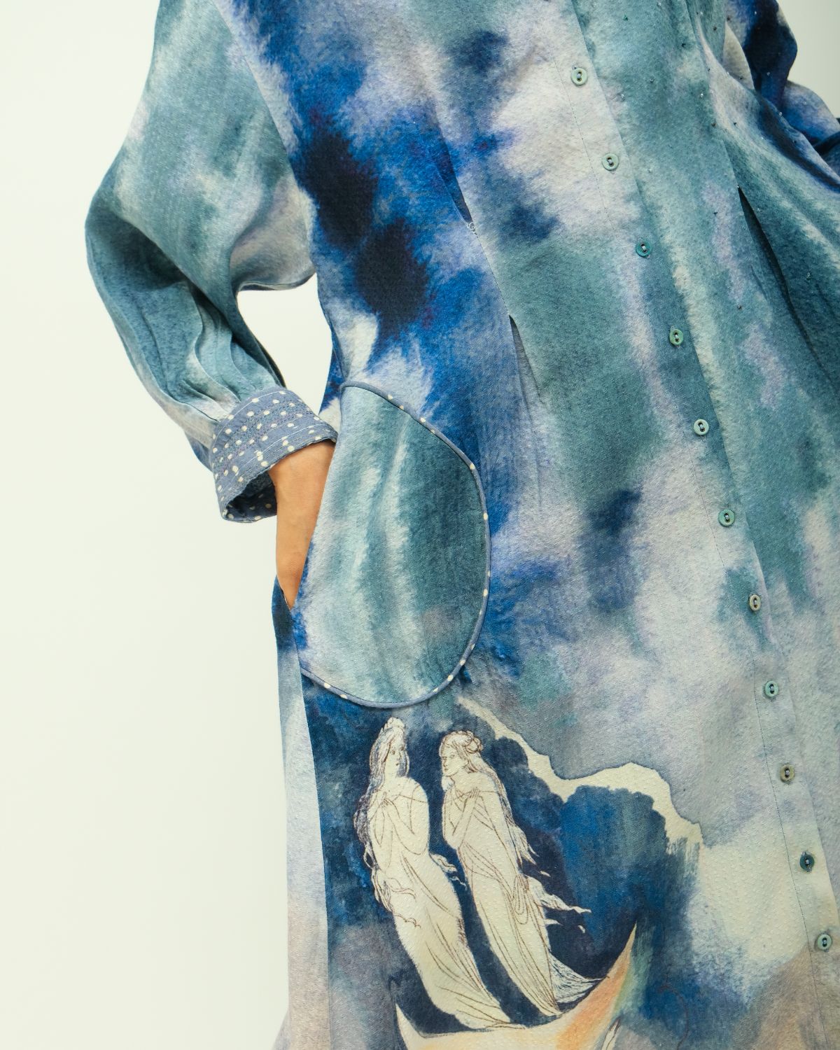 Anti fit, shirt collar, full concealed placket, long sleeves, wave tucks on cuff, cording, hand-painted abstract expressionist digitally transferred print, bead detailing, side pockets. Print placement may vary- single piece. Garment Length - 48"