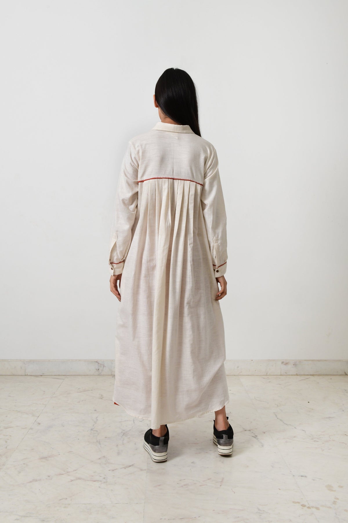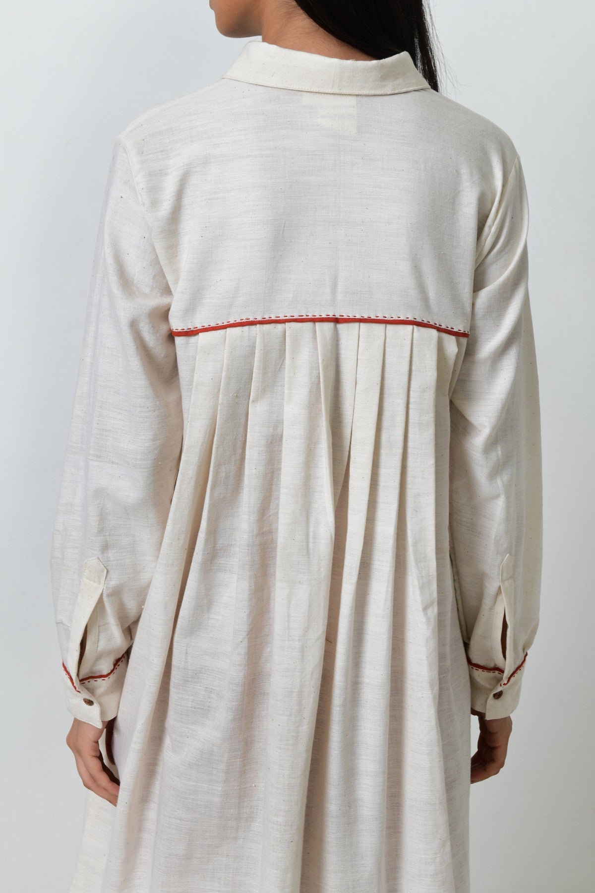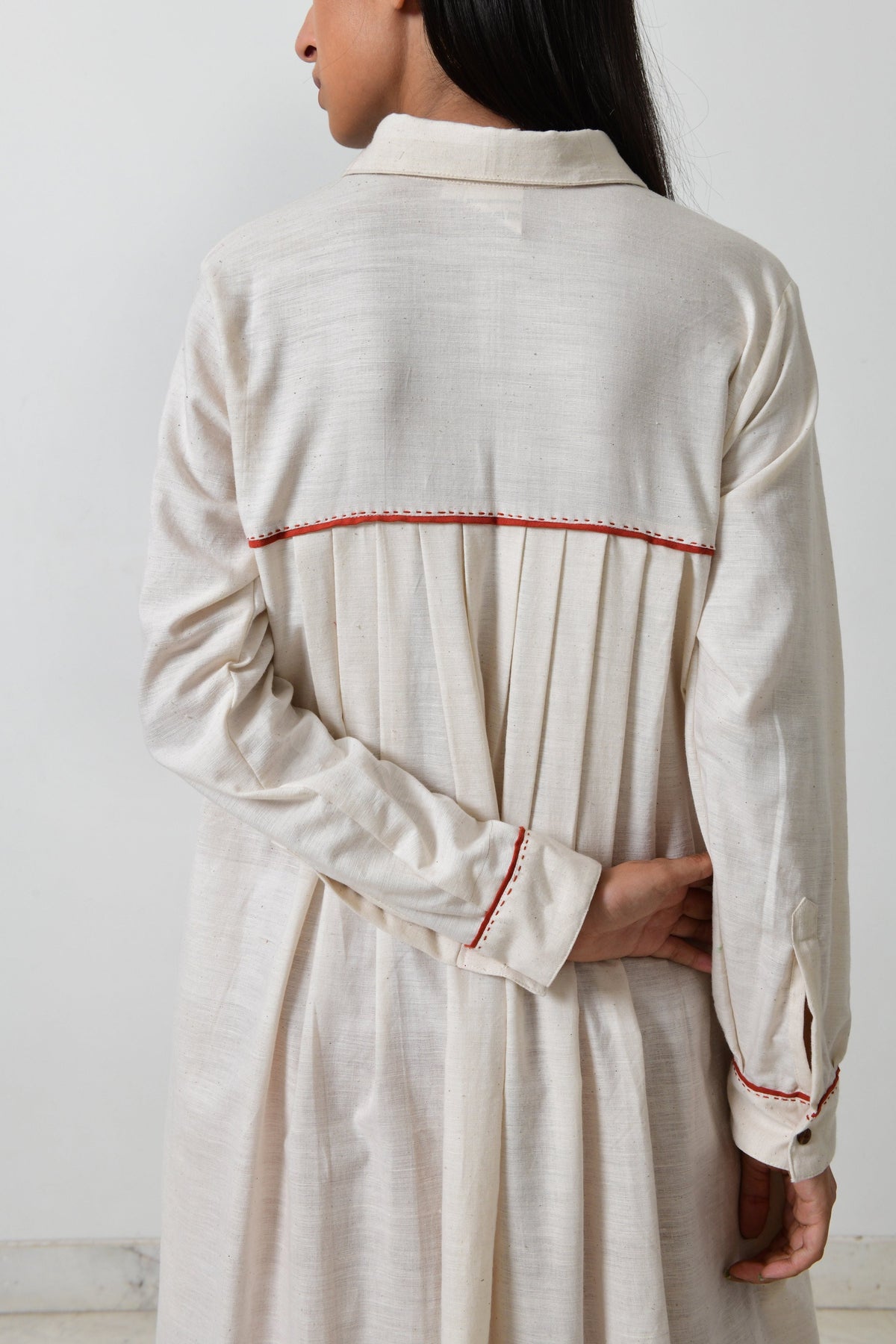 This long kurta features pockets, full sleeves with long pleats at the back with wooden buttons in front. This kurta is made in fine khadi with contrasting piping.