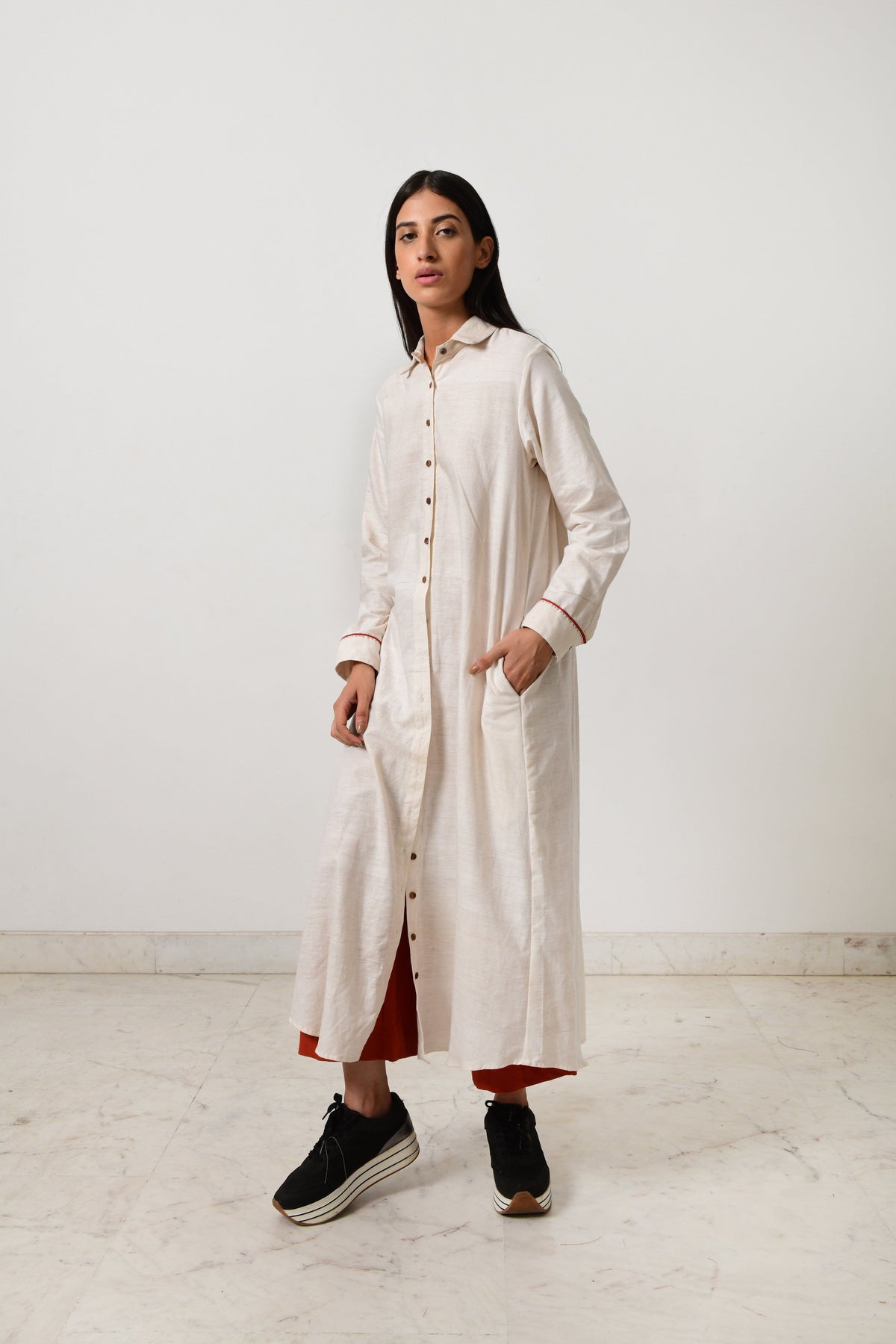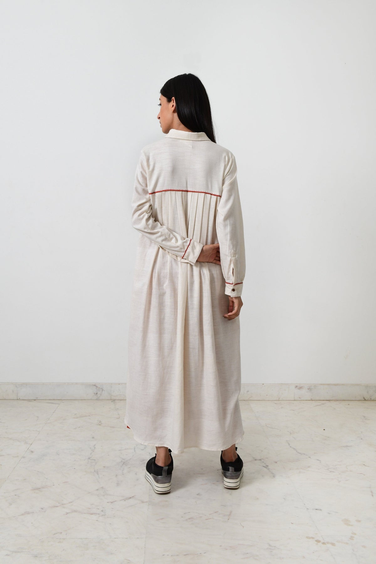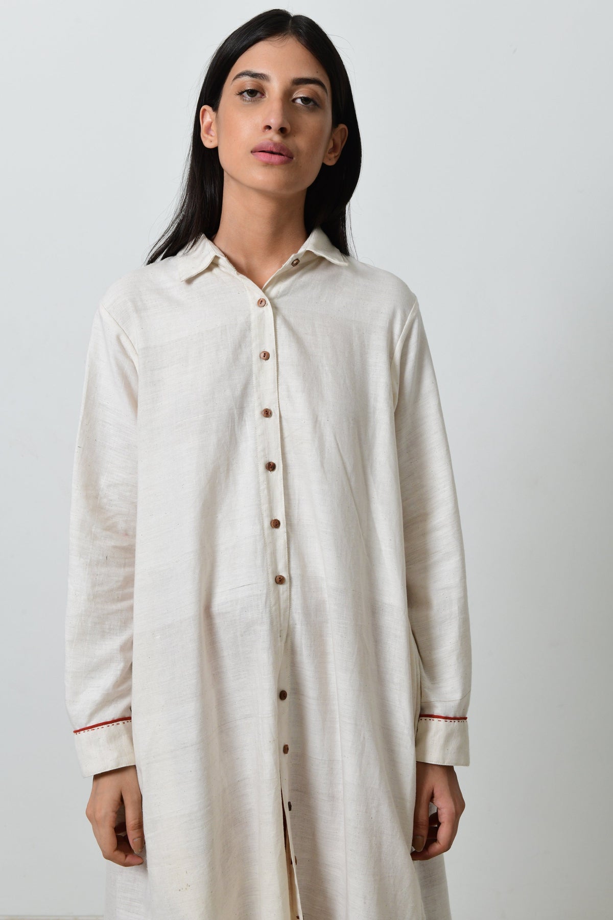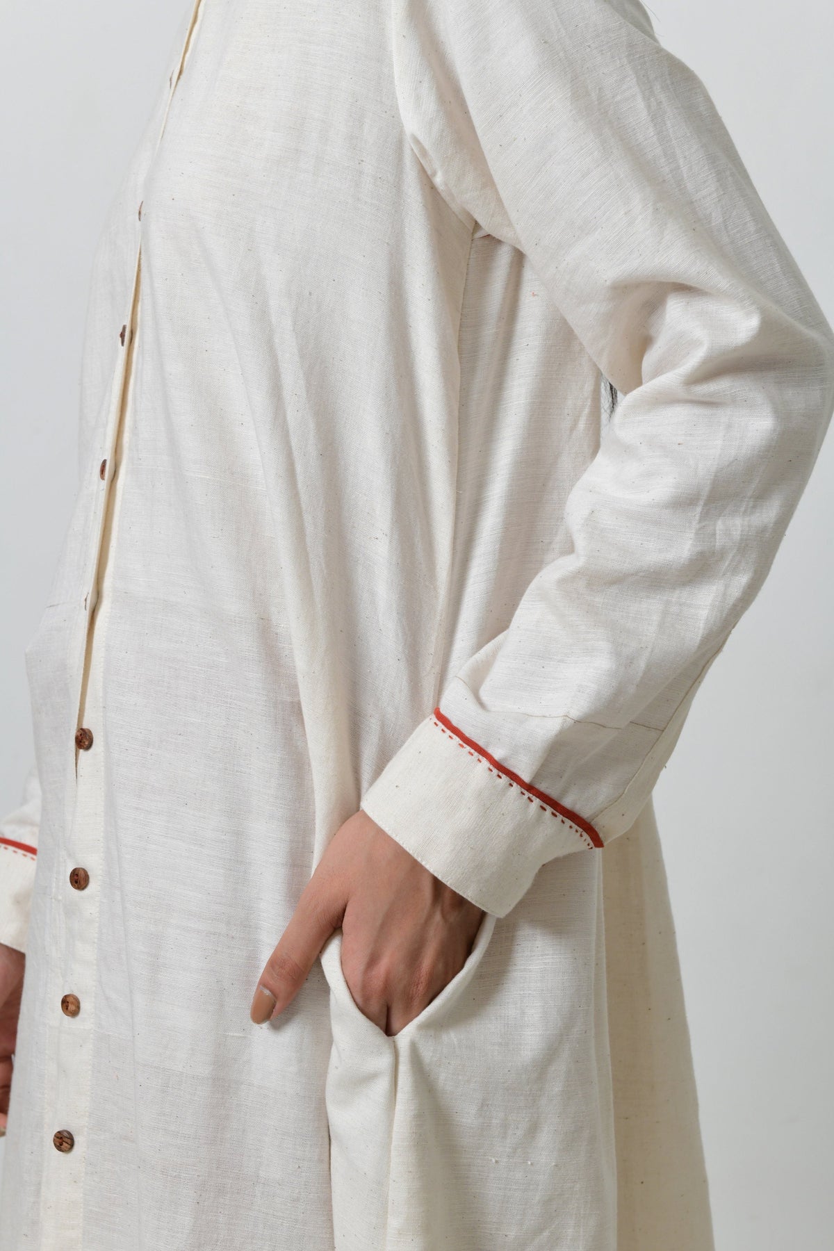 This long kurta features pockets, full sleeves with long pleats at the back with wooden buttons in front. This kurta is made in fine khadi with contrasting piping.