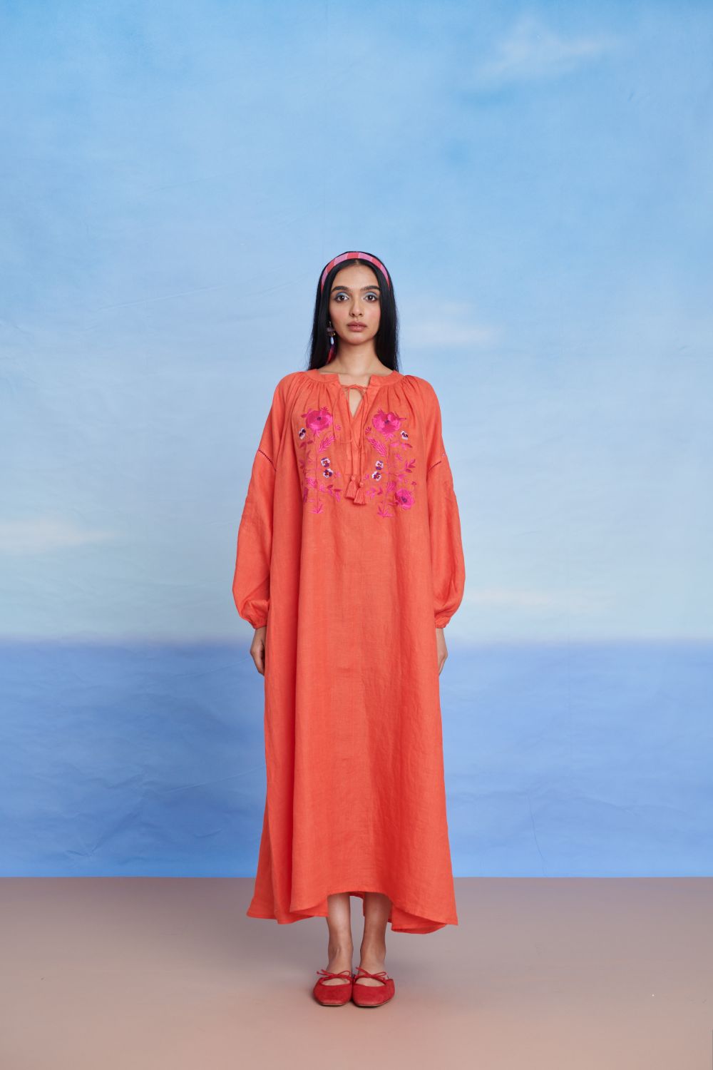 An ode to ease and embroidery, this puff-sleeve dress is cut from 100% pure linen and finished with vibrant floral threadwork across the chest and sleeves. The silhouette is relaxed yet intentional — with gathered cuffs, a soft keyhole neckline, and tassel ties for added movement. Designed for sun-drenched mornings and late summer evenings, it brings together craftsmanship, colour, and comfort in one effortless piece.