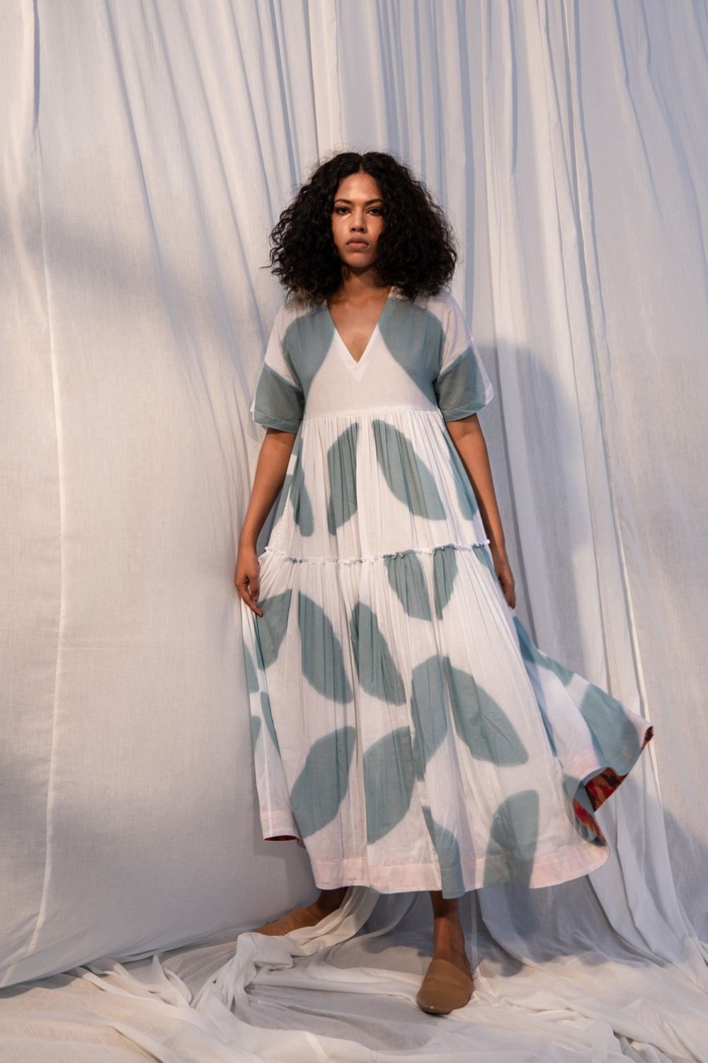 Come away with me so we can be castaways in togetherness. A tiered midi shibori dyed dress with half sleeves, side pockets and a v-neckline in seafoam green and white resembling washed up seaweed at the shore. It is not lined.