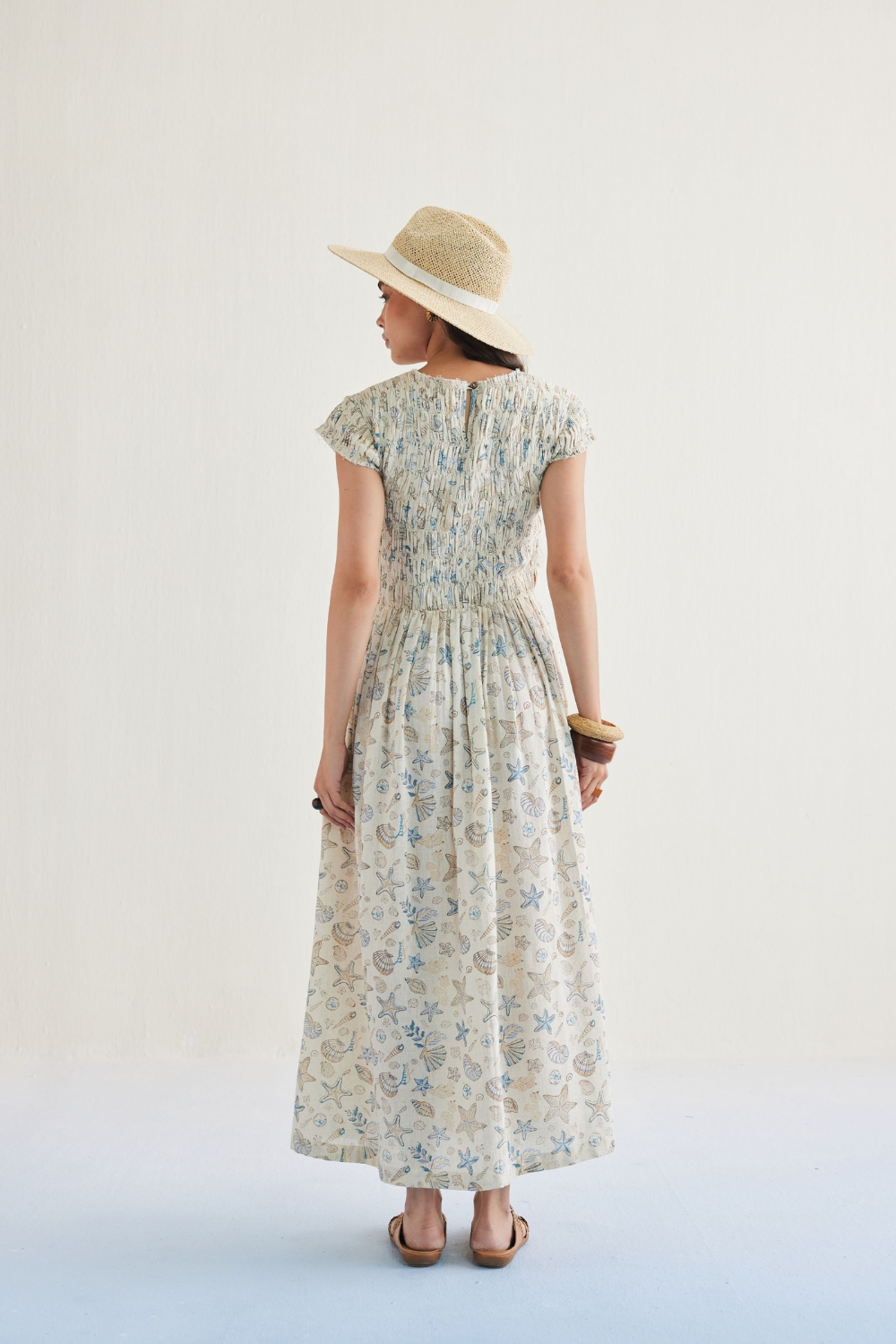 Fitted, short sleeve, maxi dress that's smocked and fitted around the bodice with an a-line skirt, crafted in azo-free dyed handspun and handwoven Kala cotton fabric, hand block printed with our signature ocean life inspired motif using azo-free dyes.
