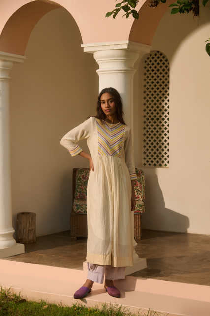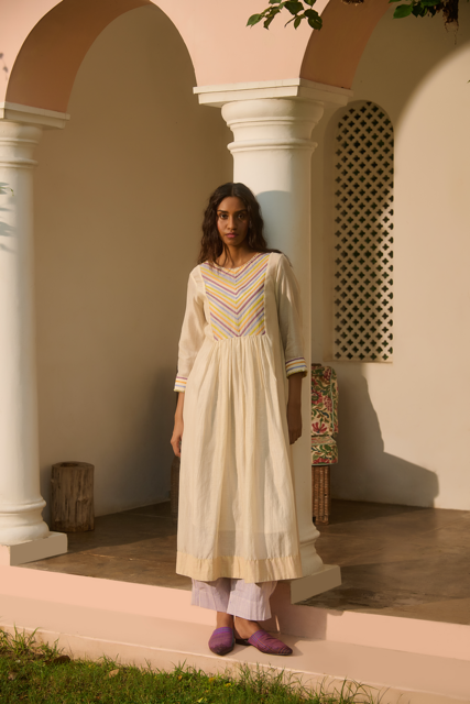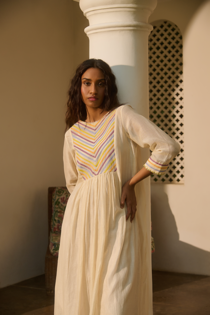 Striped Chanderi Self Dress Along with multicolor piping detail and gathers at from and back embelished with beadwork fringing.. Comes with a 100% Cotton Slip.